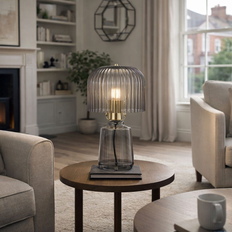 Introduce colour, sculptural texture and softly diffused ambience to your interiors with our collection of coloured ribbed glass table lamps, featuring smooth coloured glass bases, ribbed dome-shaped glass shades and refined gold lampholder detailing. Designed to bring a bold yet balanced statement to modern UK homes, these retro eclectic table lamps combine eye-catching design with timeless elegance.
