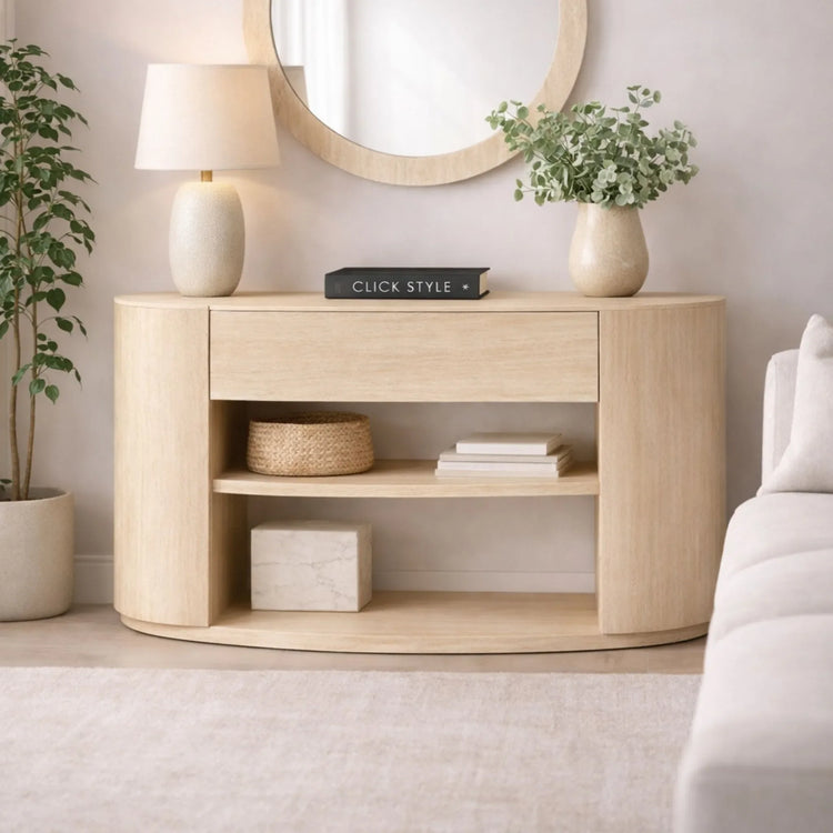 Designed to balance display, storage and everyday practicality, the collection combines decorative surfaces with useful concealed storage. Sideboards offer generous cupboard space for tableware, glassware and household essentials, while console tables provide elegant styling surfaces ideal for hallways and living rooms. The compact side table doubles as a bedside cabinet or occasional table, offering both drawer and cupboard storage within a sculptural cylindrical design. Completing the collection, the coordinating round wall mirror helps reflect light and enhances the soft architectural lines of the furniture.