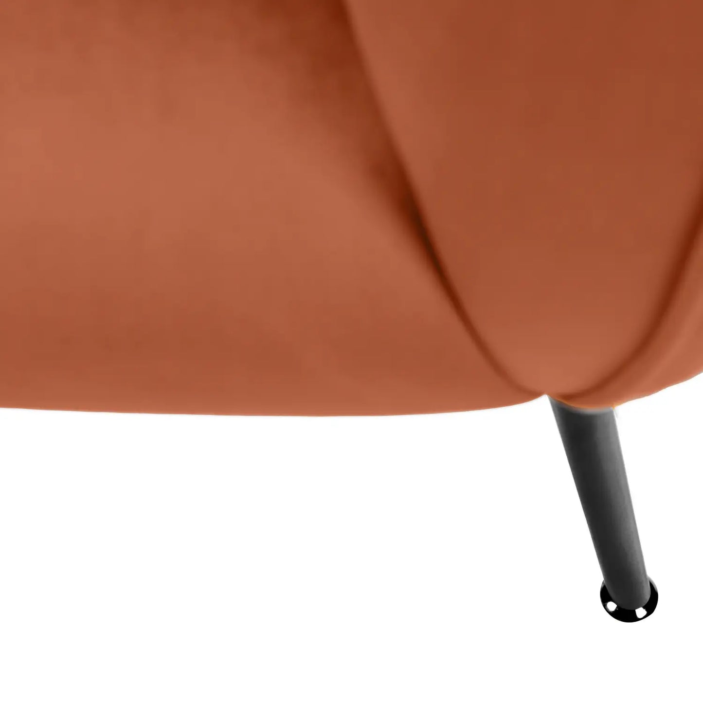 The Aalya orange brown velvet armchair is sophisticated with its clever design featuring interchangeable legs. This smart feature allows you to switch between gold and black metal legs to suit your decor or customise the orange brown accent chair. The ability to switch the legs offers a practical and stylish solution. The gold legs add a touch of glamour, while the black legs provide a sleek, contemporary look that blends with modern decor. Switching the legs is simple, allowing you to easily change the armchairs' appearance to complement your interiors.