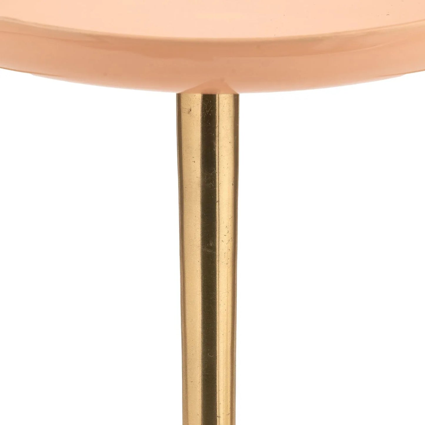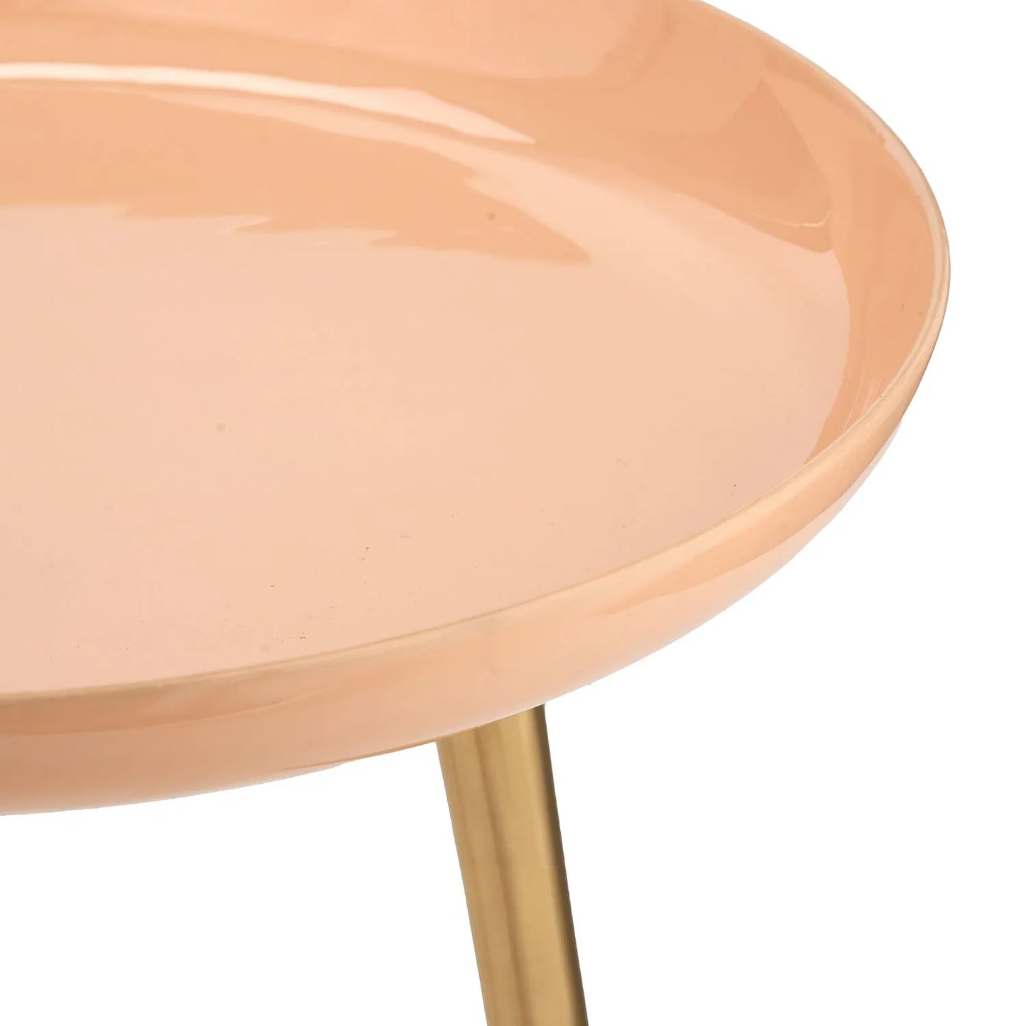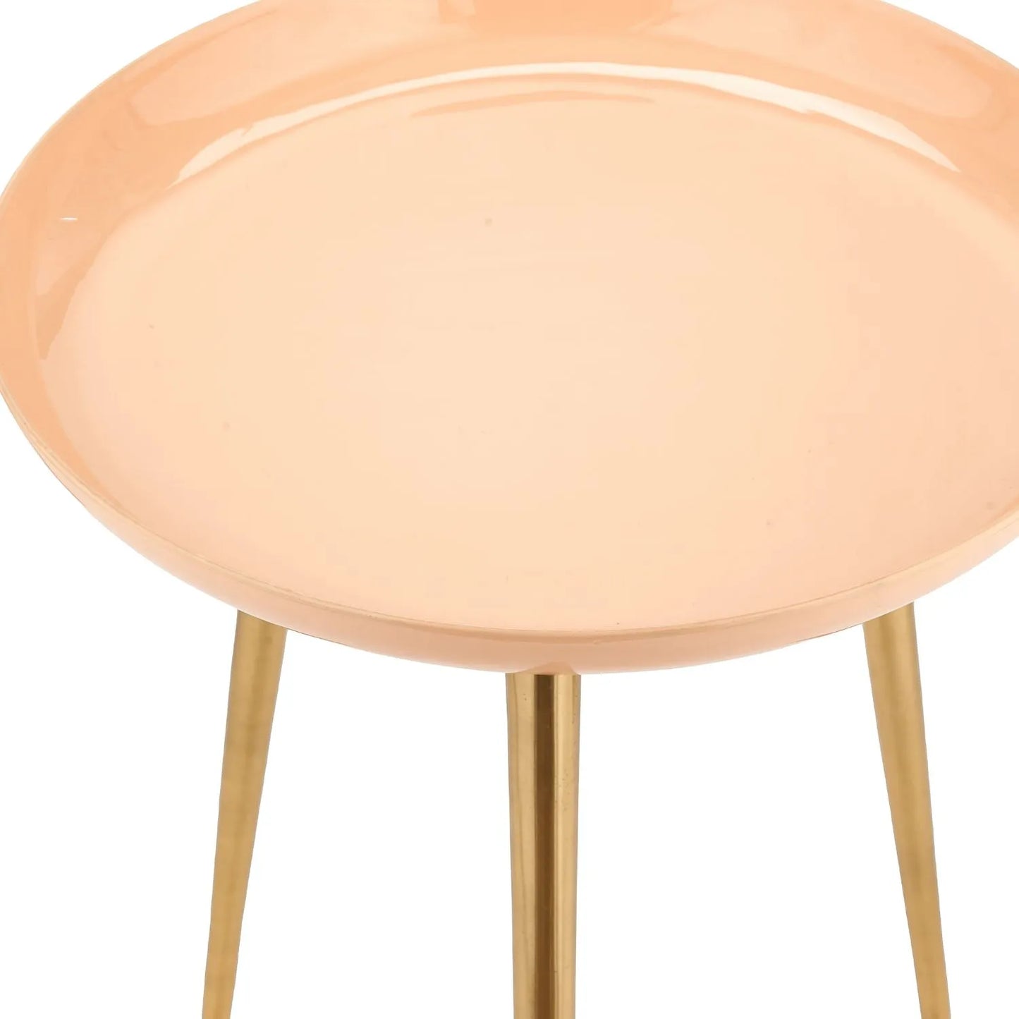 The lipped enamelled tabletop provides both form and function, offering a smooth and durable surface, ideal for holding drinks, books, or decorative accessories. The three slender gold metal legs create a sturdy tripod base, adding a touch of contemporary luxury while ensuring stability. The contrast between the warm peach tabletop and sleek gold legs enhances its modern aesthetic, making it a stylish yet practical addition to any room.