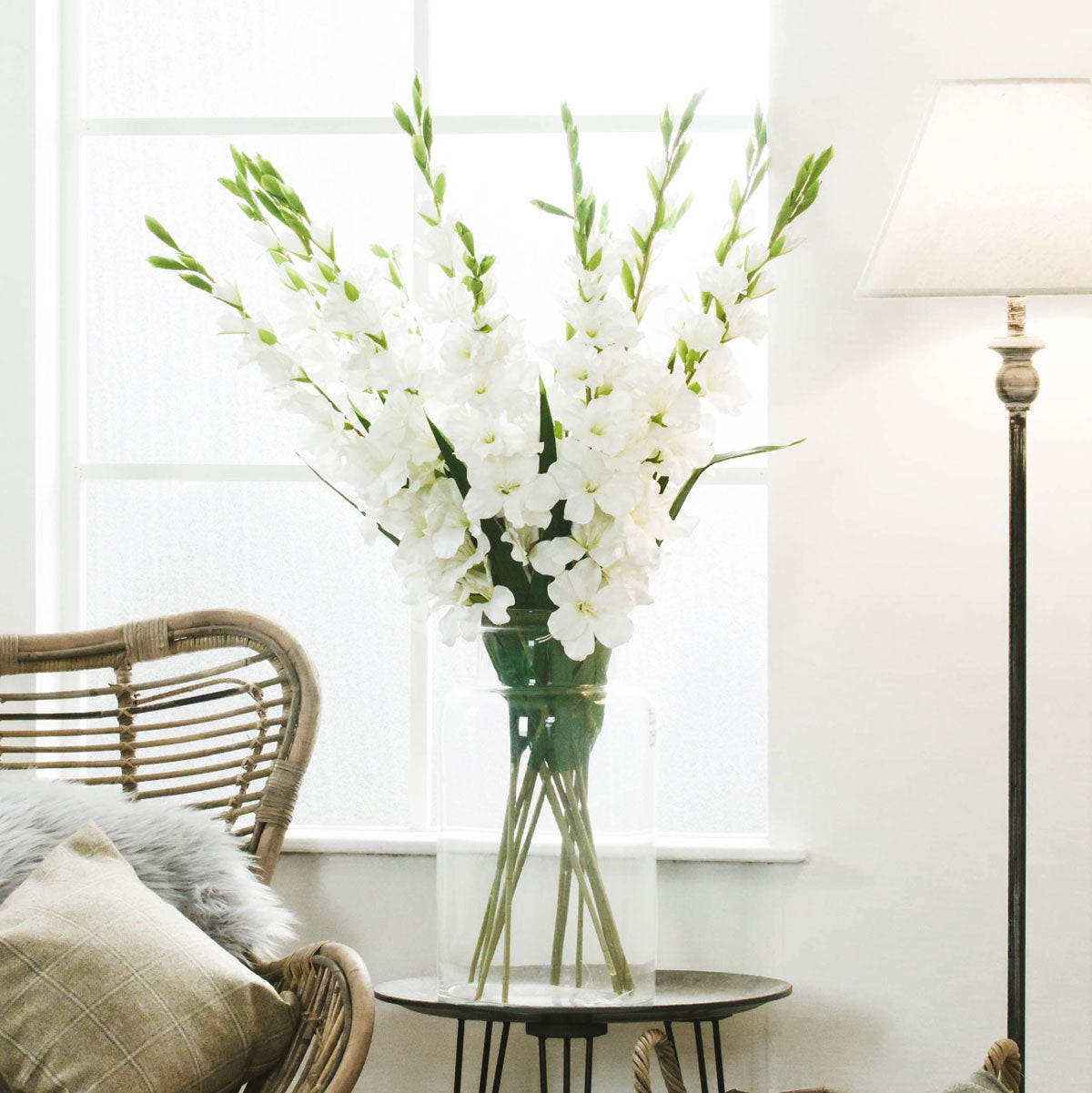 This faux gladiolus has a stem length of 108cm, and a bloom width of 11cm. Selecting the right vase depends on the type of arrangement you're creating. For tall arrangements, your stems and vase should be in a ratio of approximately 1.5:1, so for this stem, you'd need a vase that's approximately 81cm in height. For low arrangements, that ratio is reversed, so you'd need a 162cm tall vase. You can cut your stems to fit a smaller vase, or bend them if your vase is opaque.