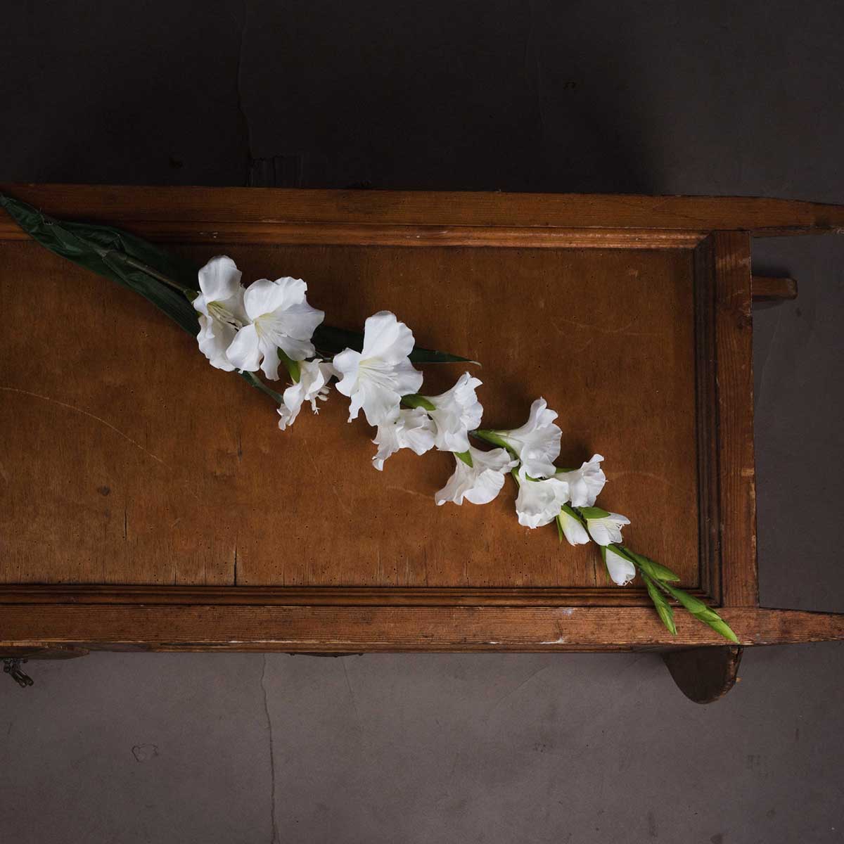 This artificial white gladiolus is a high-quality, realistic faux flower for use in floral arrangements to brighten up your home decor.
