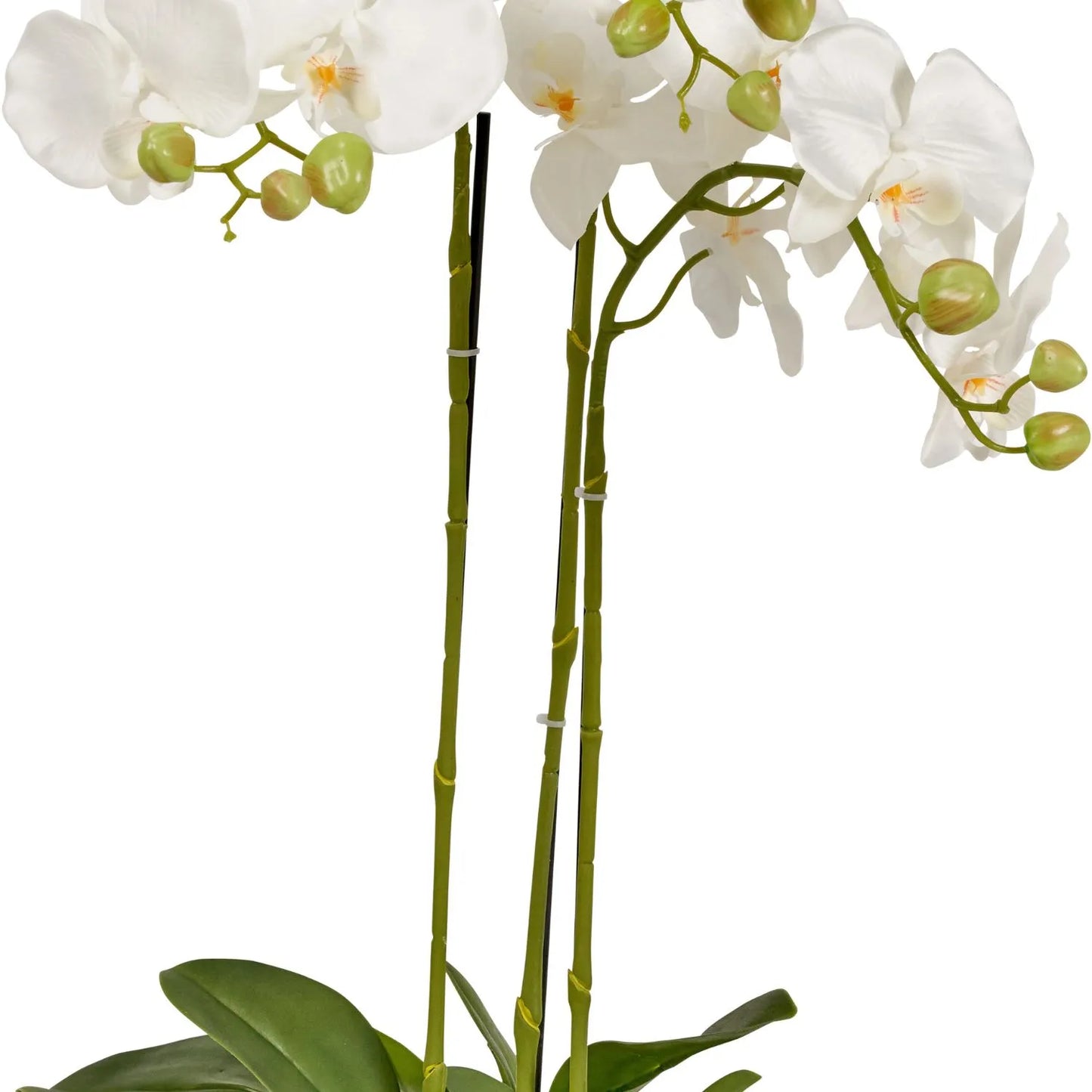 - Lifelike design – Realistic white orchid flowers with delicate buds, vibrant green leaves, and a natural-looking root system.