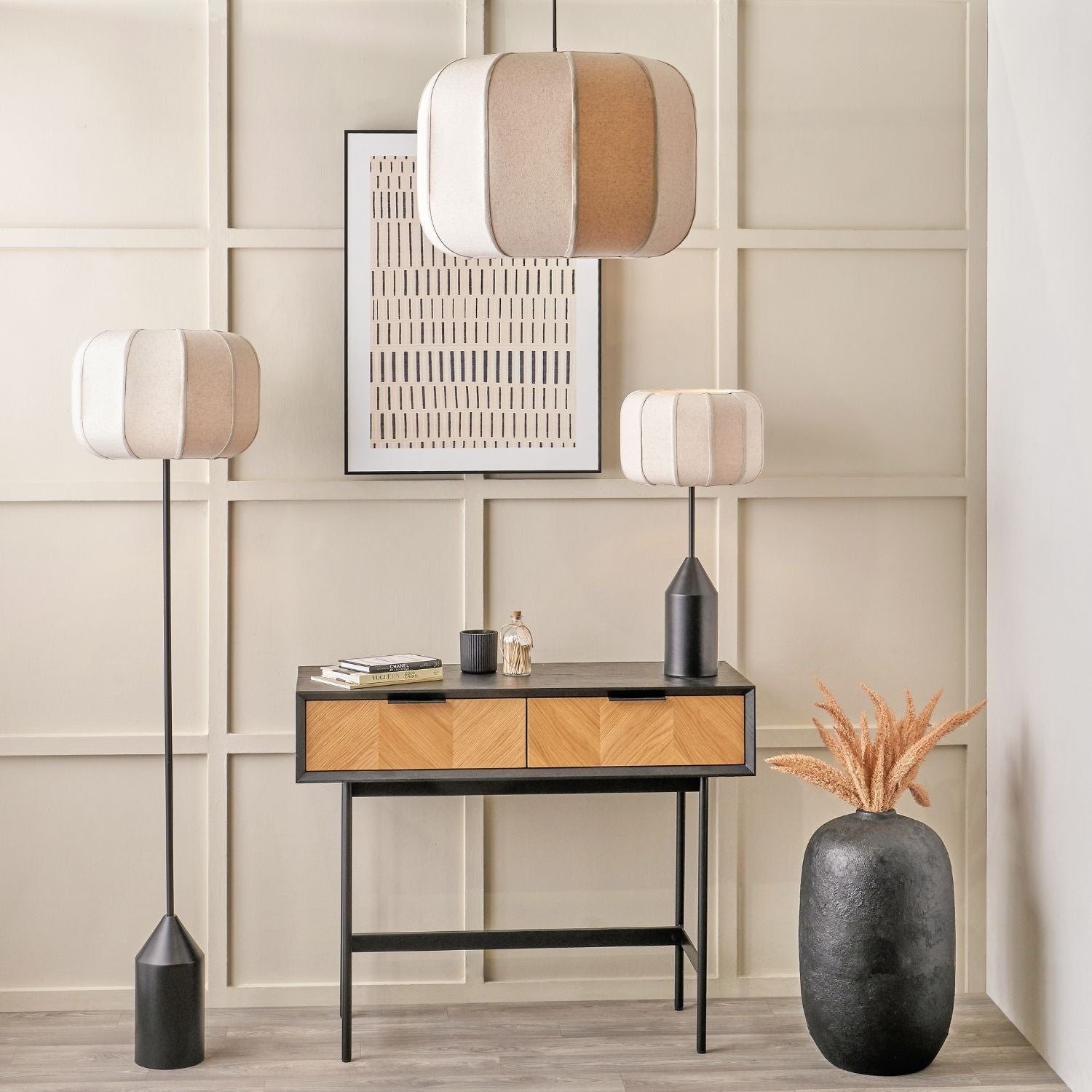 Style this black metal table lamp on its own for a clean, sculptural statement, or pair it with the coordinating pendant and floor lamp to create a cohesive, design-led lighting scheme across bedrooms, living spaces and hallways. Its contrast of structured linen and smooth black metal makes it equally suited to modern, minimalist interiors and warmer, layered schemes.