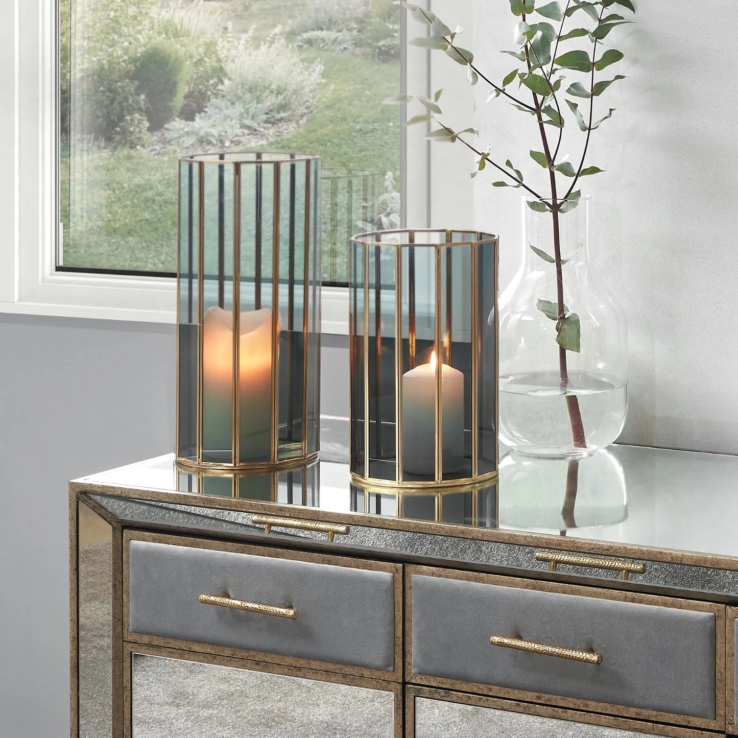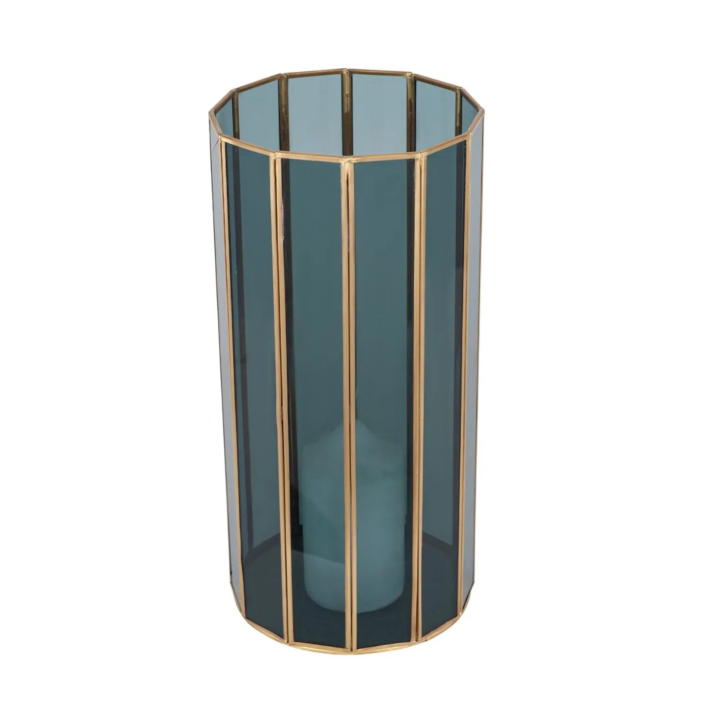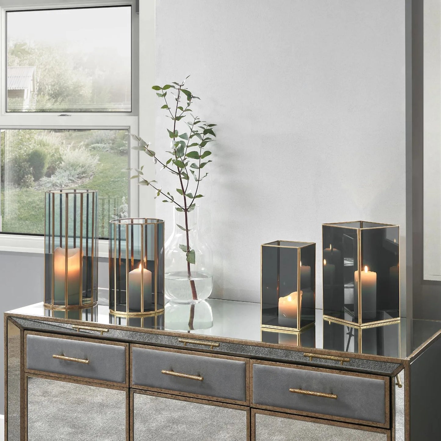 Add a statement of elegance and contemporary design to your home with this brass hurricane lantern featuring 12-sided smoked glass panels. Combining timeless charm with a modern dodecagon shape, this high-quality decorative candle holder is made from brass with a warm metallic finish that perfectly complements the tinted smoked glass. Its geometric design makes it an eye-catching addition to a variety of interior styles, including modern, industrial, and classic decor.