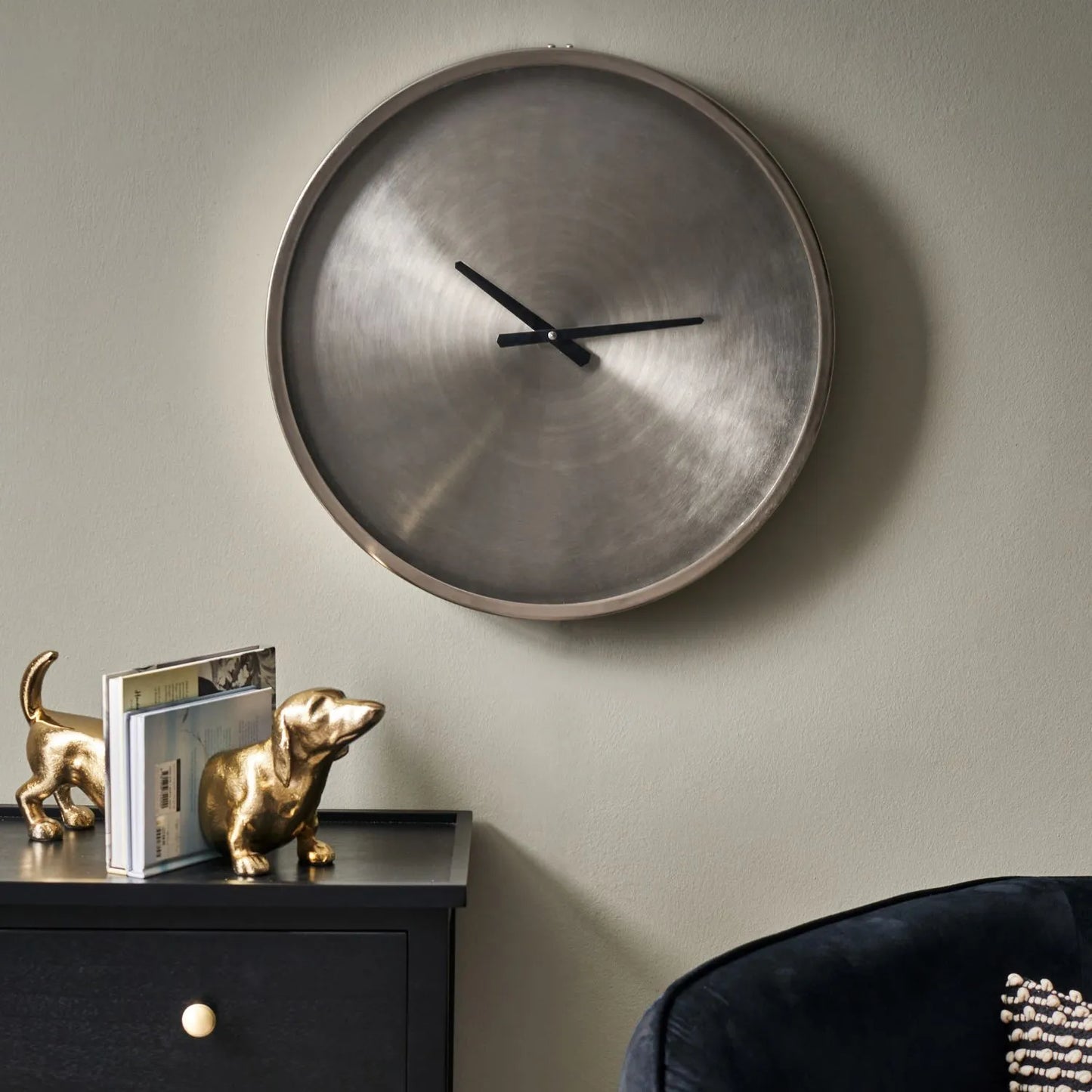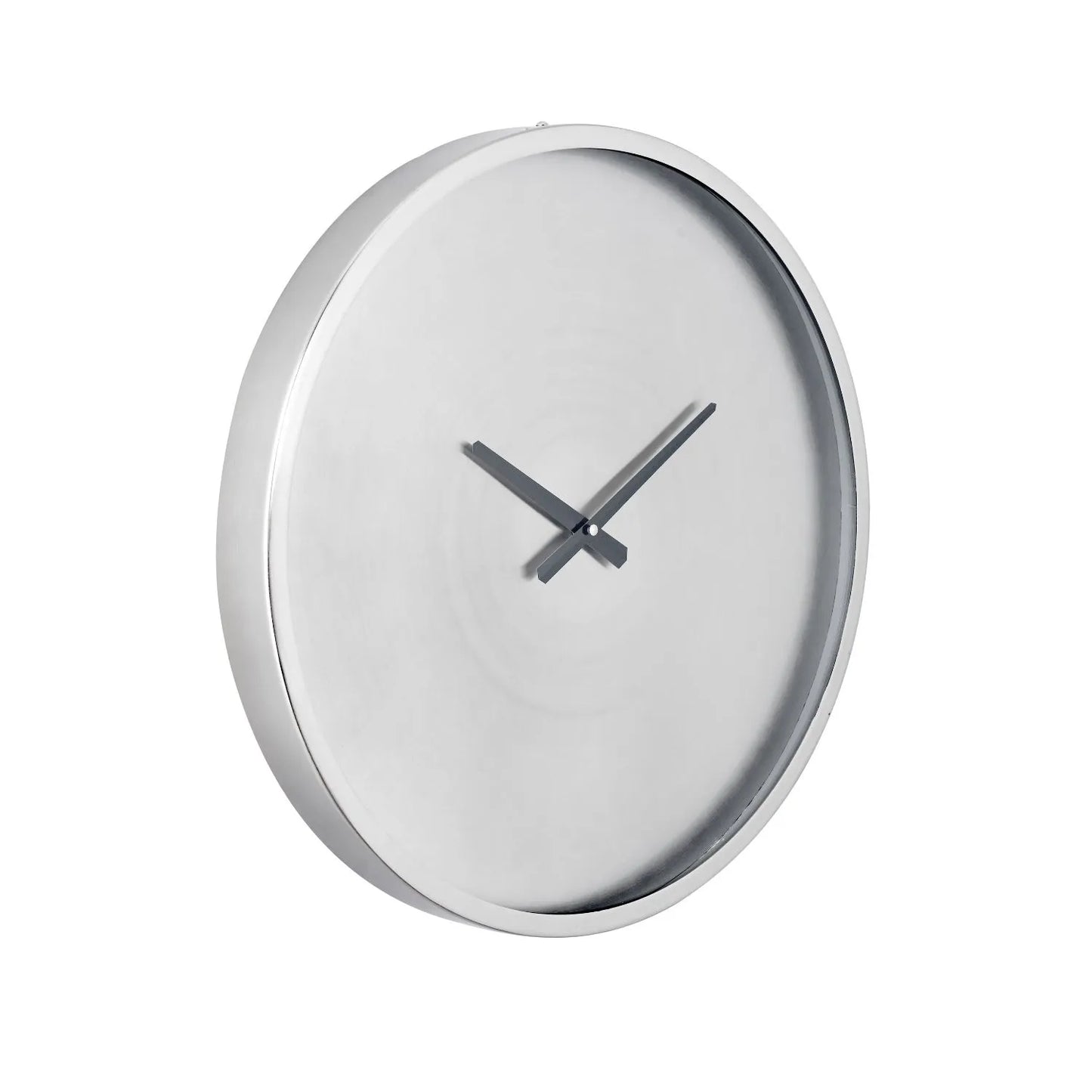Add a sleek, modern touch to your home with this brushed silver round metal wall clock, designed with a minimalist, numberless clock face and contrasting black hands. Measuring 50cm in diameter and 5cm deep, this contemporary wall clock features a brushed nickel finish that adds subtle elegance, making it a versatile and stylish addition to any interior. The uncluttered, marker-free design enhances its minimalist aesthetic while ensuring easy readability.
