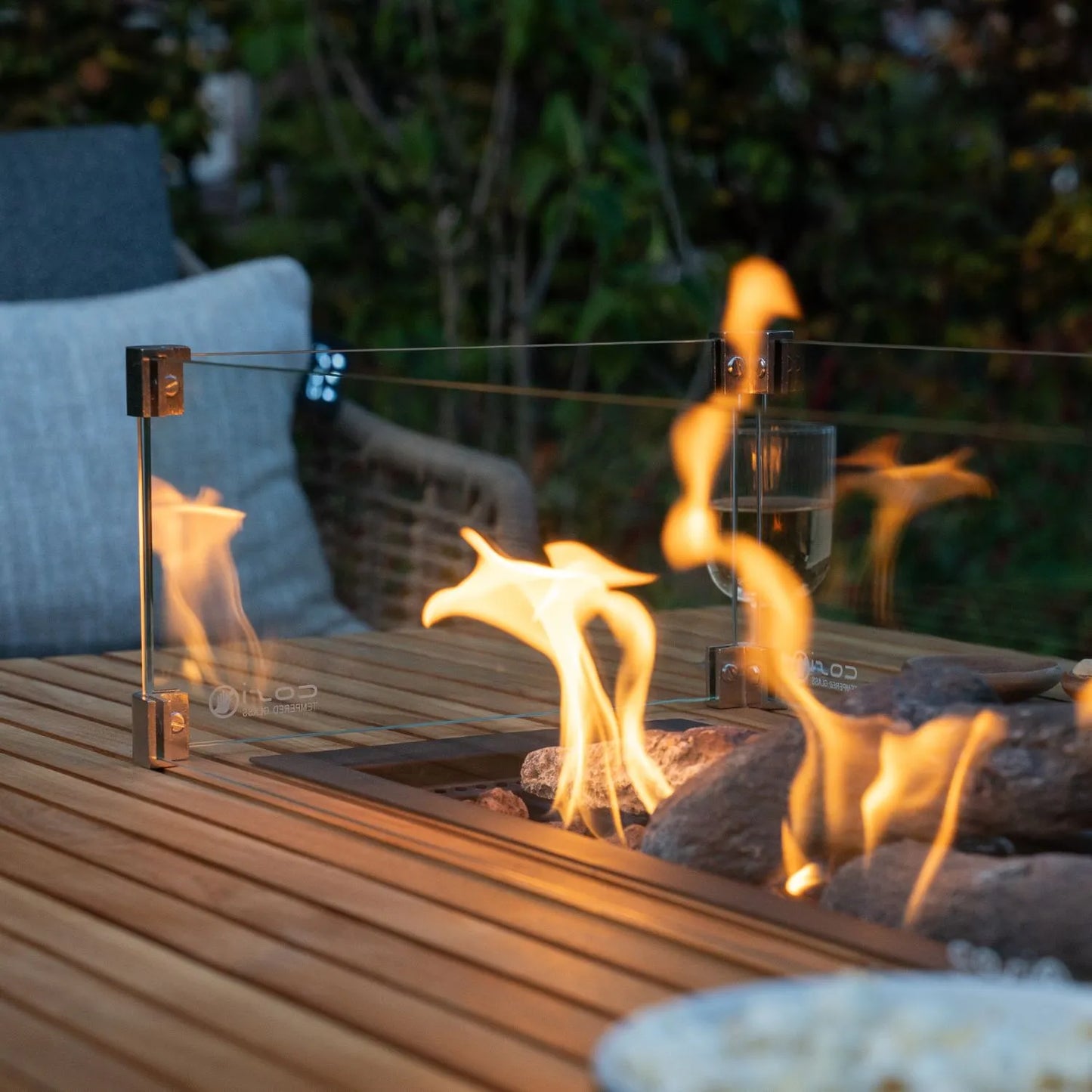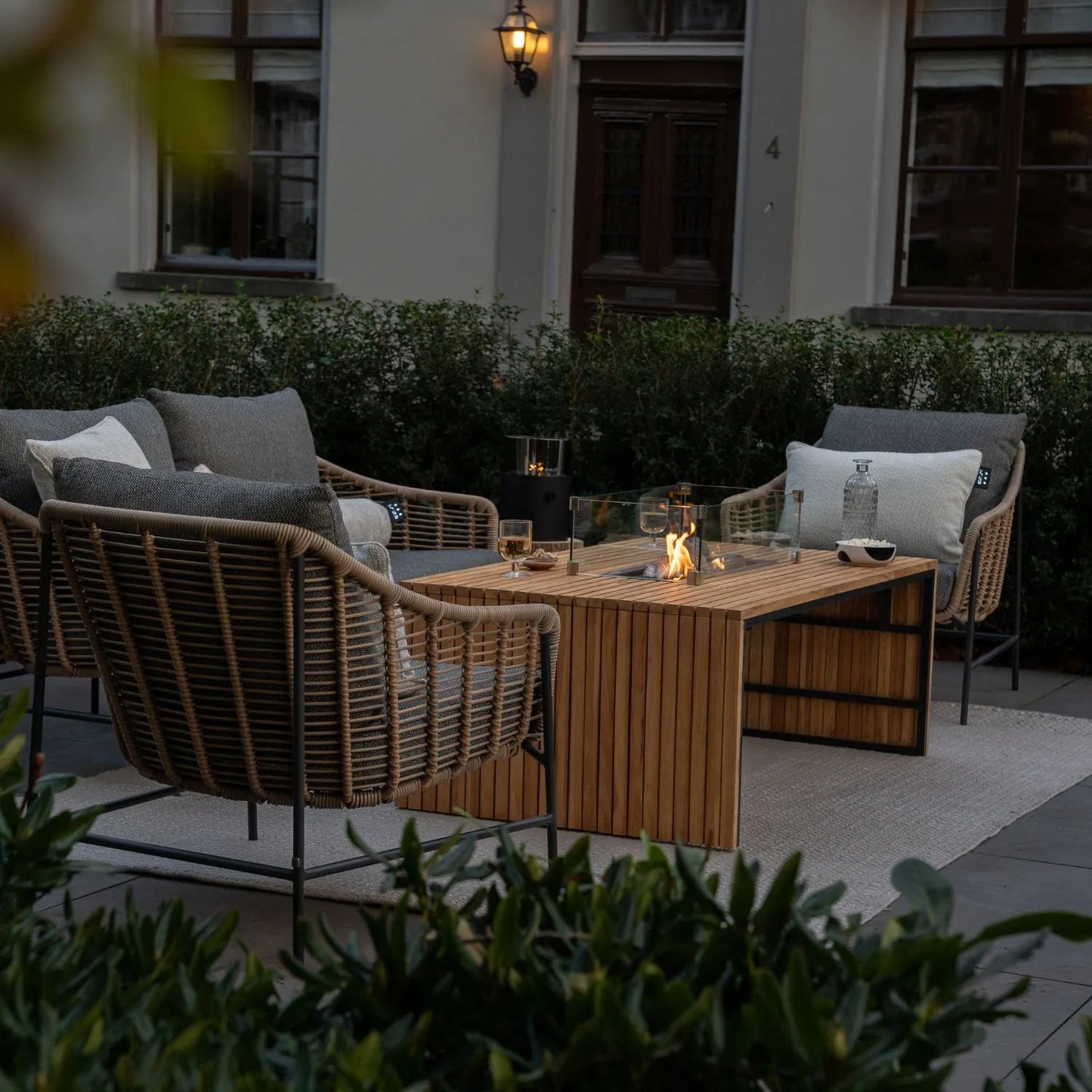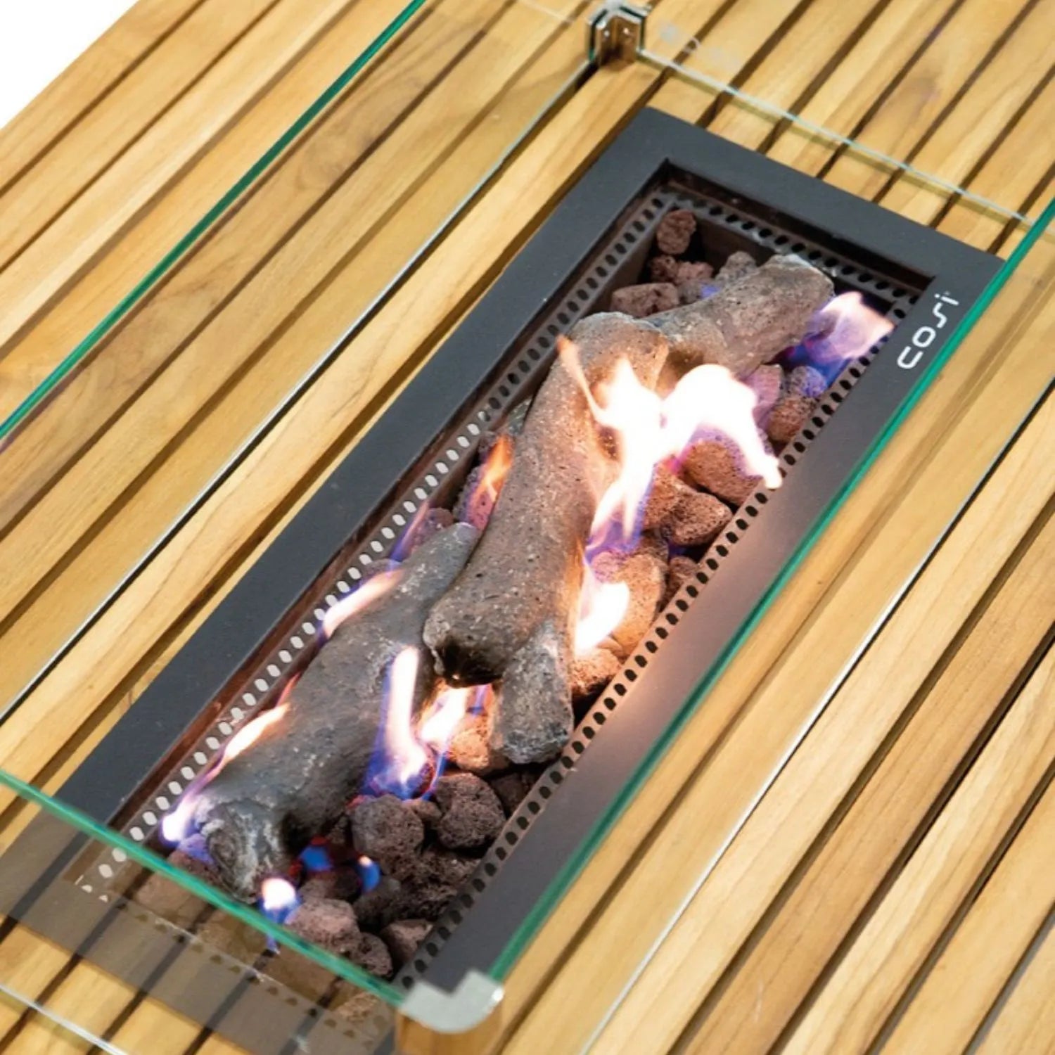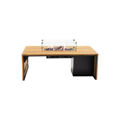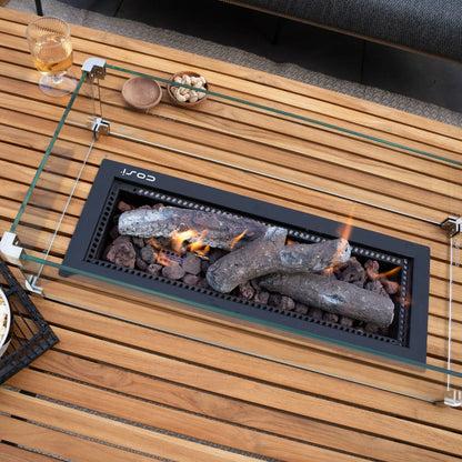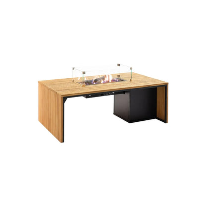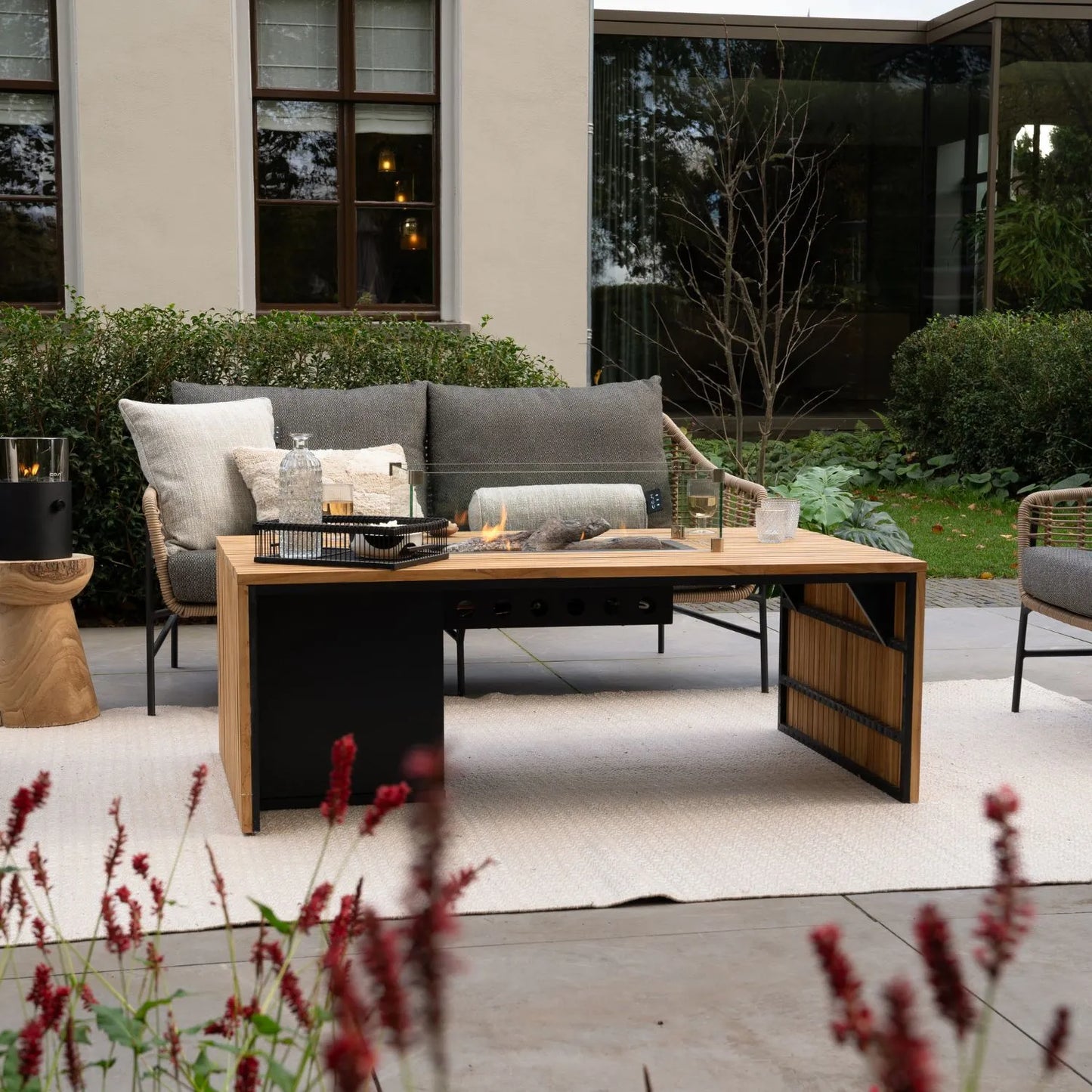Upgrade your outdoor entertaining space with the Cosibridge 140 rectangular gas fire pit table — a stylish blend of natural texture, contemporary design, and practical comfort. Featuring a low-profile aluminium frame with slatted teak wood detailing on the top and sides, this freestanding firepit table brings modern warmth and organic character to patios, terraces, garden seating areas, and larger balconies.