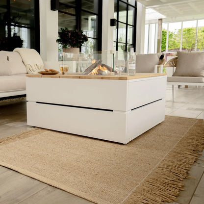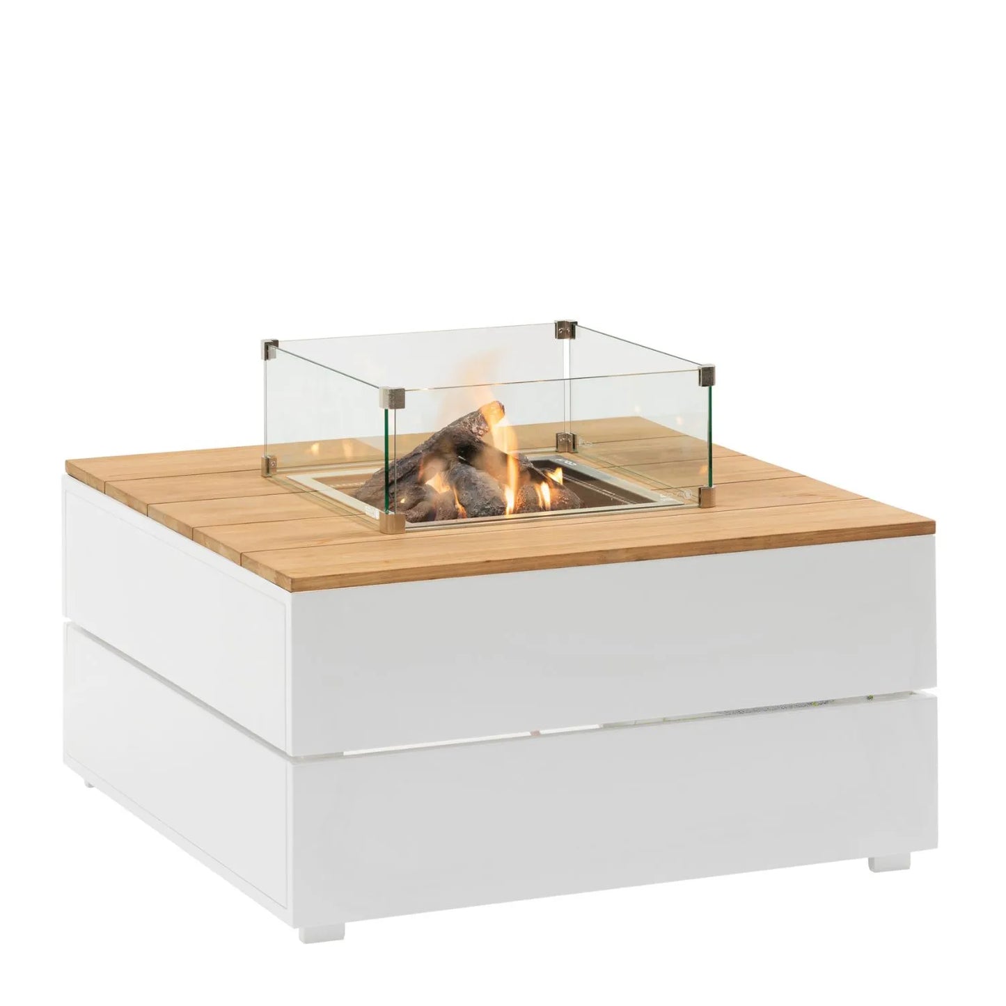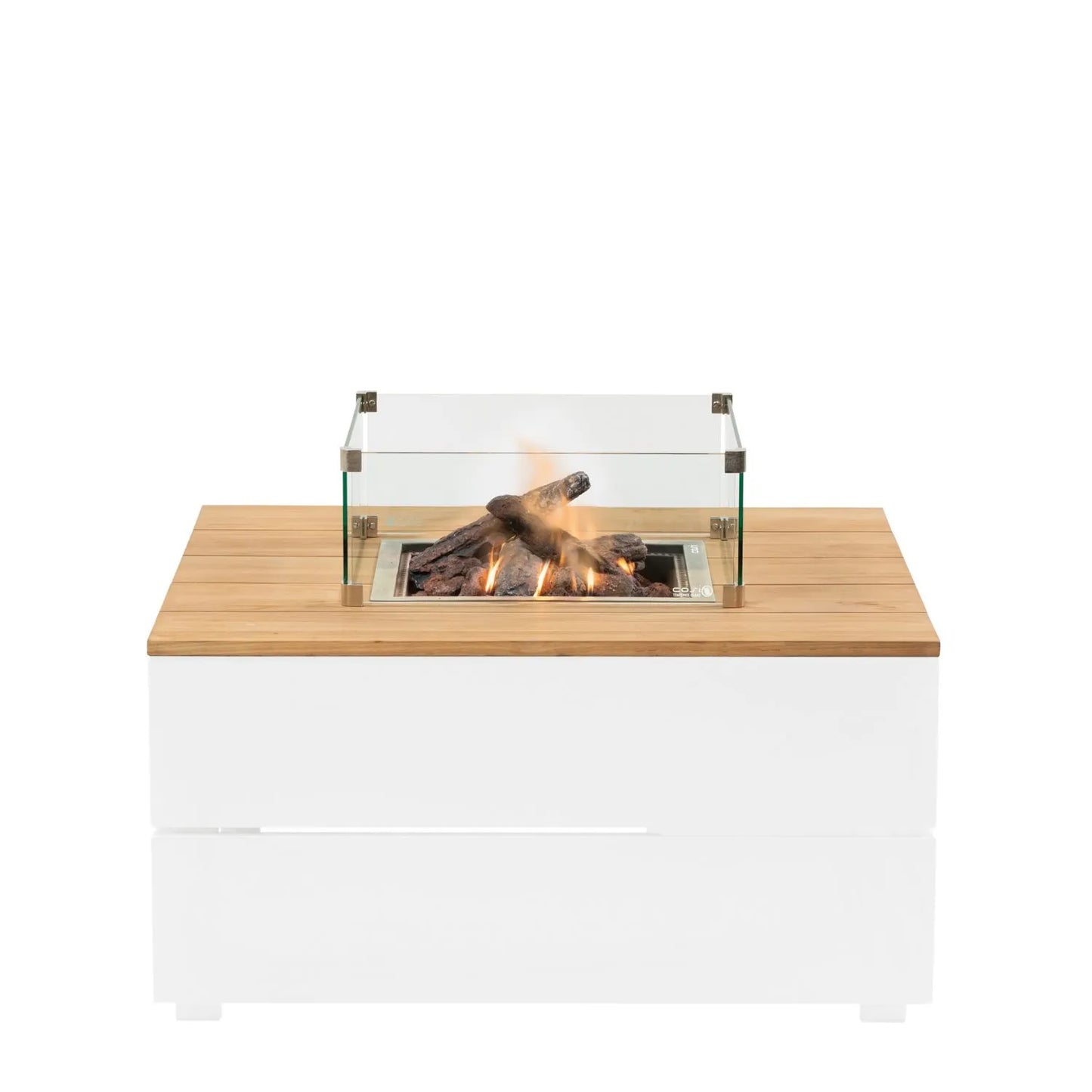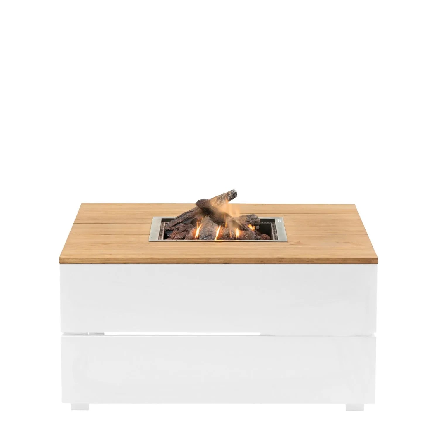 Cosipure 100 Square Outdoor Gas Fire Pit Table with White Metal Base & Teak Wood Top – Low Garden Coffee Table Firepit 50x100x100cm