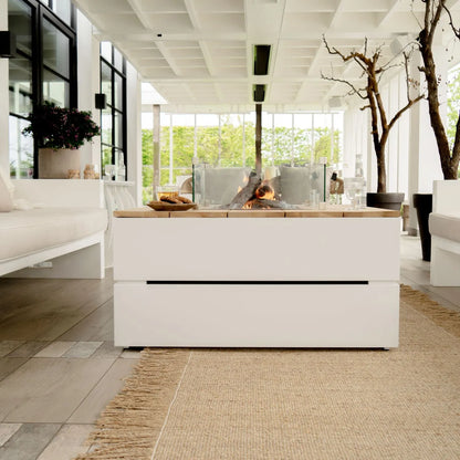 Add modern elegance, natural materials, and inviting warmth to your outdoor space with the Cosipure 100 square gas fire pit table in white. Featuring a crisp white aluminium base paired with a solid teak wood top, this low-profile firepit combines clean, contemporary styling with organic texture to create a sophisticated garden centrepiece. Perfect for patios, terraces, and lounge areas, it brings both ambience and practicality to your outdoor setup.