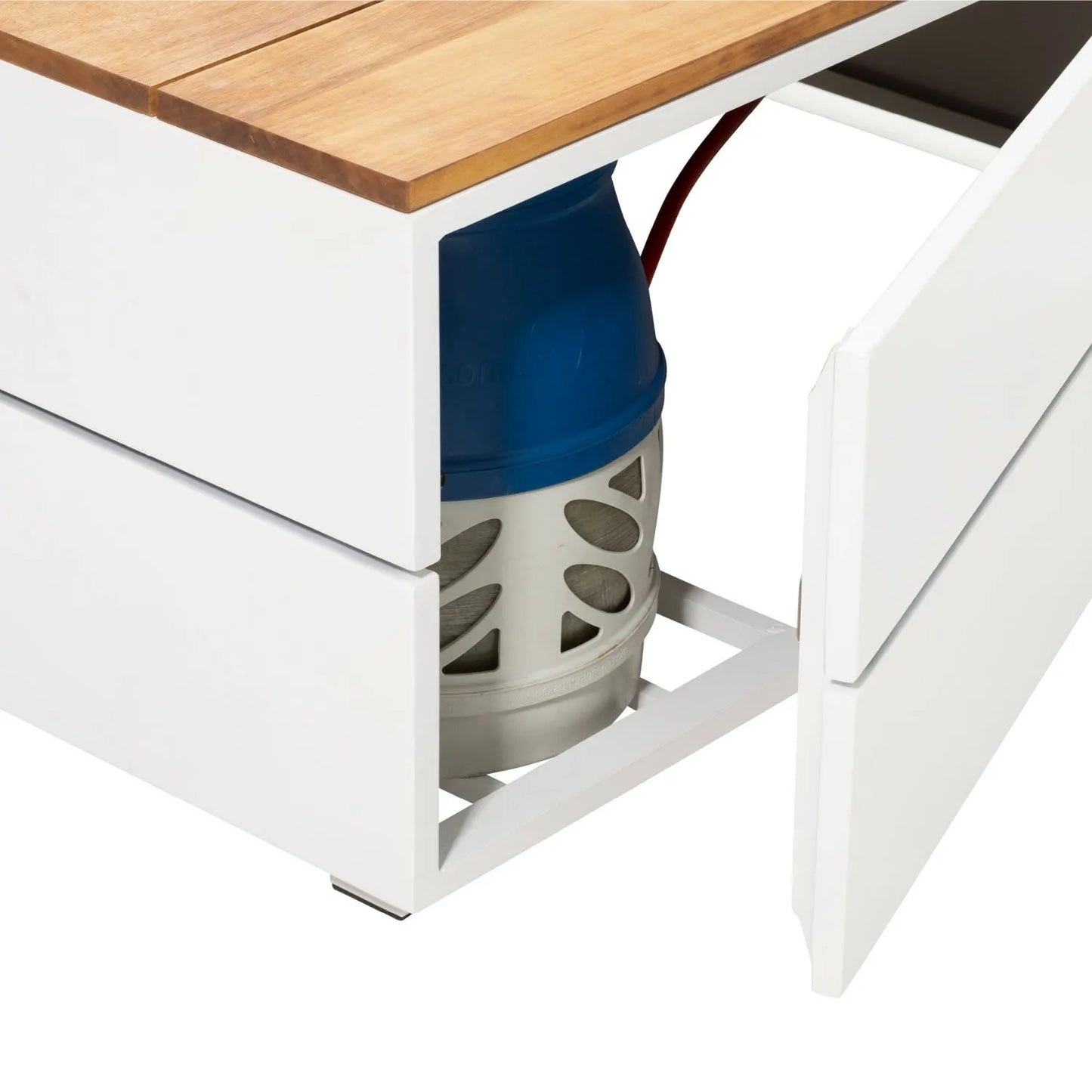 Made with a white open aluminium frame and finished with a richly grained teak wood top, the Cosipure 100 is designed for all-season use. A built-in gas burner filled with natural lava stones and four ceramic logs delivers a realistic, flickering flame with a powerful heat output of up to 9kW. The sleek design includes a hidden compartment to store a 5kg propane gas bottle (not included), maintaining the table’s minimalist, uncluttered look.