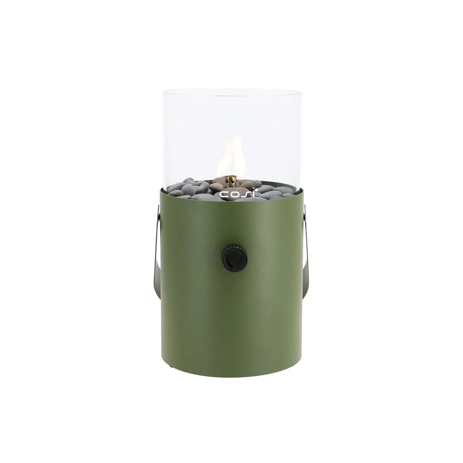 Cosiscoop Heritage Green Metal & Glass Gas Fire Lantern with Cylindrical Base & Handle – Outdoor Tabletop Firepit 30x16x16cm
