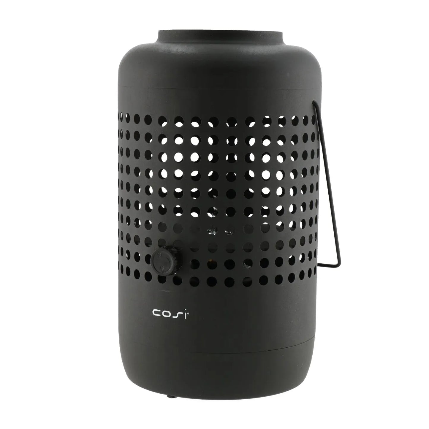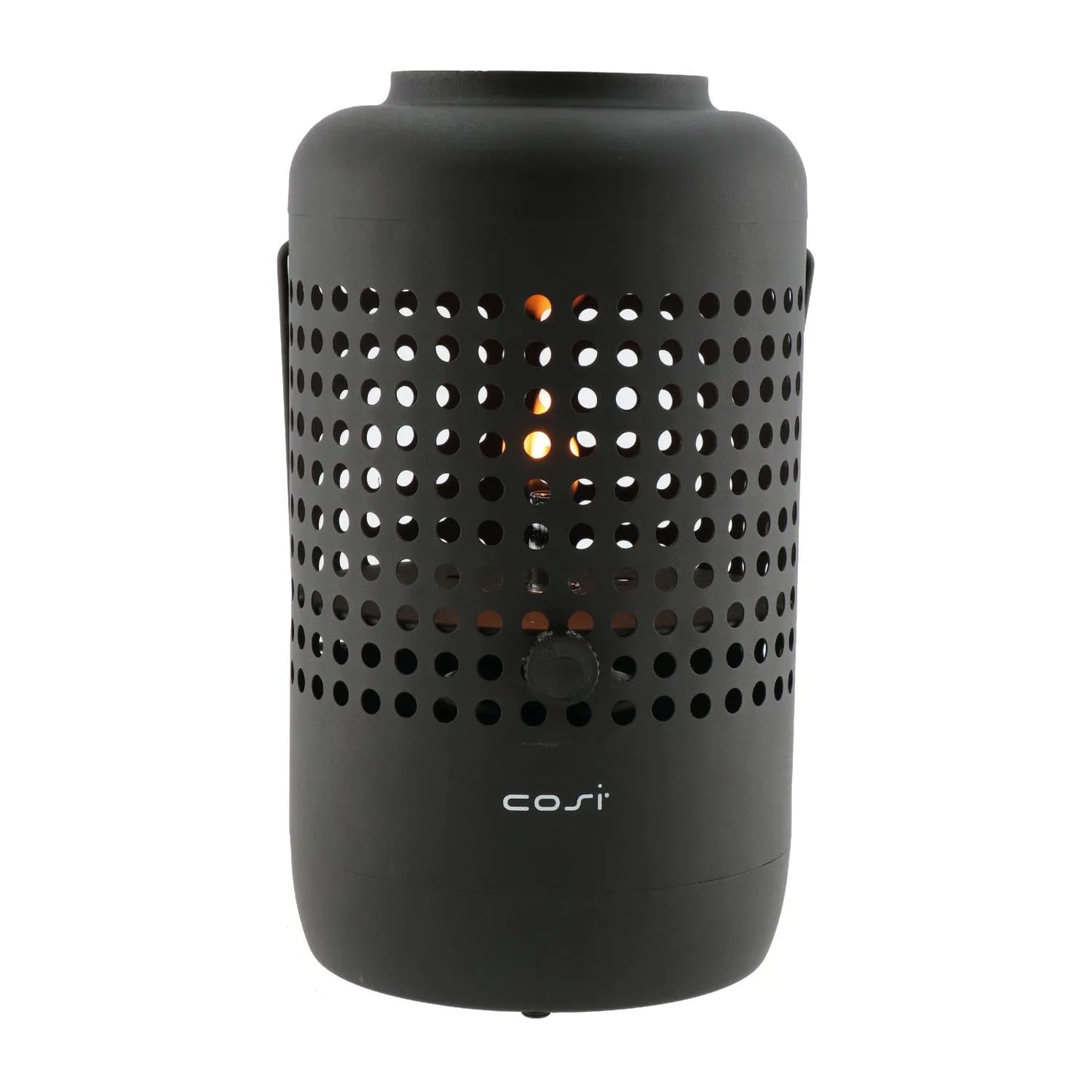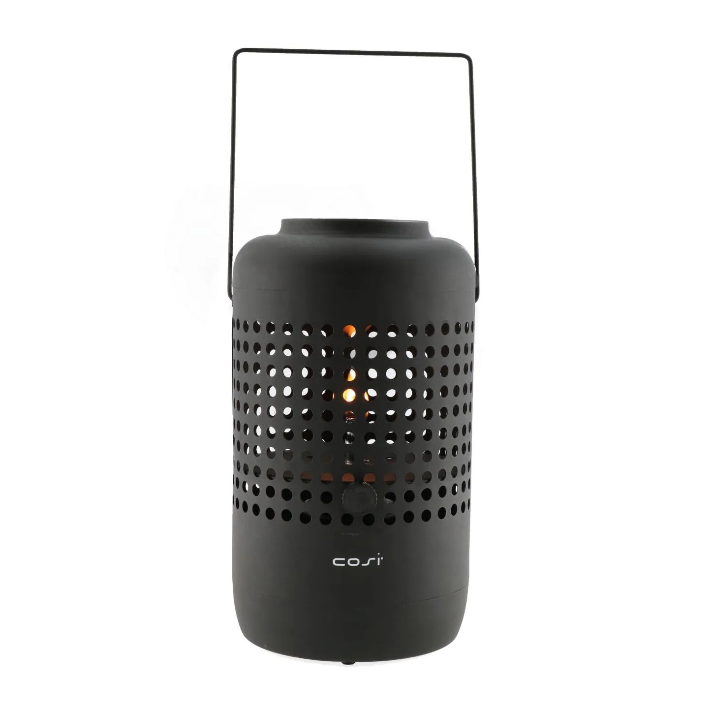 Bring warmth and contemporary style to your outdoor spaces with the Cosiscoop matt black metal gas fire lantern. This striking tabletop firepit features a cylindrical base with evenly spaced perforated holes that not only create a modern design aesthetic but also allow heat to dissipate safely and evenly. Made from durable matt black metal, the lantern offers a sleek, minimalist profile that blends seamlessly with modern and industrial decor styles. Its sturdy, rectangular handle with an ergonomic design makes it easy to carry and reposition, whether placed on a patio, balcony, or garden table. Its balanced proportions and clean lines make it both functional and stylish—a perfect addition to your outdoor setup.