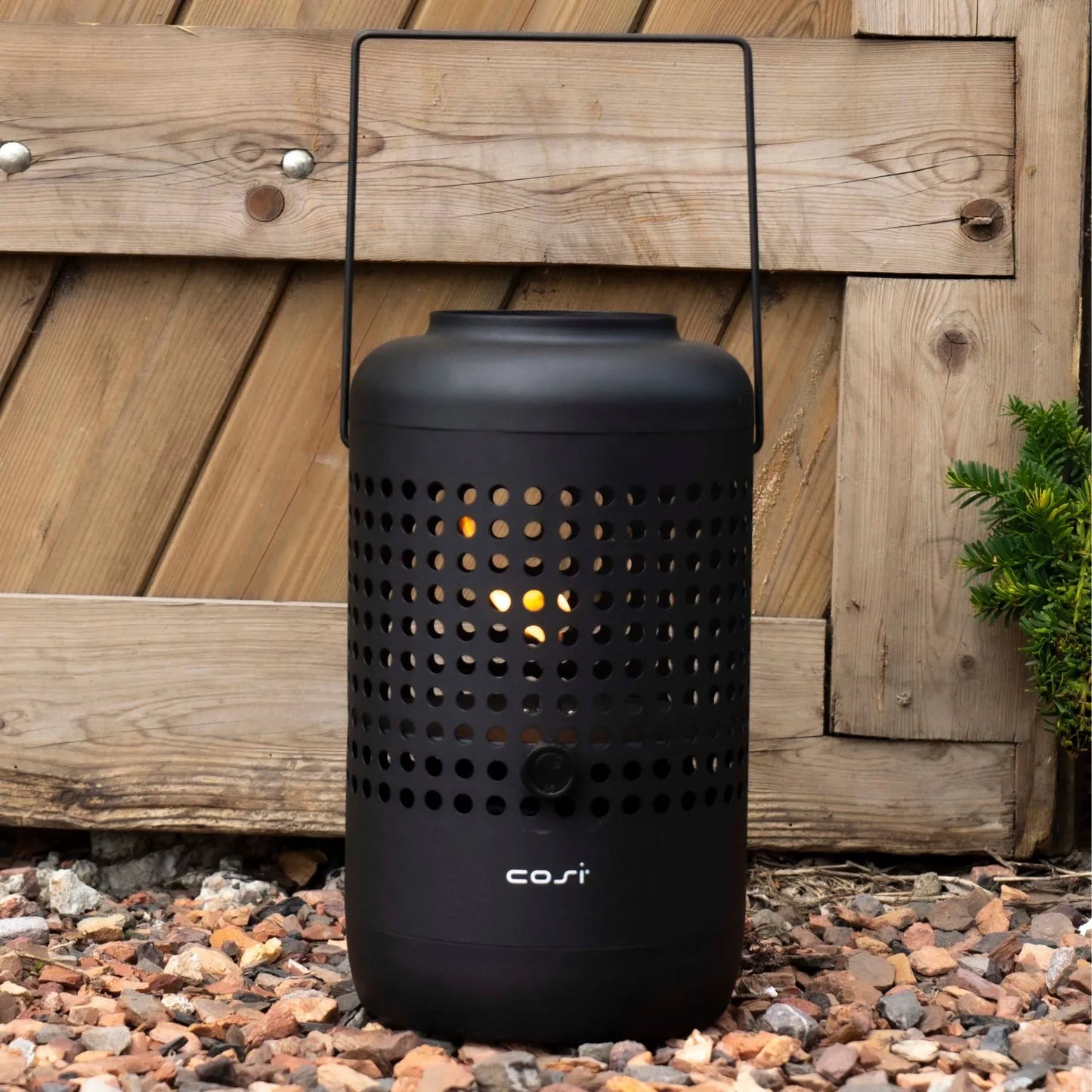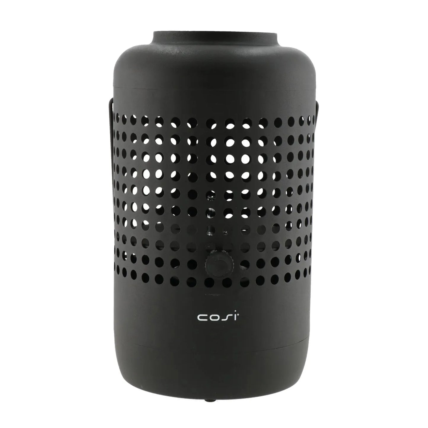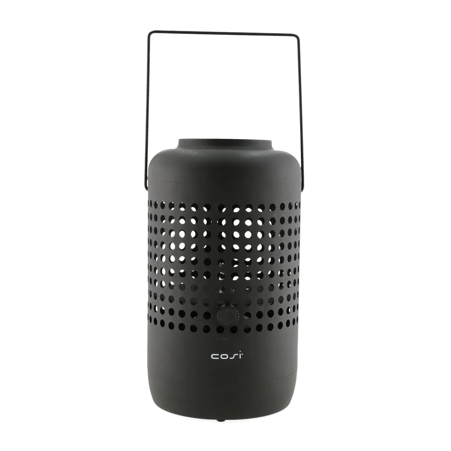 Bring warmth and contemporary style to your outdoor spaces with the Cosiscoop matt black metal gas fire lantern. This striking tabletop firepit features a cylindrical base with evenly spaced perforated holes that not only create a modern design aesthetic but also allow heat to dissipate safely and evenly. Made from durable matt black metal, the lantern offers a sleek, minimalist profile that blends seamlessly with modern and industrial decor styles. Its sturdy, rectangular handle with an ergonomic design makes it easy to carry and reposition, whether placed on a patio, balcony, or garden table. Its balanced proportions and clean lines make it both functional and stylish—a perfect addition to your outdoor setup.