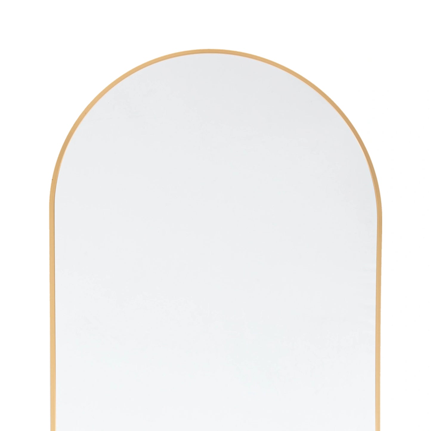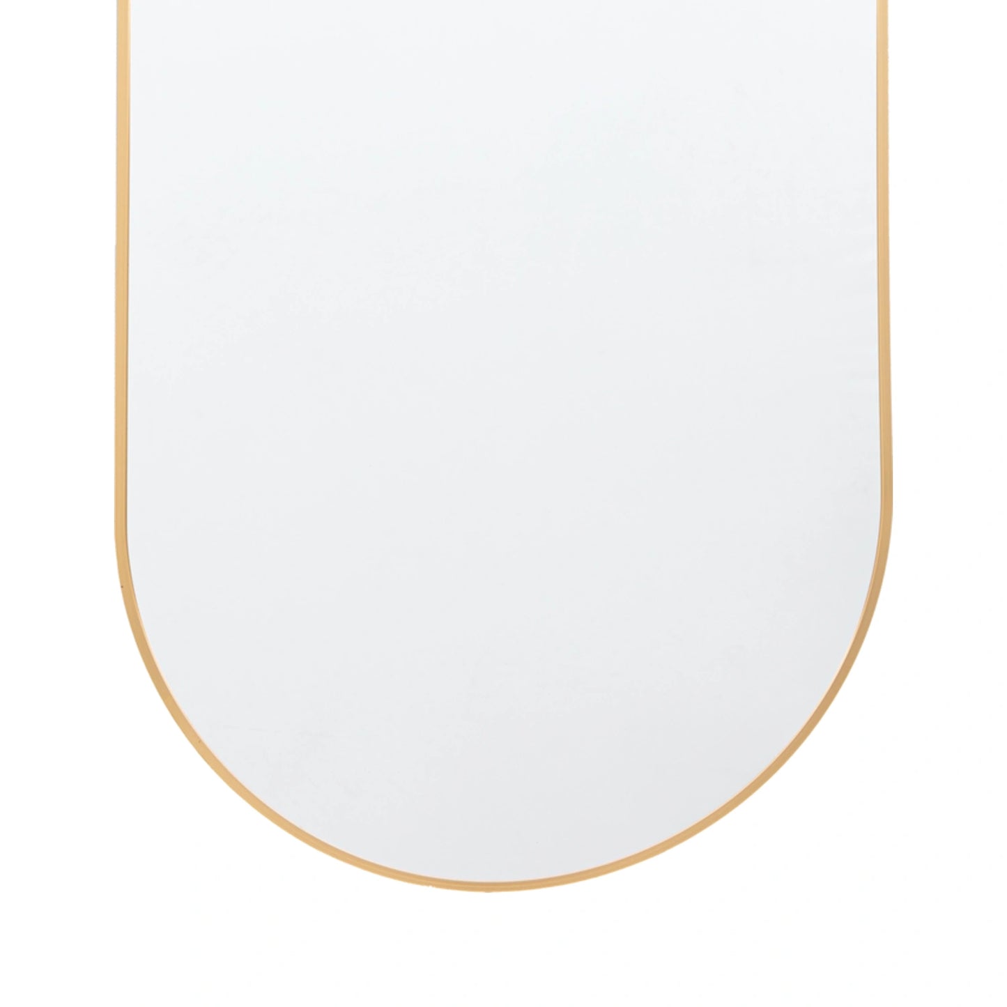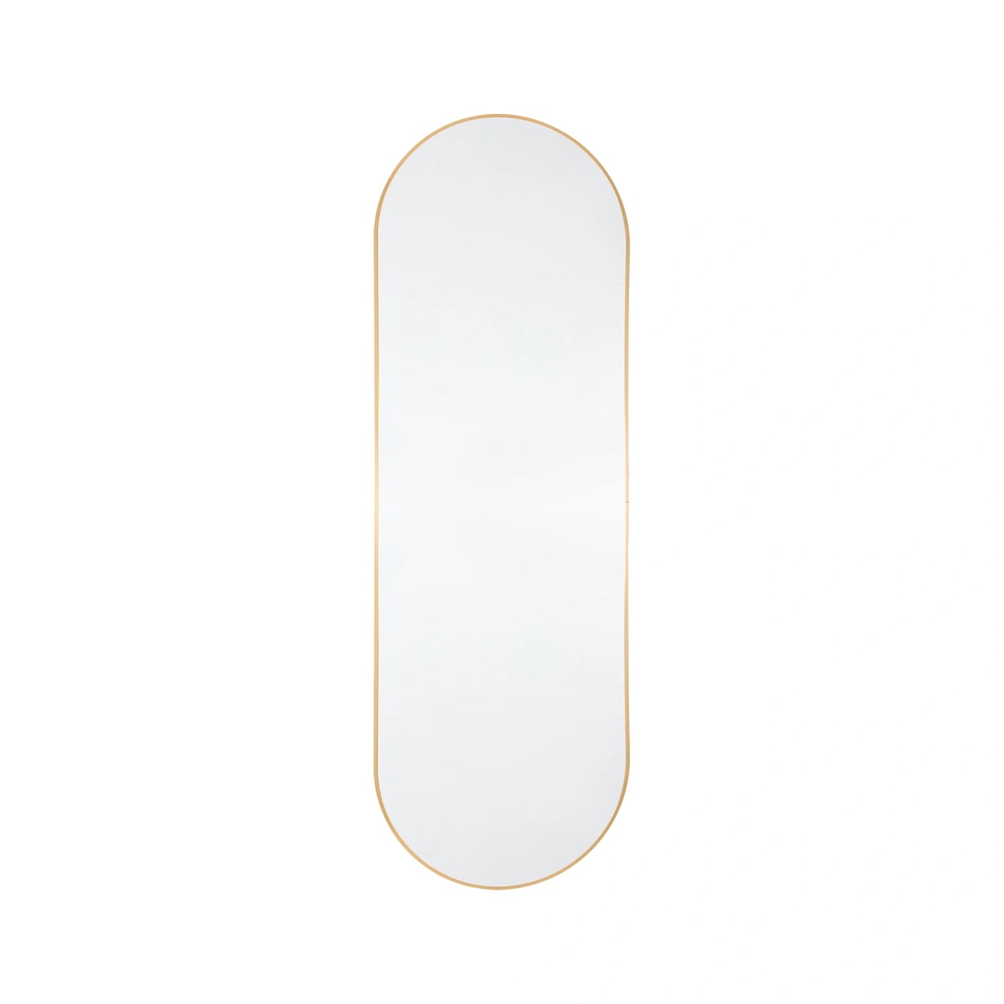 Our full-length racetrack wall mirror is framed in gold with a sleek, thin elongated frame. This mirror's racetrack curve brings a soft, modern touch to the classic full-length mirror. The minimalist design makes it a modern addition to your hallway, bedroom, or dressing area.