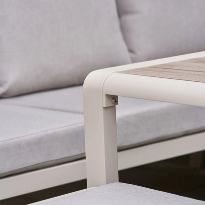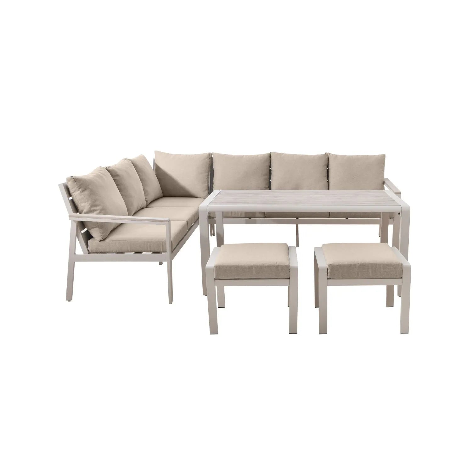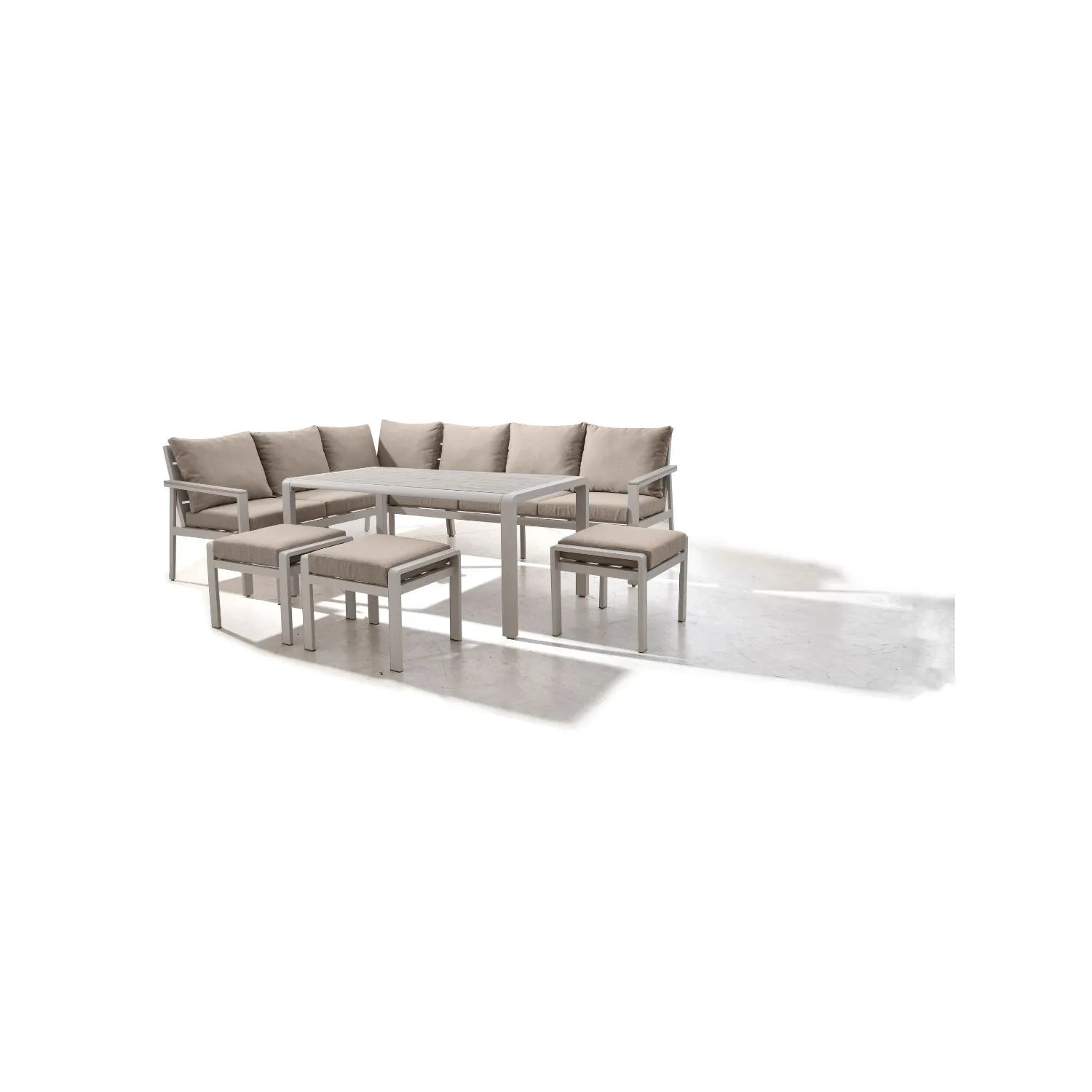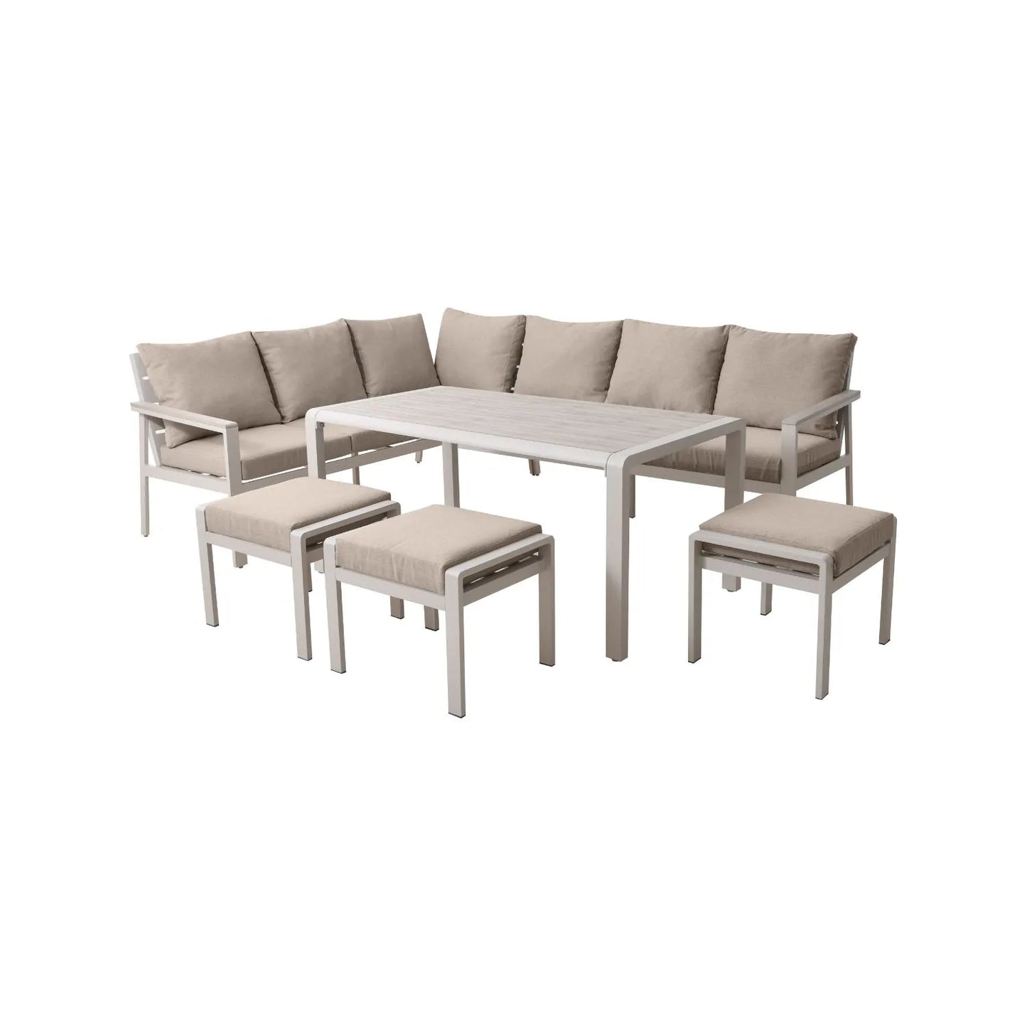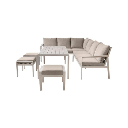 This spacious corner sofa configuration includes a left-arm sofa section, a right-arm sofa section, three cushioned footstools, and a matching slatted rectangular dining table – all crafted from powder-coated aluminium in a soft latte cream finish. The coordinating ash grey polywood tabletop adds a natural wood-effect look with the added benefit of being low-maintenance and weather-resistant.