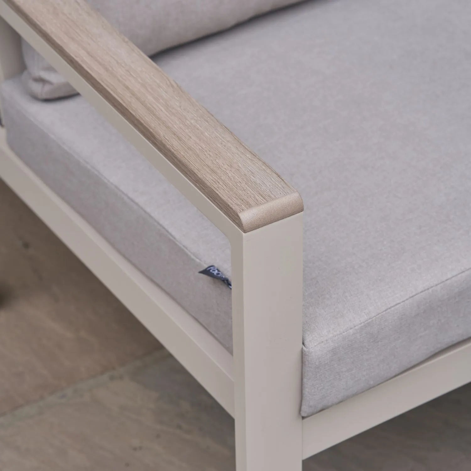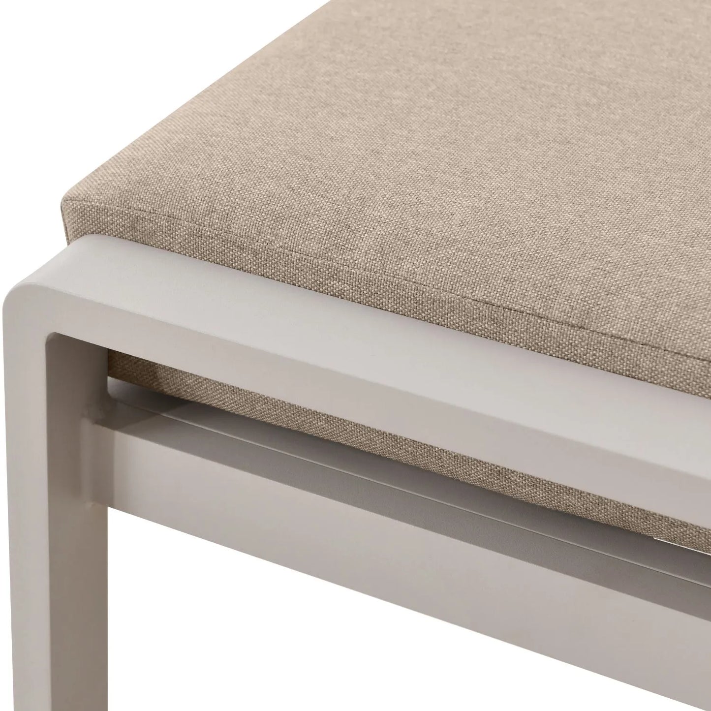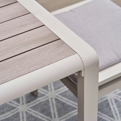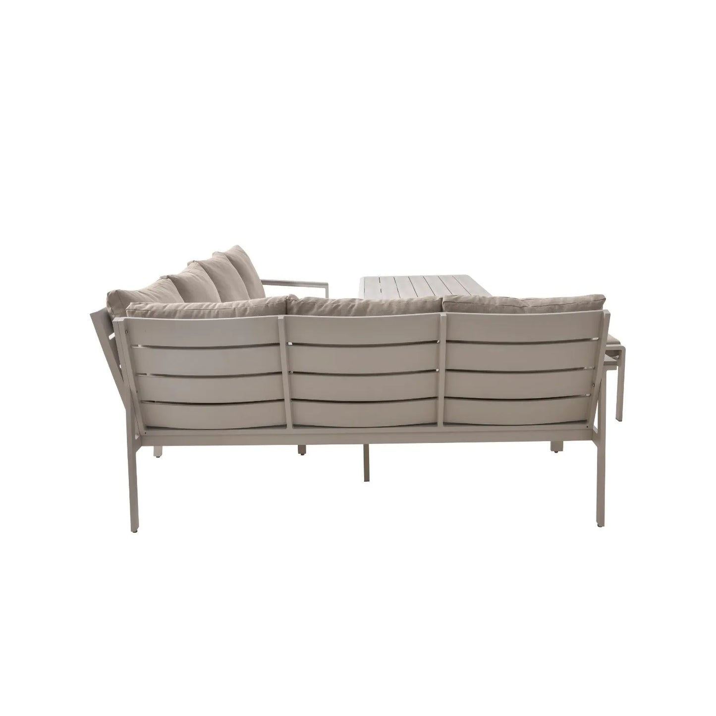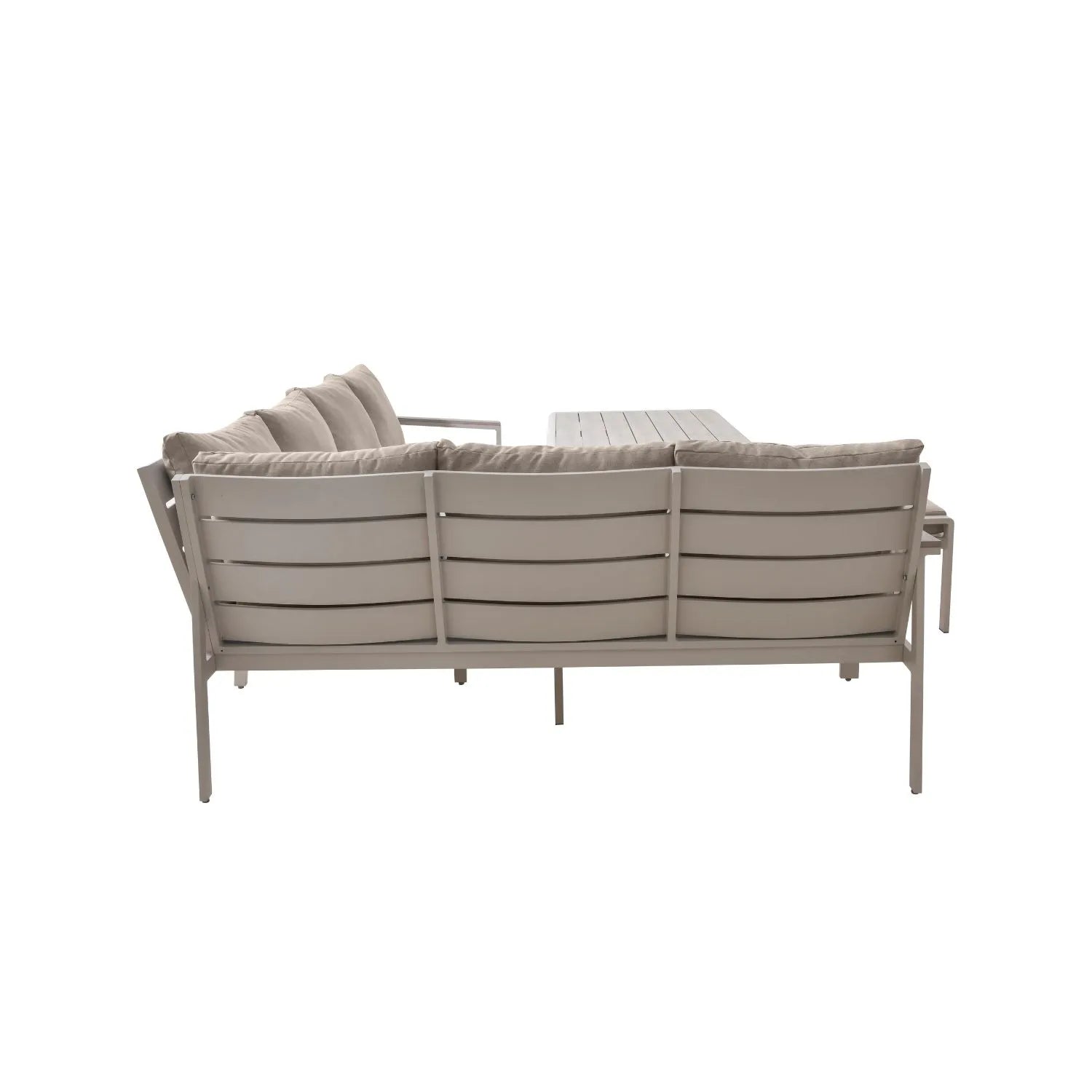 This spacious corner sofa configuration includes a left-arm sofa section, a right-arm sofa section, three cushioned footstools, and a matching slatted rectangular dining table – all crafted from powder-coated aluminium in a soft latte cream finish. The coordinating ash grey polywood tabletop adds a natural wood-effect look with the added benefit of being low-maintenance and weather-resistant.