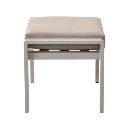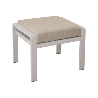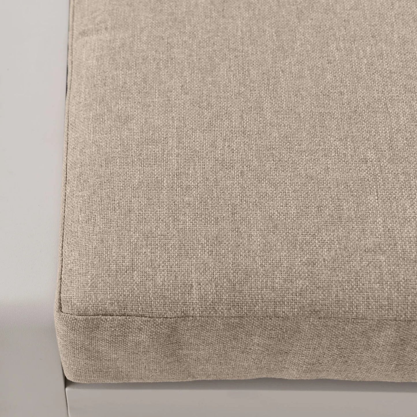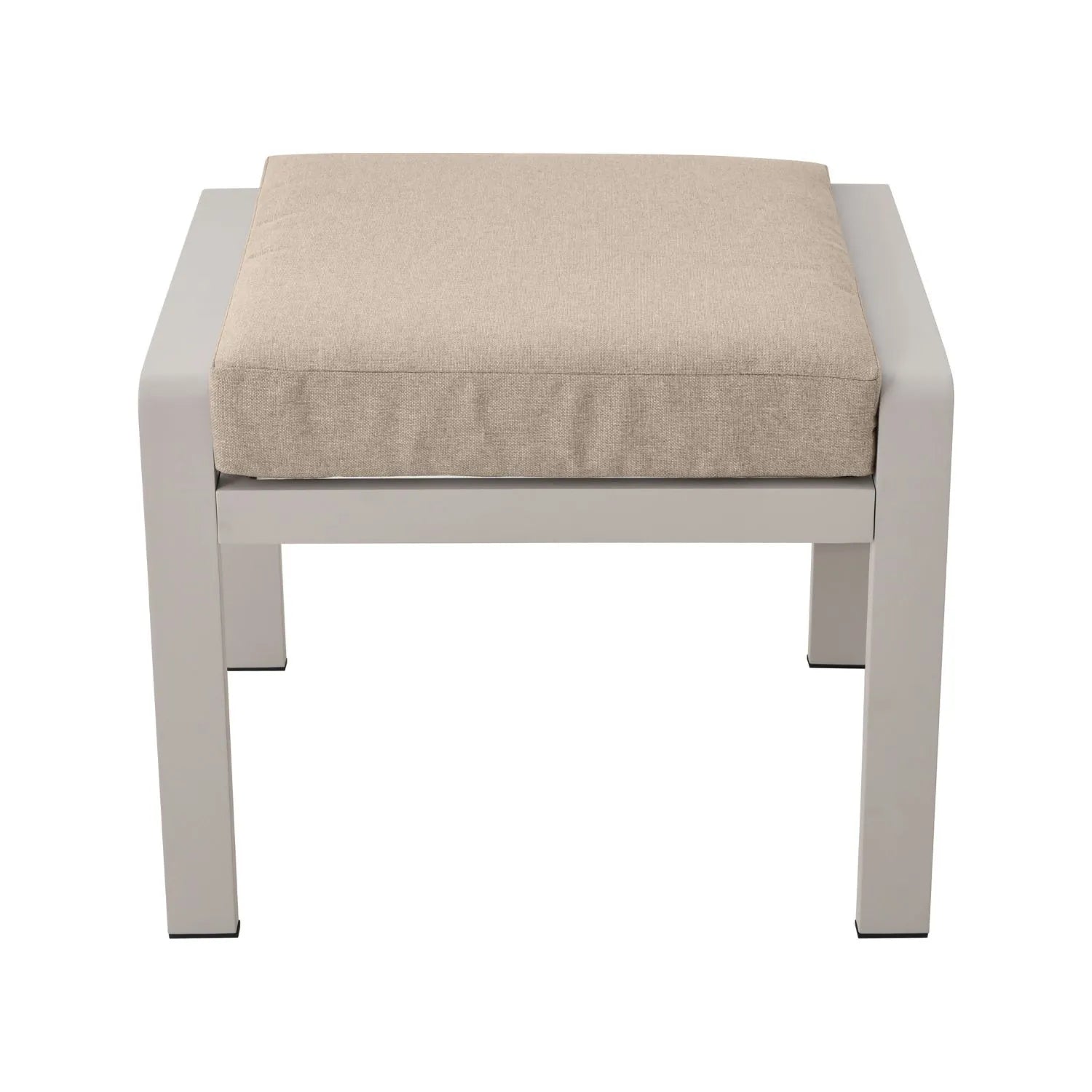 Designed with both style and practicality in mind, the seating features armrests and thick season-proof seat cushions in a light grey putty tone. Each cushion is made from premium Olefin fabric – a high-performance outdoor textile that’s UV-resistant, quick-drying, and easy to care for. The padded footstools offer seating or serve as relaxed leg rests, while the generous corner layout comfortably seats up to five people.