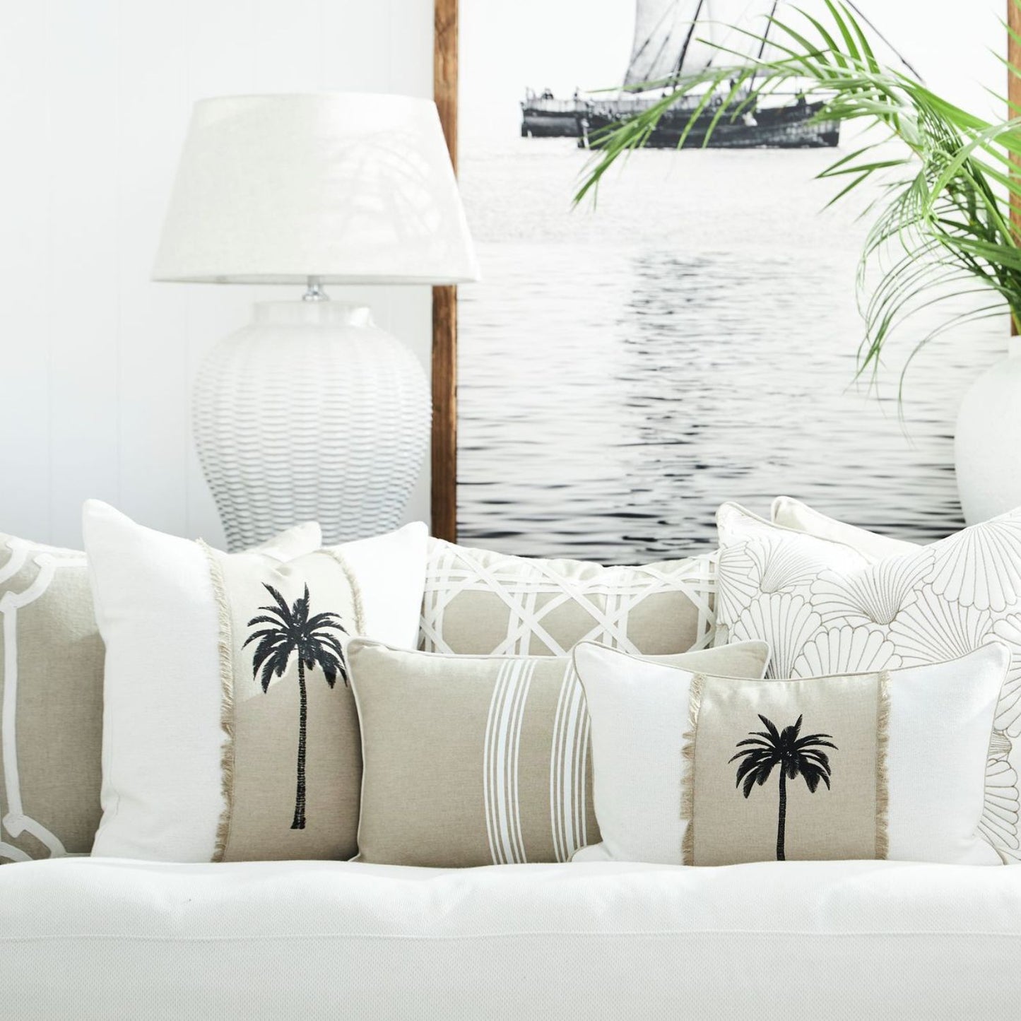 Transform your home decor with the luxurious island serenity 50x50cm cushion. Crafted from cotton, this palm-printed cushion showcases a relaxed aesthetic, featuring chambray applique, fringed trim and a touch of refined island luxury. The printed design, frayed details and piping add a stylish and elegant touch to any space. Transform your living room or bedroom into a serene island oasis with this tropical-inspired cushion.