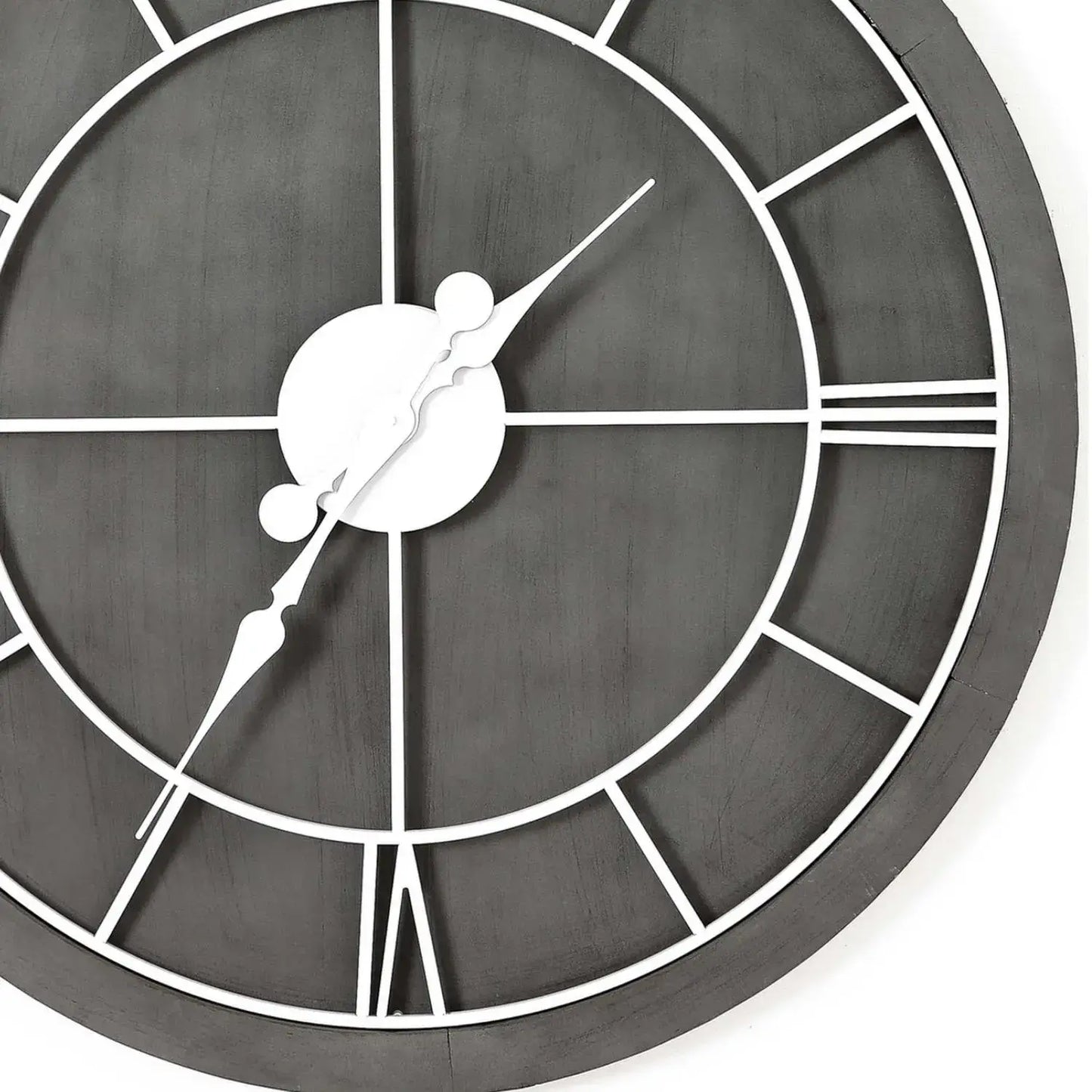 Bring a modern statement to your decor with this large grey wooden round modern wall clock, featuring striking white metal Roman numerals and hands. Designed to add a contemporary touch with a timeless twist, this decorative clock is the perfect focal point for living rooms, kitchens, hallways, or office spaces.