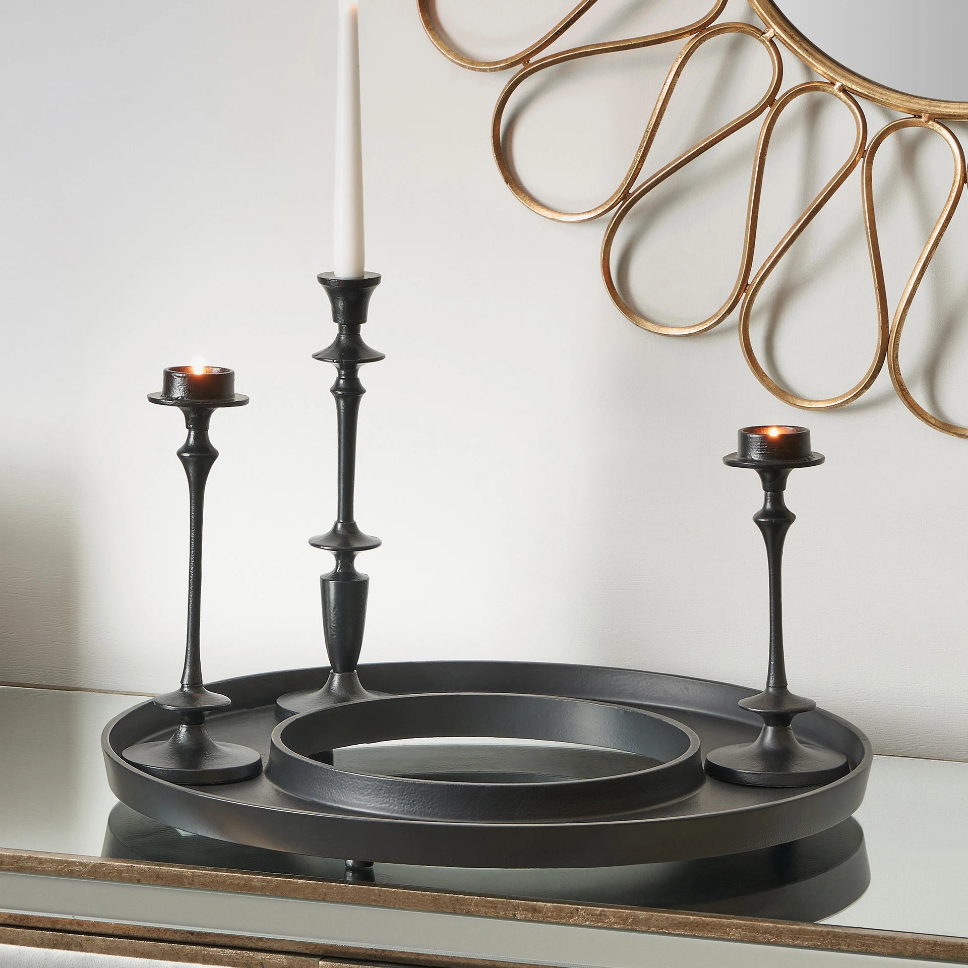 Add a sleek and stylish touch to your home with this large matt black metal ring display tray. Made from durable aluminium, this round black tray features a striking halo-inspired ring design, making it an eye-catching addition to your decor. Ideal for candles, vases, or other accents, it combines practicality with elegance.