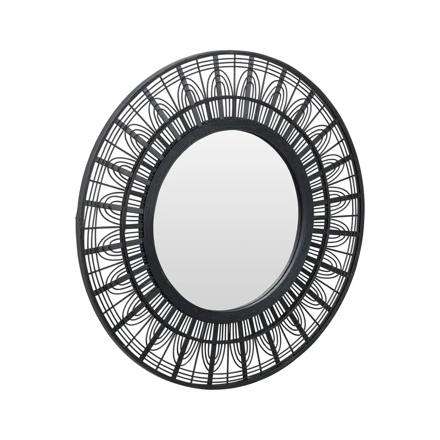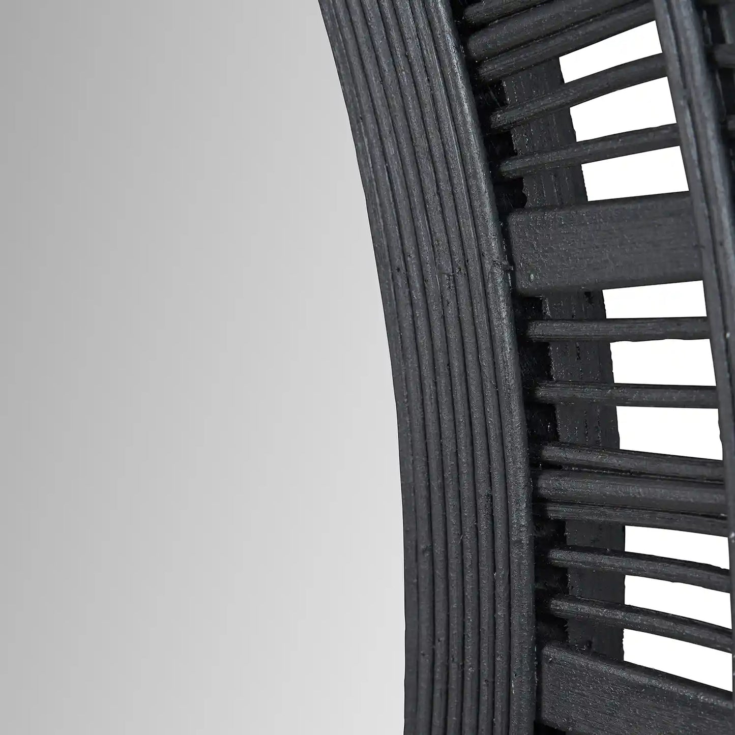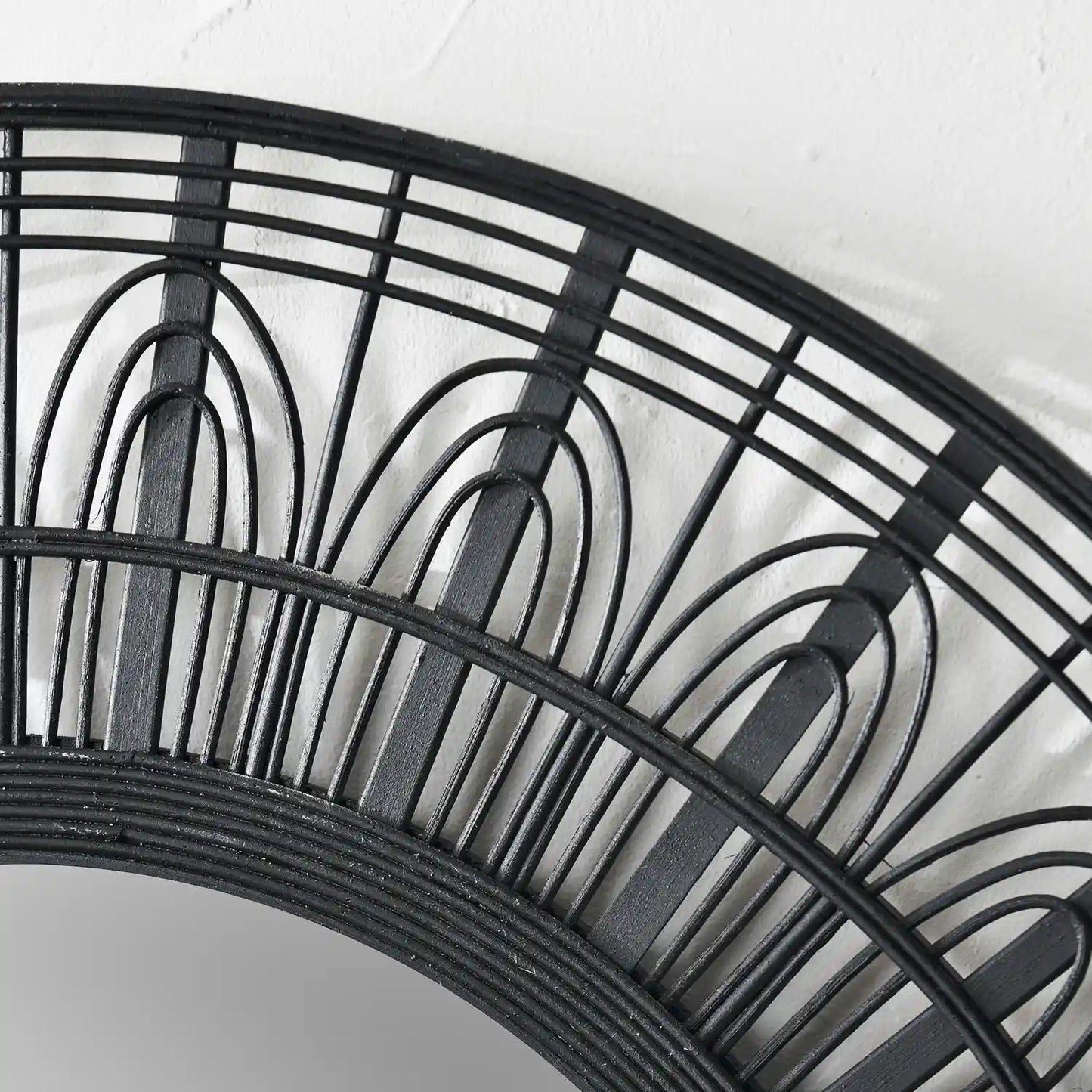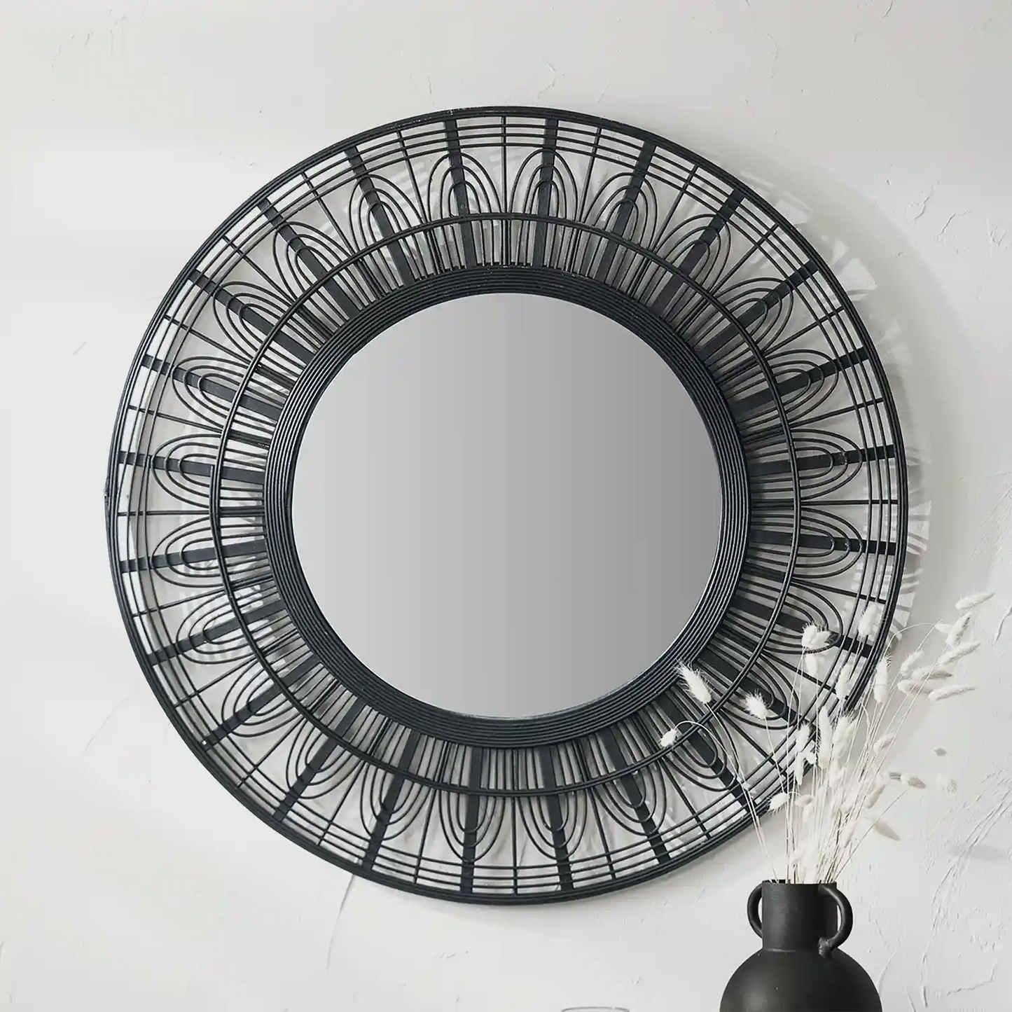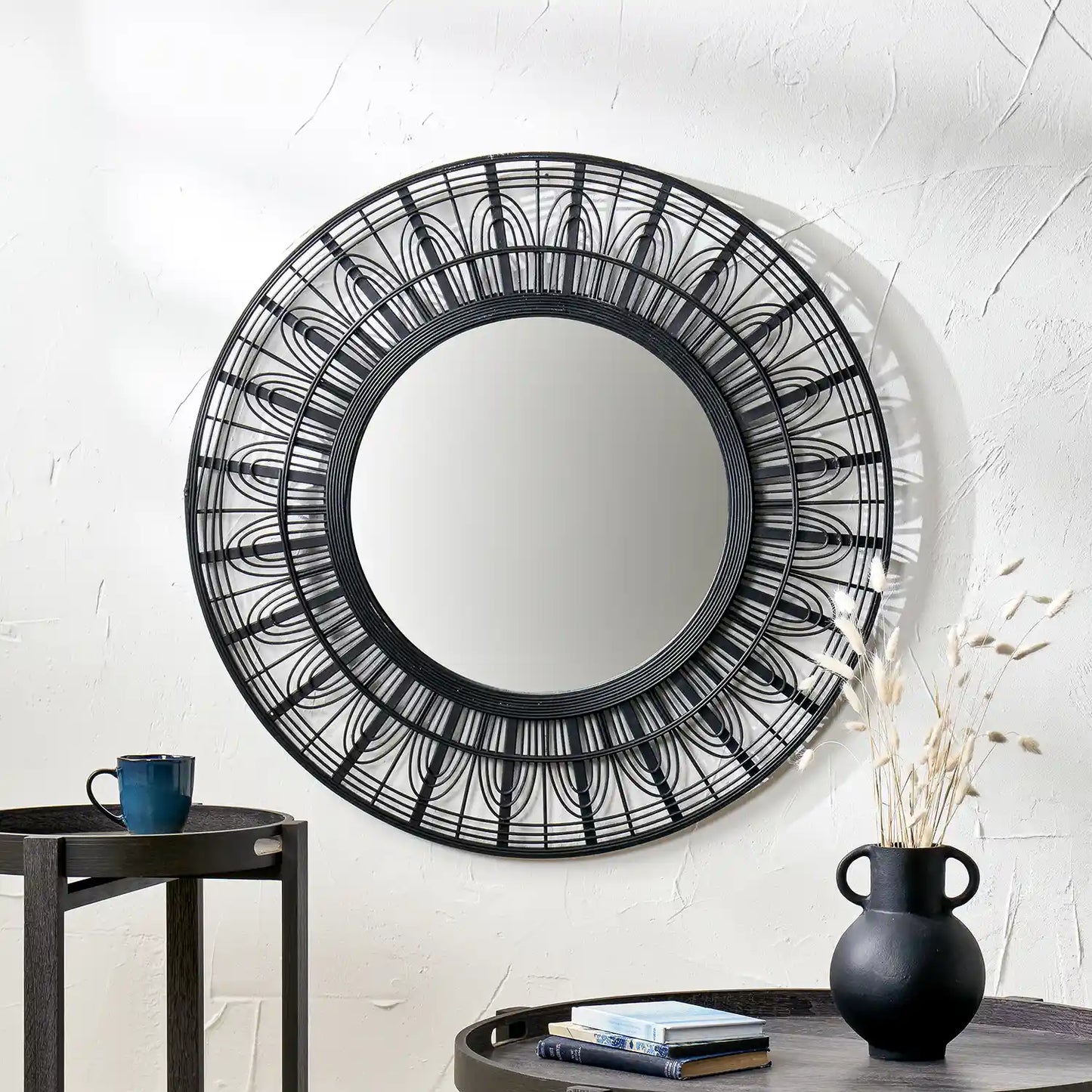 This large round wall mirror is a real statement piece, featuring an intricate black bamboo frame. The frame design showcases a sophisticated pattern with delicate curves and geometric lines. The black bamboo structure results in an unusual yet elegant black framed wall mirror that adds both a boho and eclectic vibe to your home. Its modern design blends style and sophistication seamlessly.