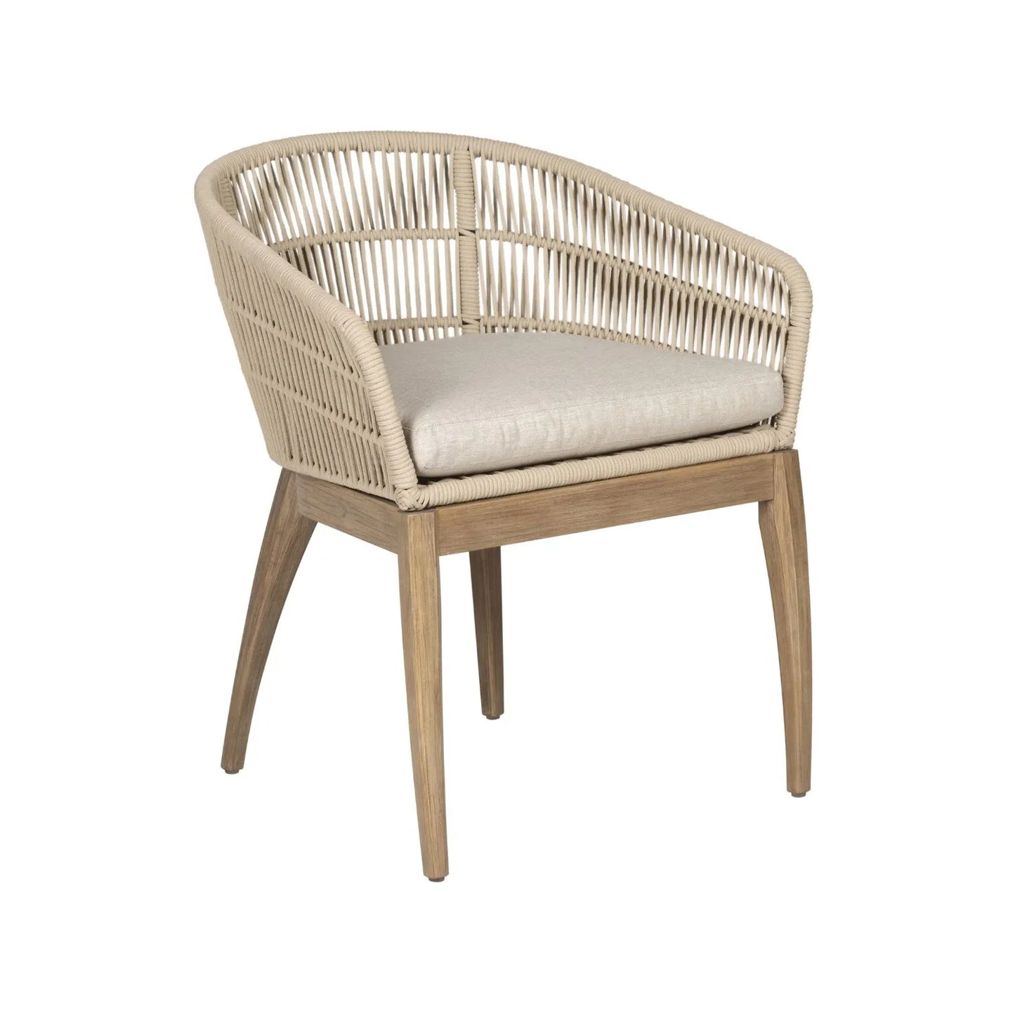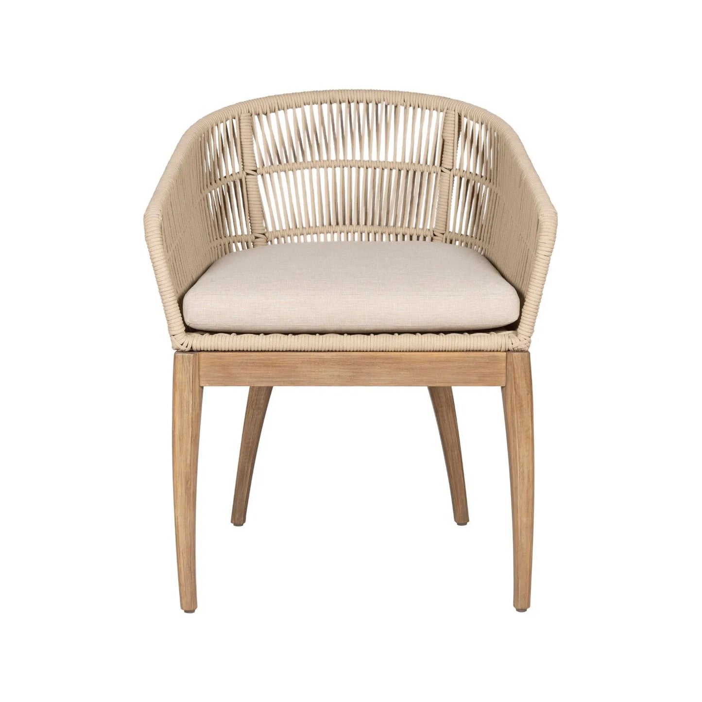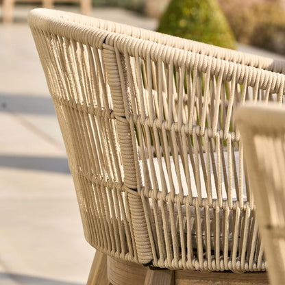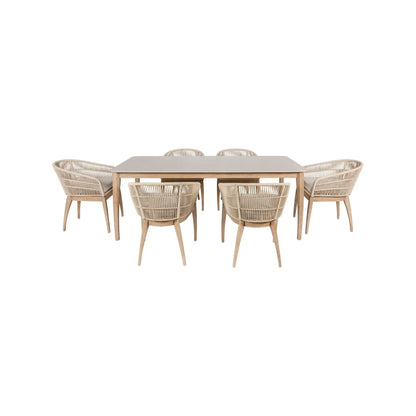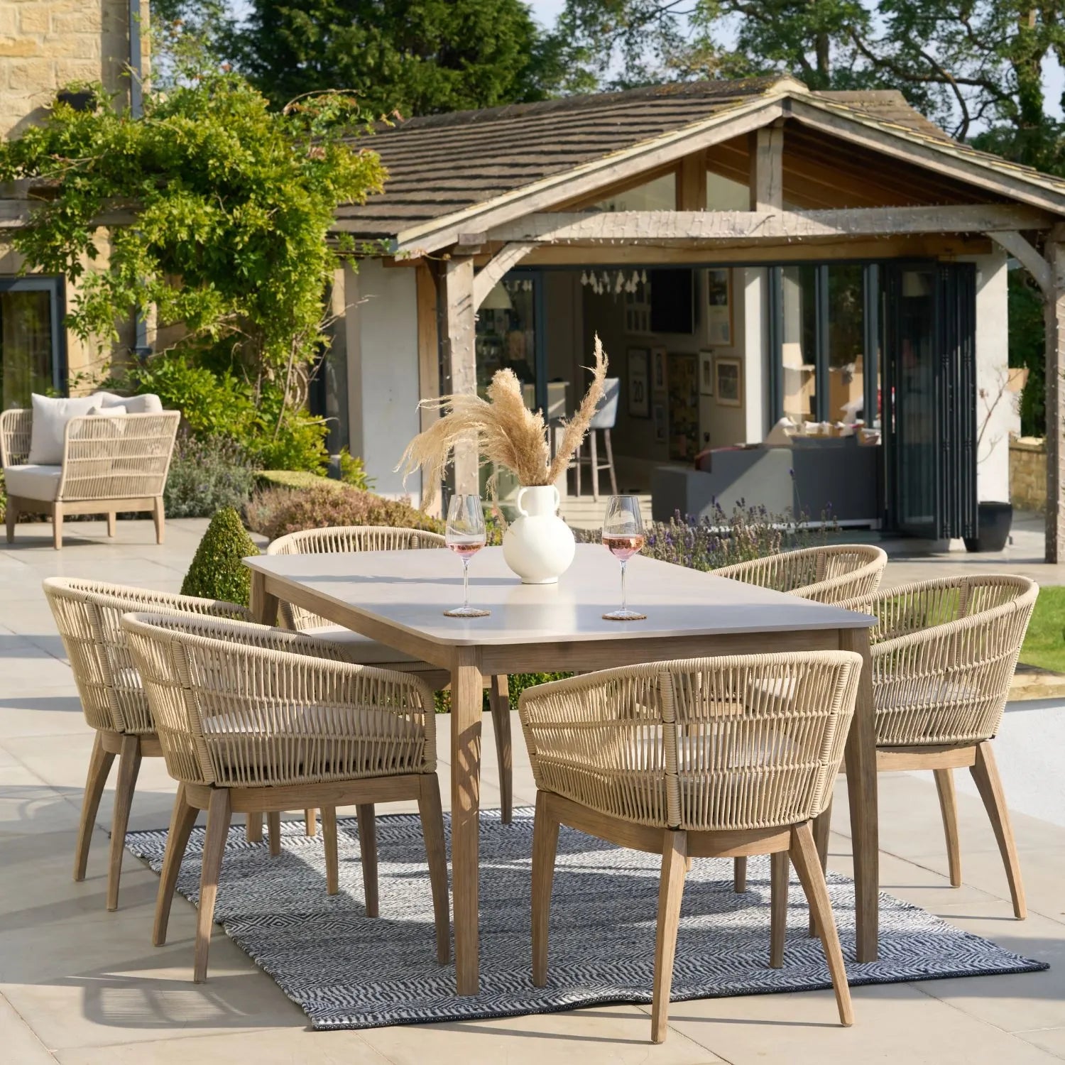 The set includes a generously sized rectangular dining table and six comfortable dining chairs. Each chair is crafted from strong, sustainable acacia wood with angled legs and gently curved arms, hand-wrapped in a latte-toned beige polyrope weave for added comfort and support. The soft natural oatmeal cushions are made from premium Olefin fabric – quick-drying, UV-protected, stain-resistant and fire-retardant – perfect for practical, long-lasting use in British gardens.