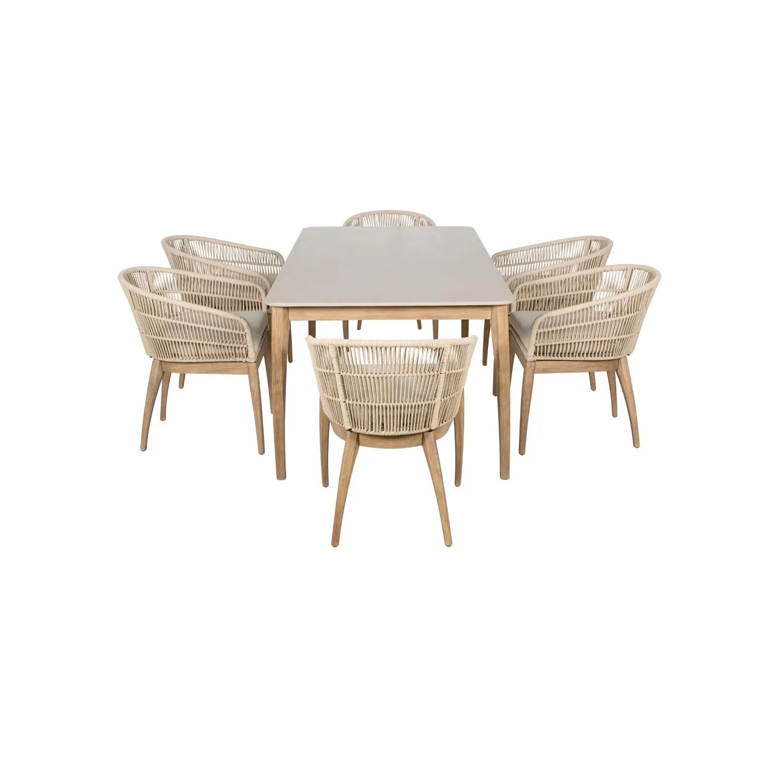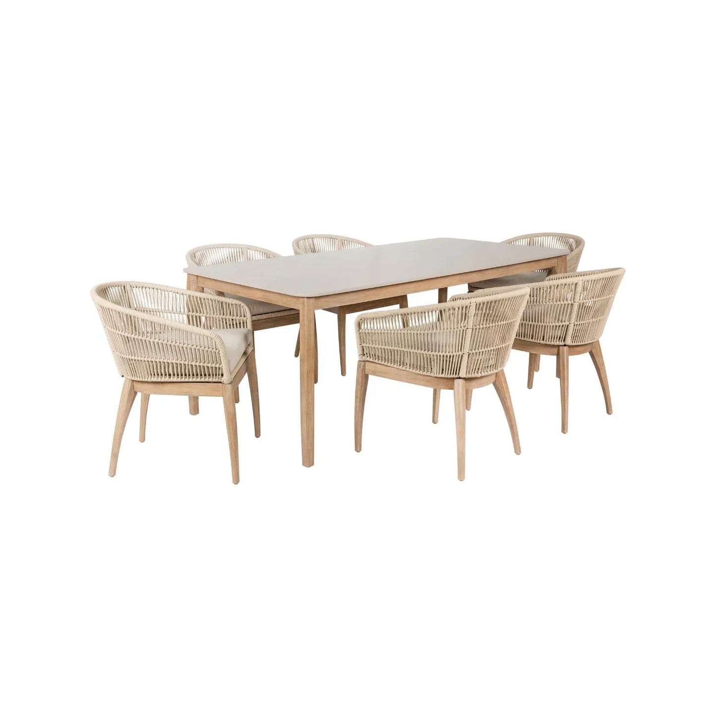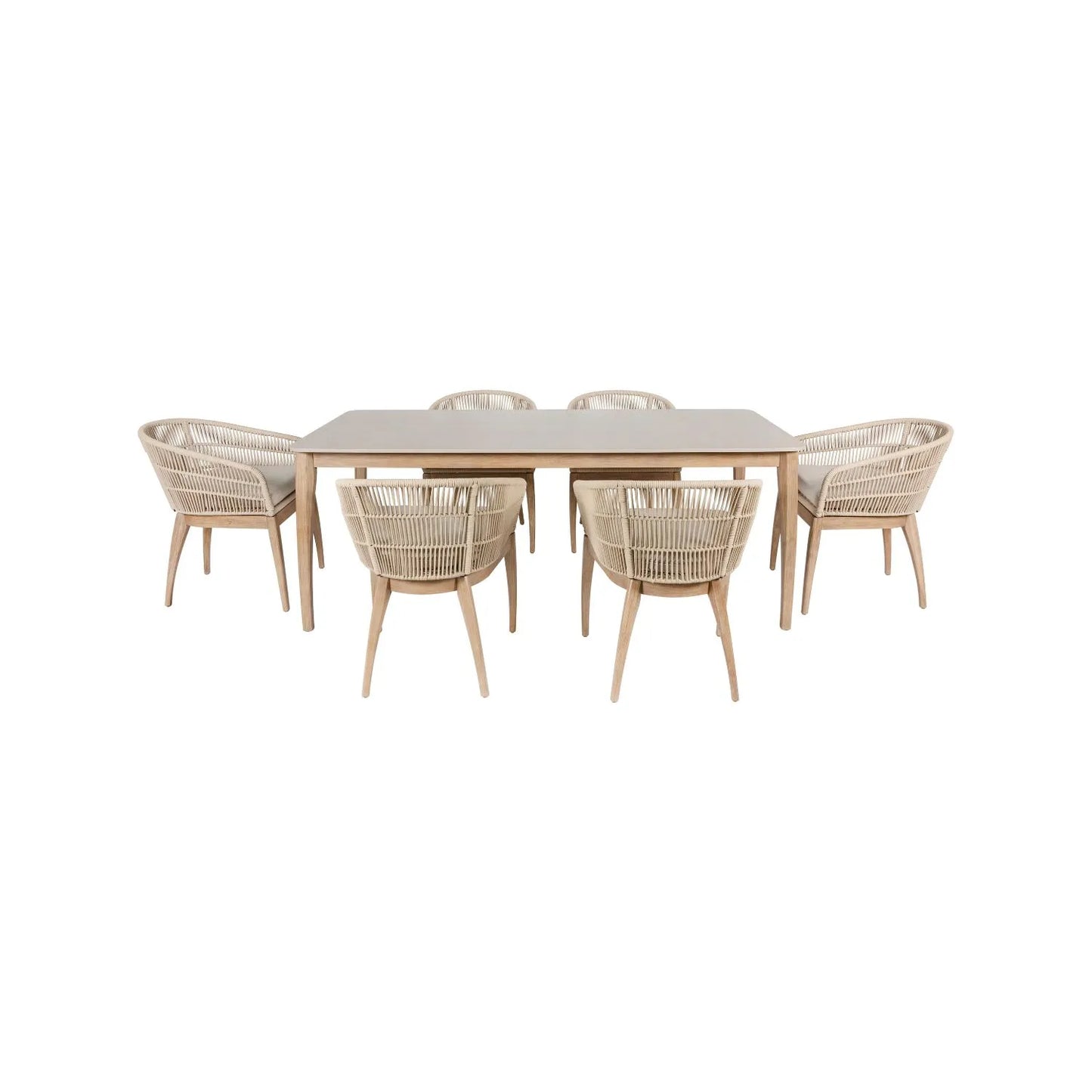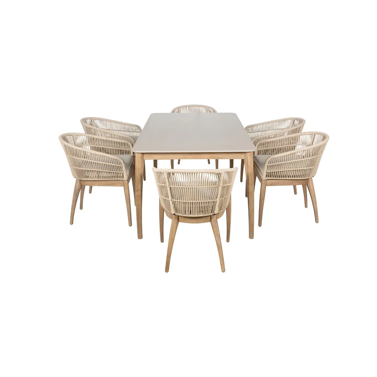 Neutral Beige 6-Seater Outdoor Rope Garden Dining Set with Cushions – Acacia Wood & Polyrope Chairs & Polystone Table 76x200x100cm