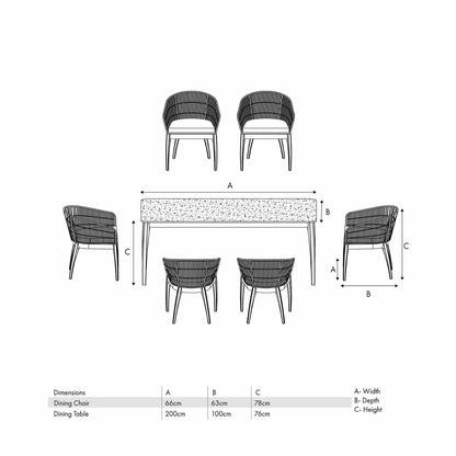 - Includes 1 x rectangular dining table and 6 x cushioned dining chairs
