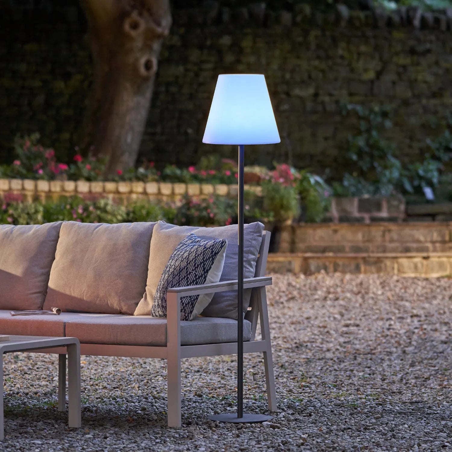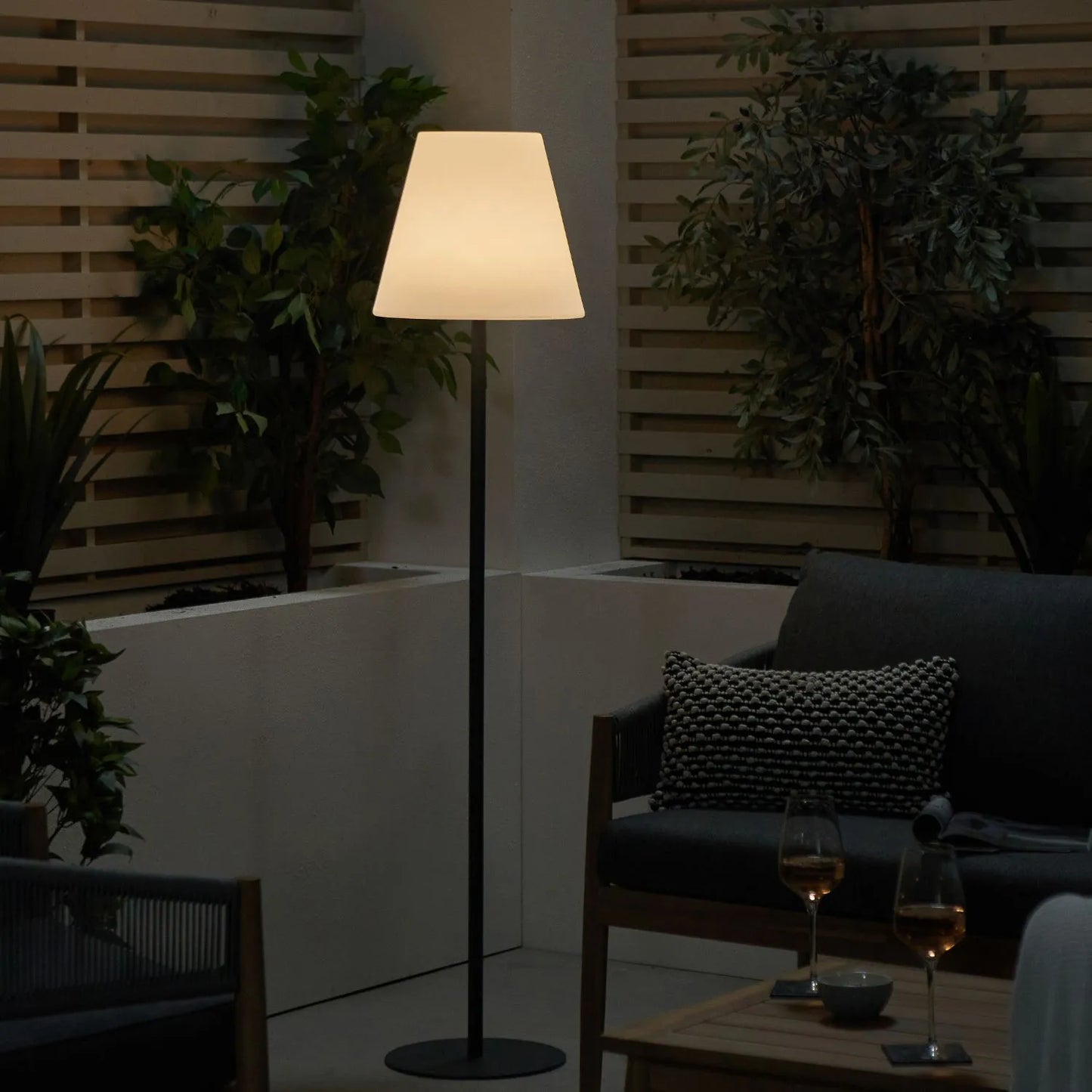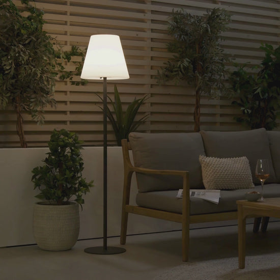 Make a statement in your outdoor space with this tall, floor-standing LED lamp in contemporary grey. Designed for patios, balconies, and garden seating areas, it delivers ambient lighting with a sleek, sculptural profile and vibrant glow. The rechargeable LED light and wireless design allow you to place it wherever it’s needed — no cables, plugs or sockets required.