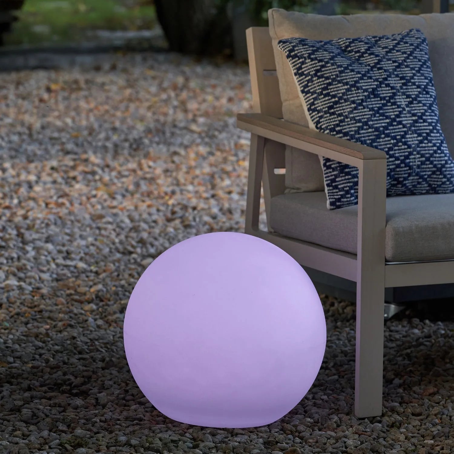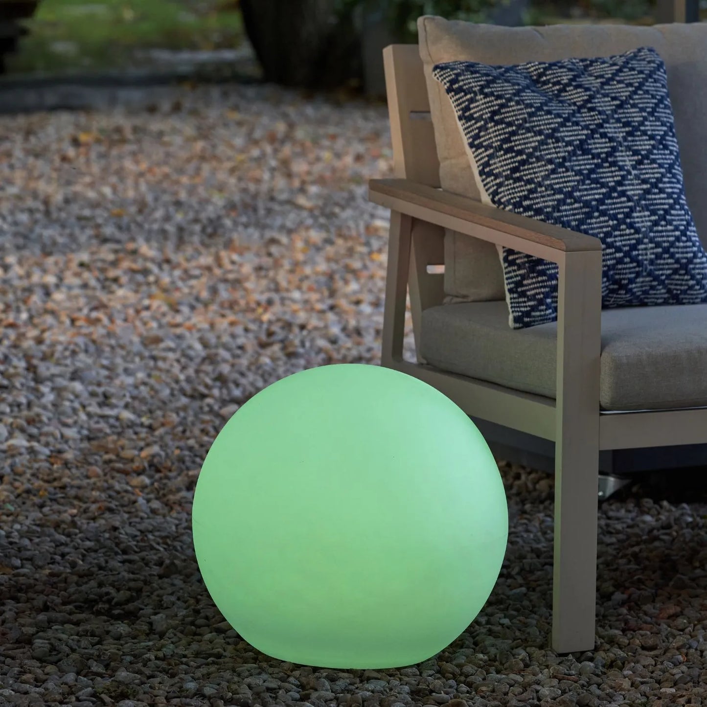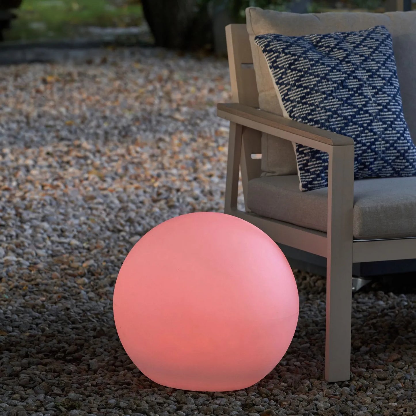 Bring bold style and ambient lighting to your garden, patio, or balcony with this large outdoor LED sphere light. Designed to make a statement, it features a built-in rechargeable LED light that offers vivid colour-changing effects and a soft, atmospheric glow. With no cables or plugs required, this cordless design can be positioned wherever you need a decorative highlight or impactful lighting – from the lawn to a seating area or poolside.