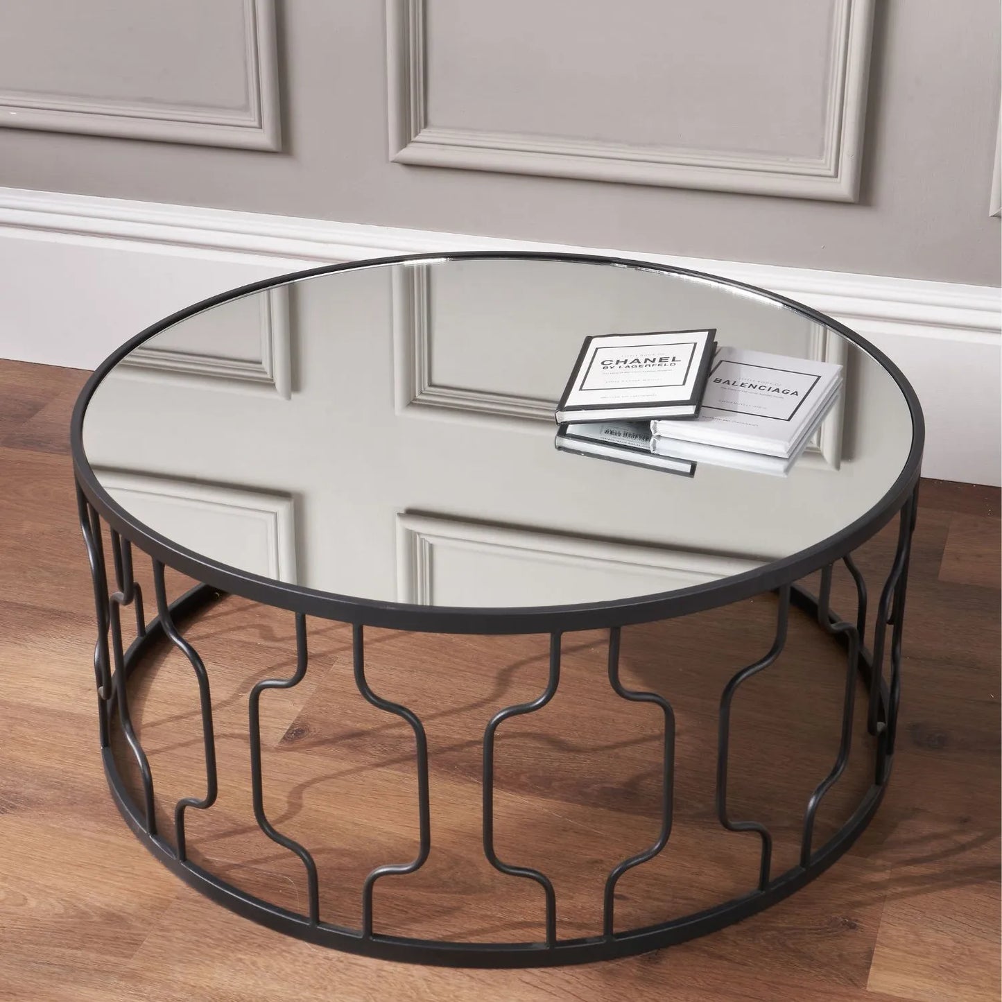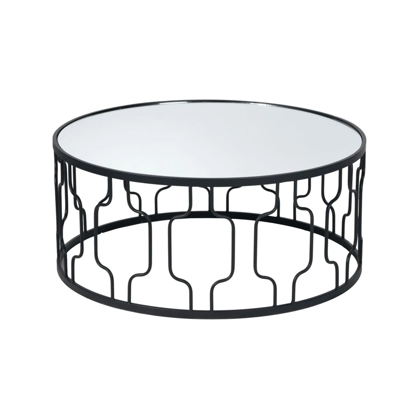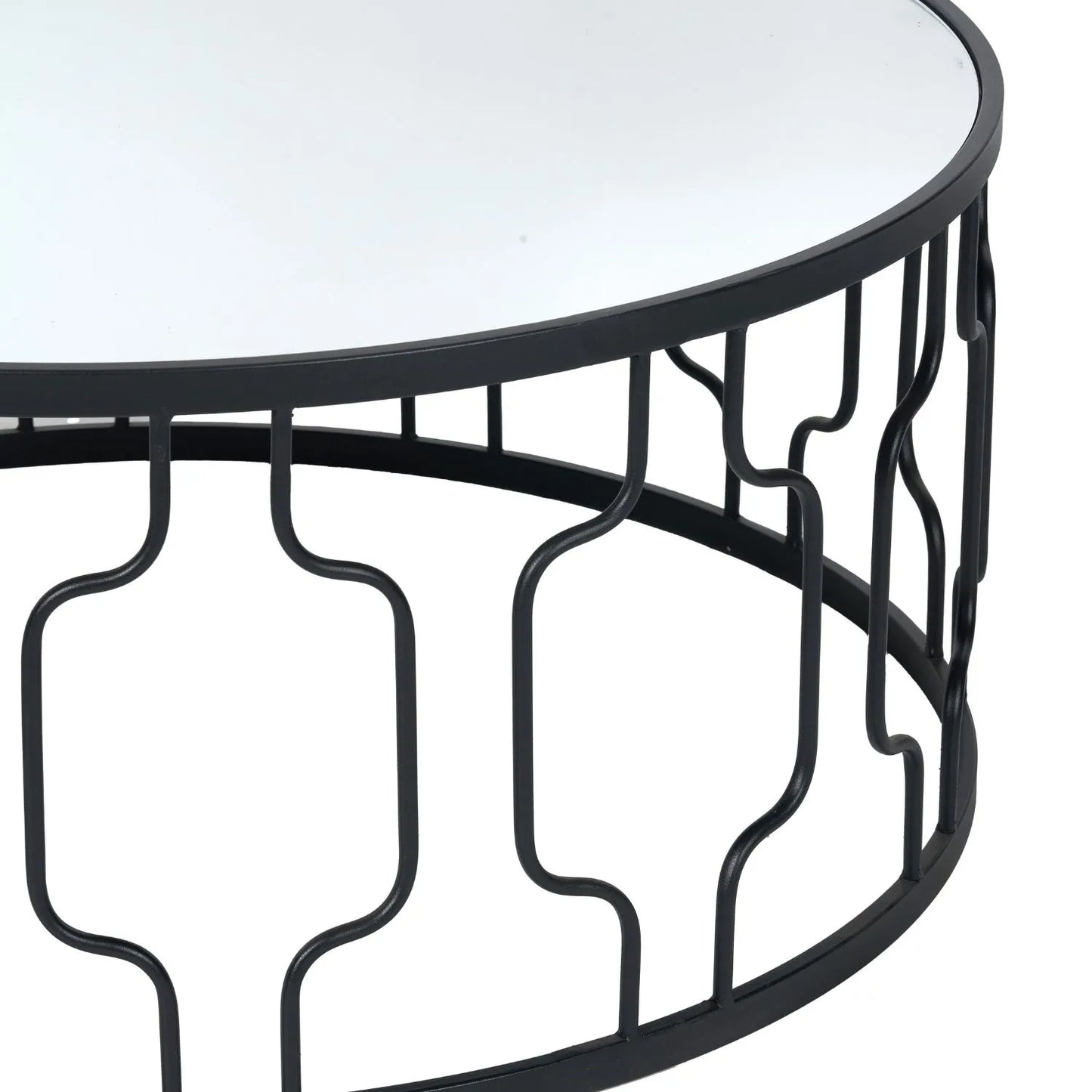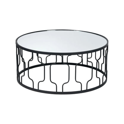 - Round coffee table with black graphite iron frame and mirrored glass top