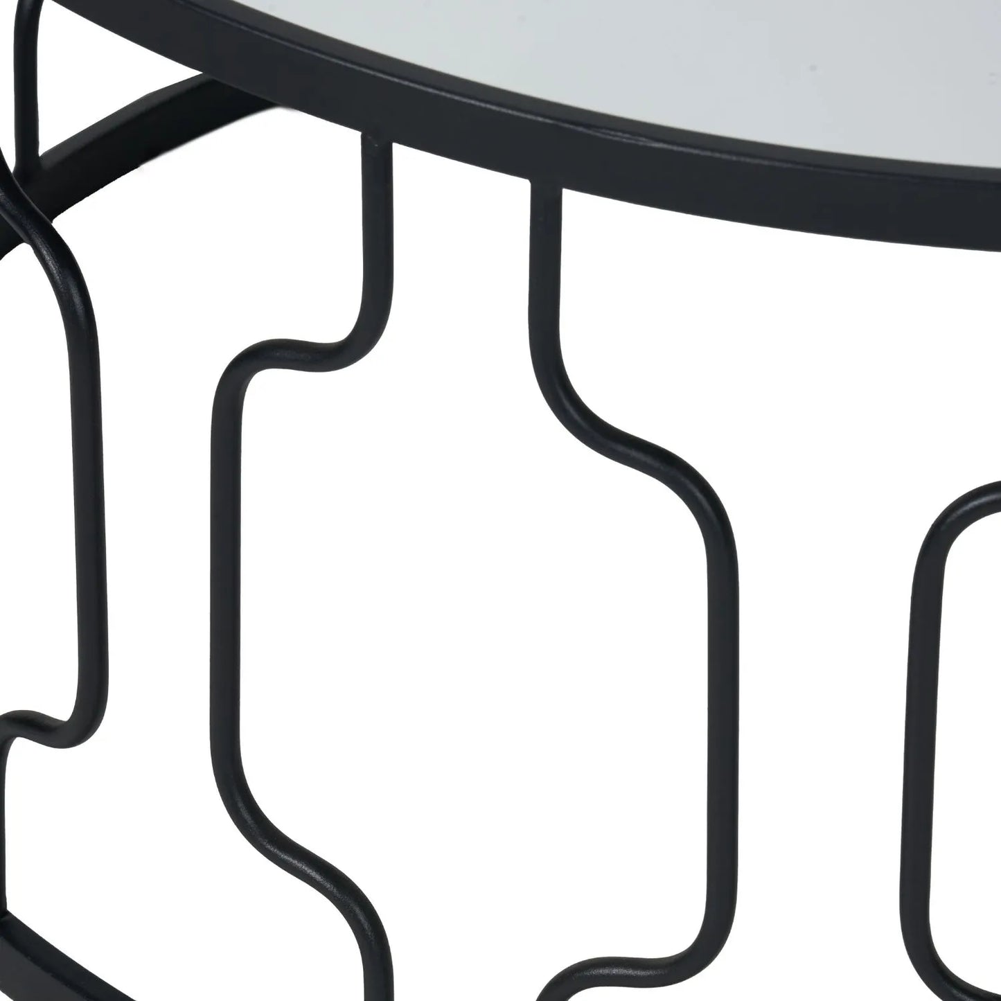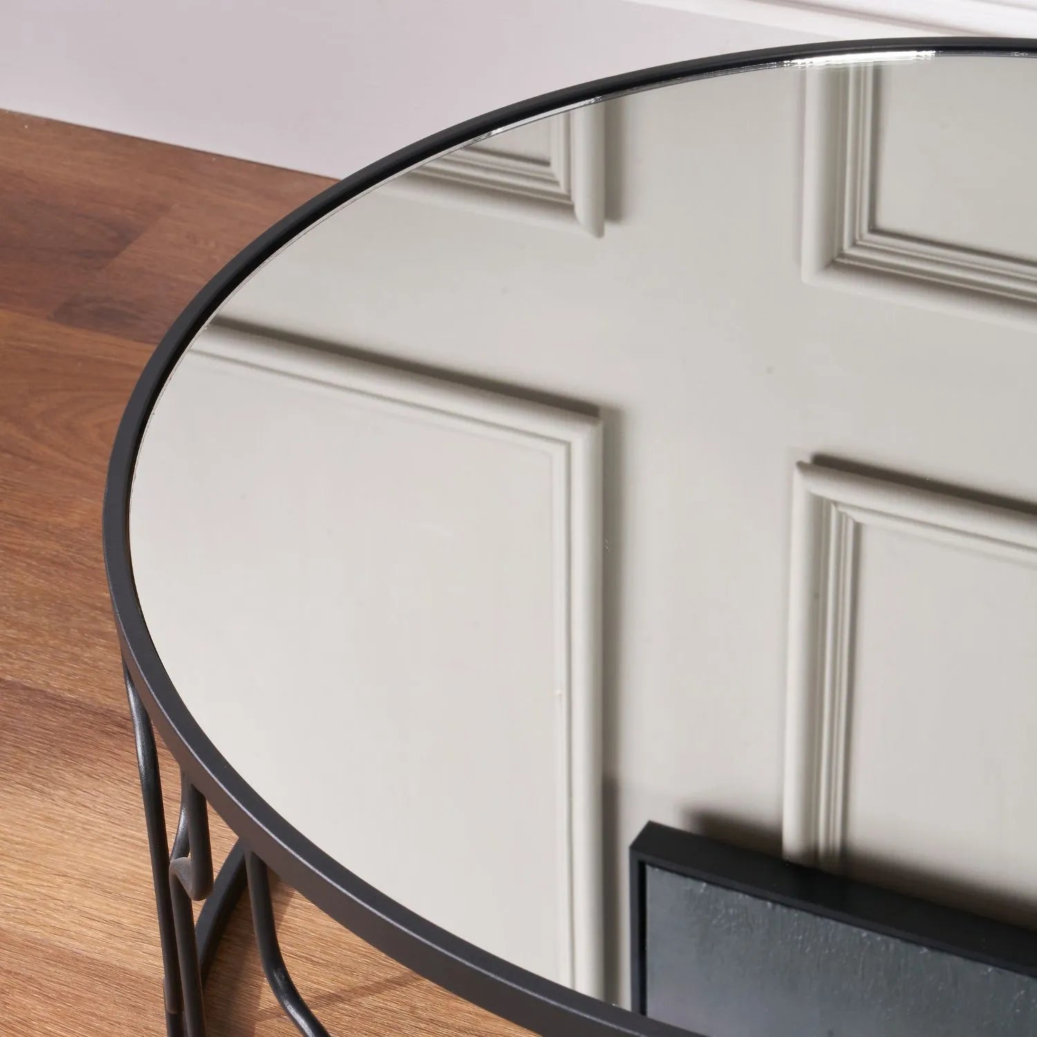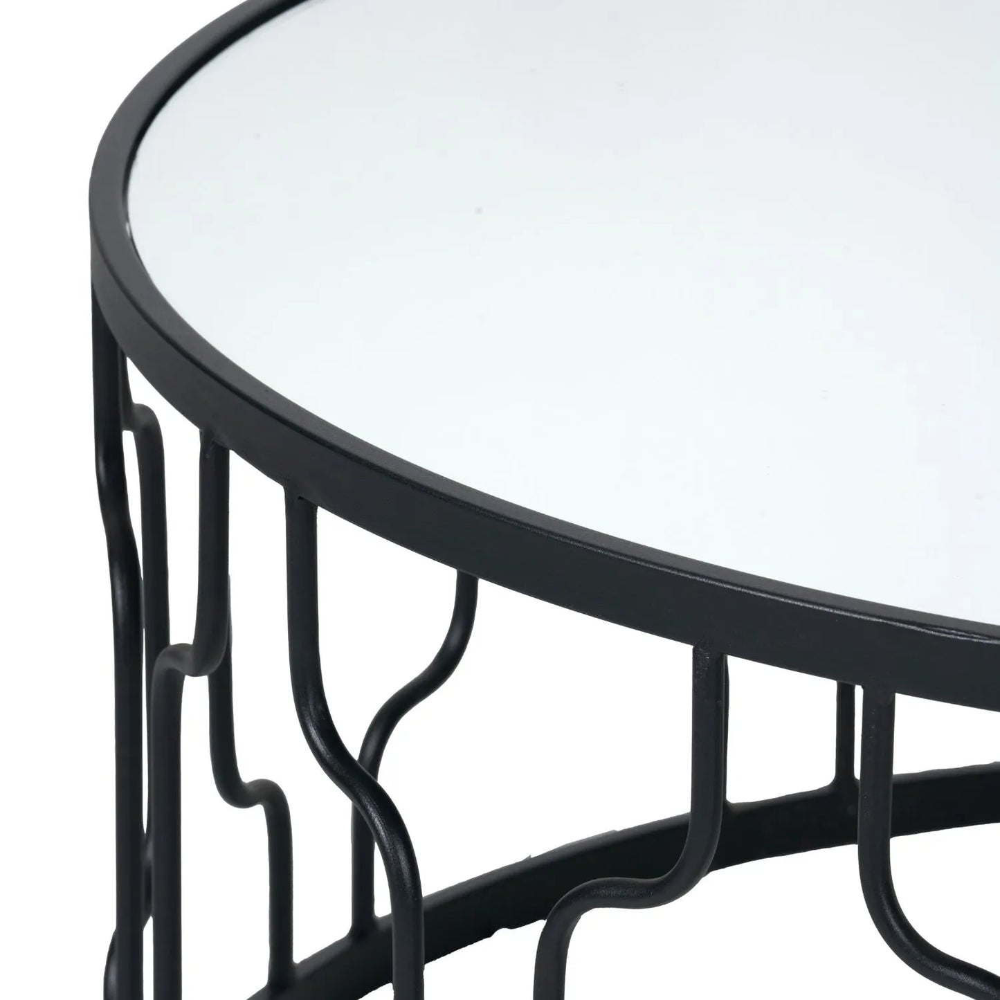 - Round coffee table with black graphite iron frame and mirrored glass top
