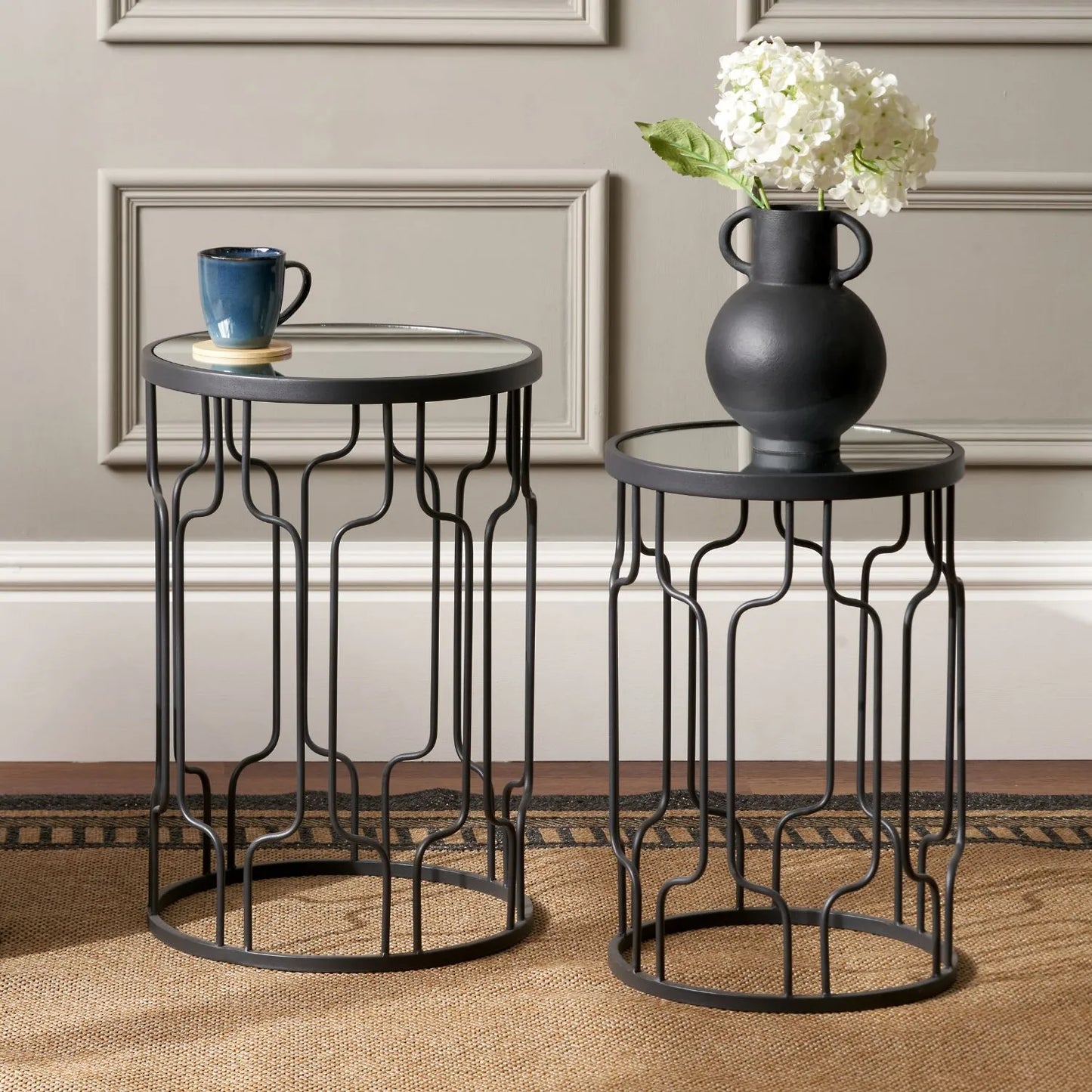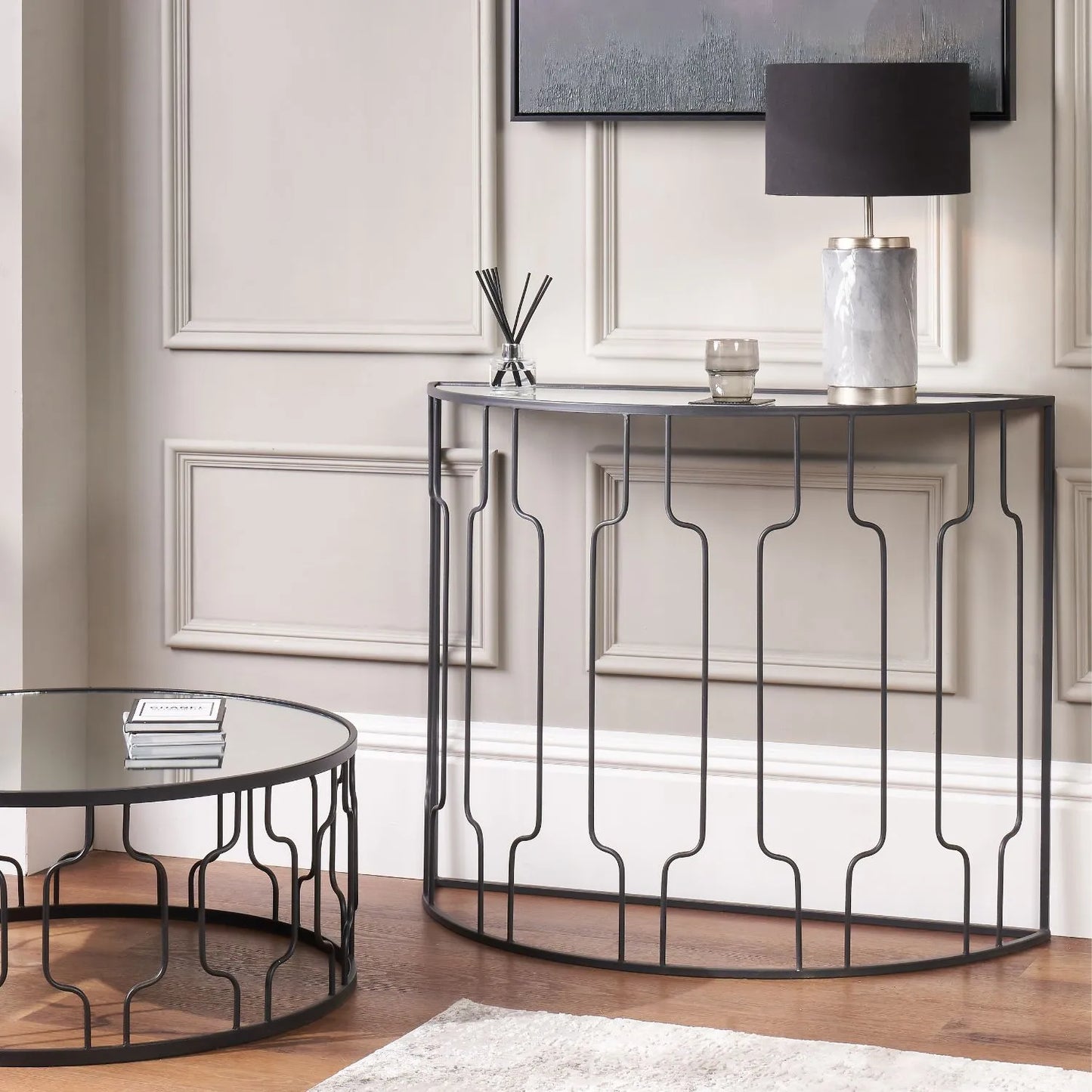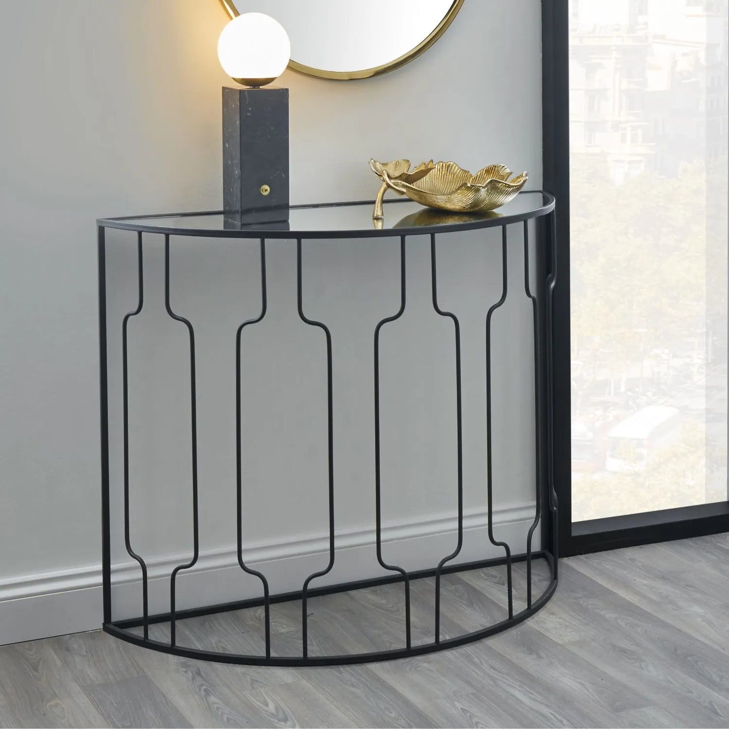 Crafted from powder-coated iron with a smooth graphite finish, the bold geometric base showcases clean lines and an open-frame design that enhances both space and light. The round mirrored glass top reflects its surroundings beautifully, helping to brighten the room. Whether styled with books, a display tray or decorative accents, it provides a refined yet functional surface for everyday use.