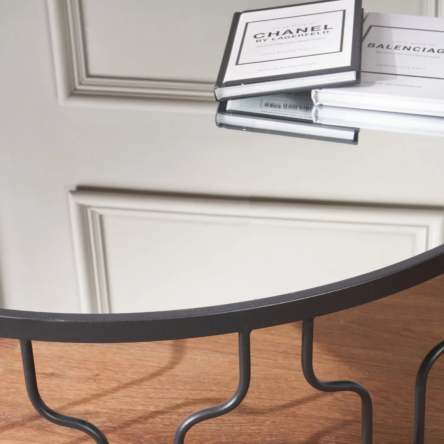 - Materials: Powder-coated black iron frame, mirrored glass top