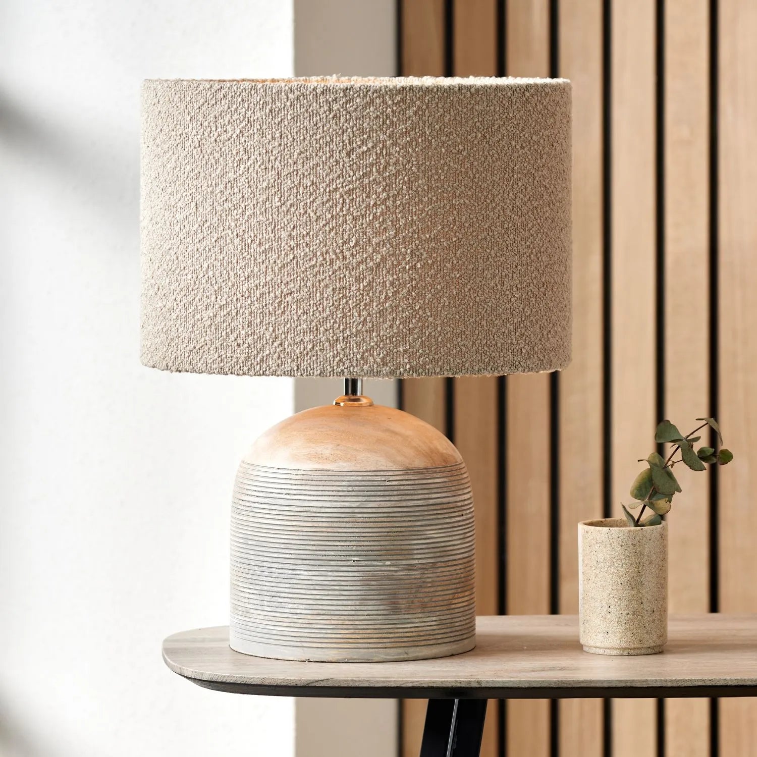 Recommended to pair with a 35cm lampshade, this grey-washed mango wood lamp base is available to purchase on its own or as a complete table lamp with your choice of shade – a 35cm white cotton drum shade, a 35cm natural linen drum shade, or a 35cm boucle-textured drum shade in soft taupe. Each shade features an open weave or textured surface for gentle light diffusion, casting a warm, ambient glow.