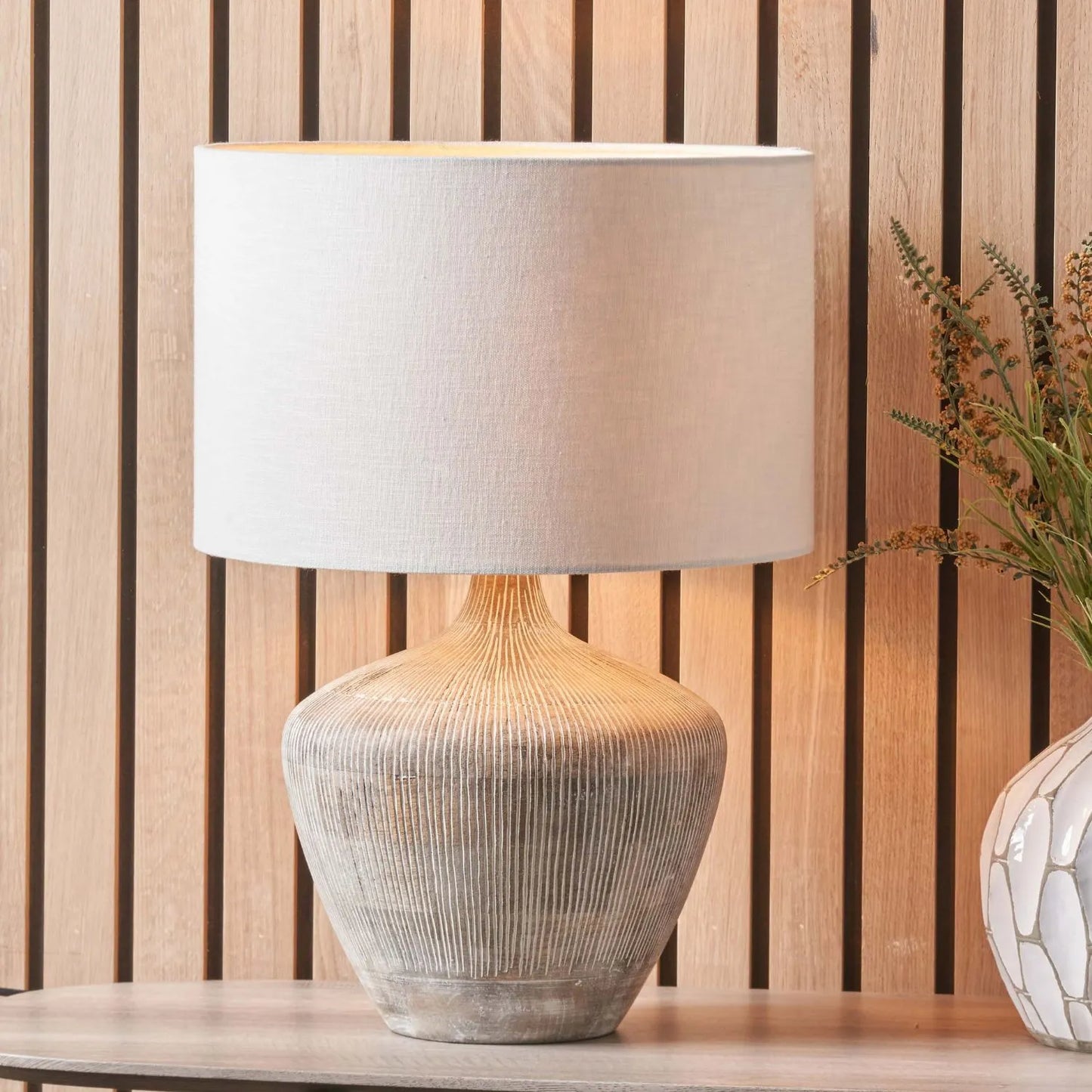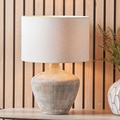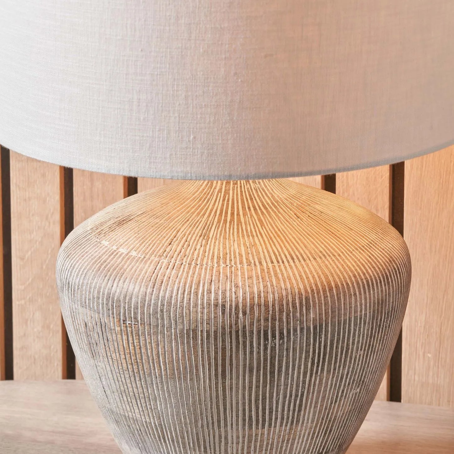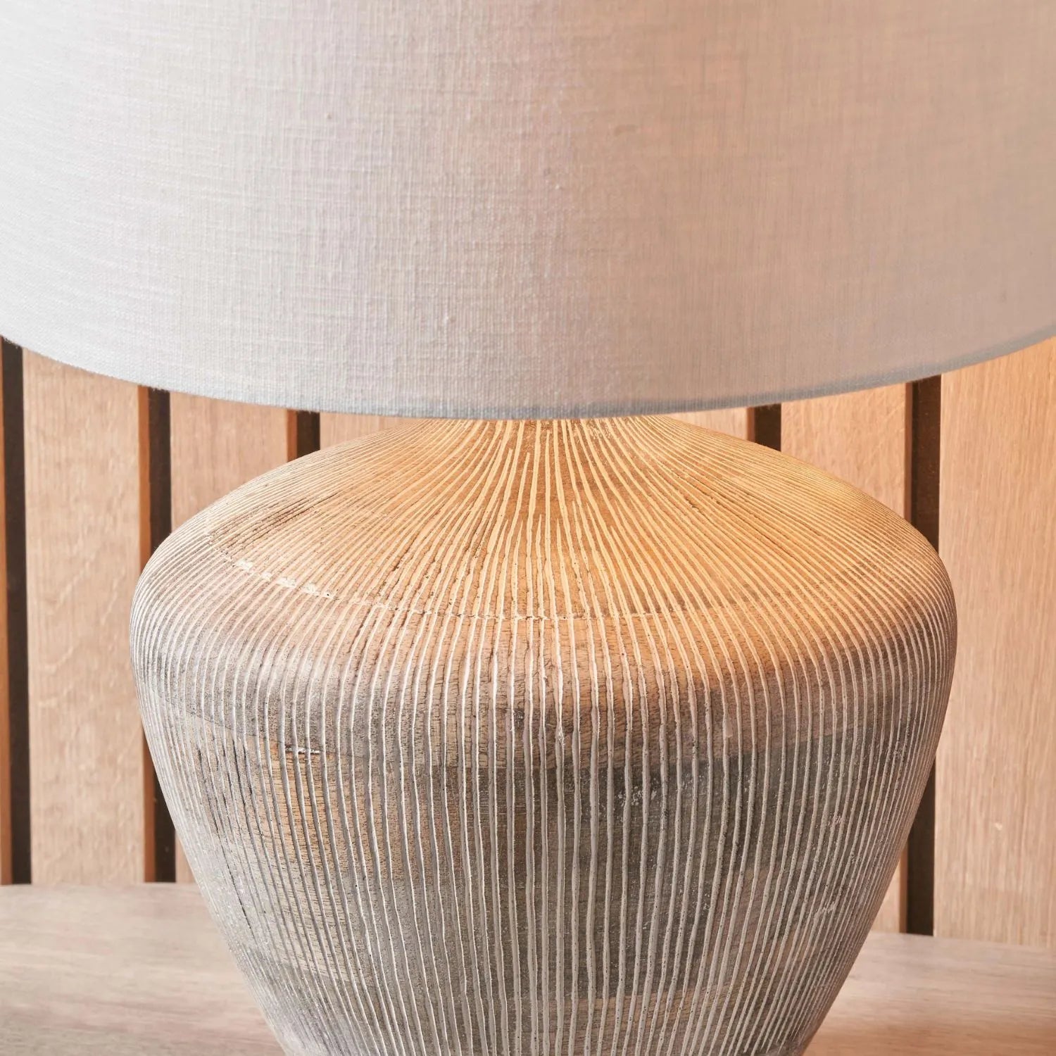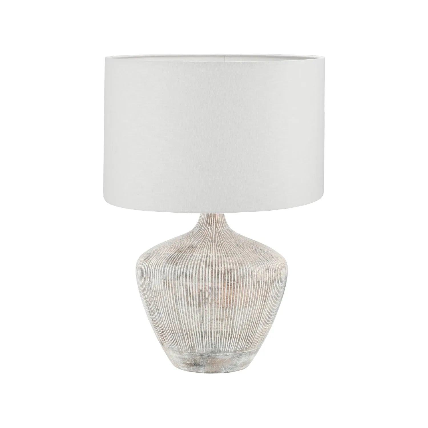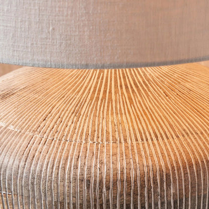 Rustic Whitewashed Mango Wood Table Lamp with Hand-Carved Vertical Line Detailing & White Linen Drum Shade – Rotund-Shaped Wooden Lamp 48x35x35cm