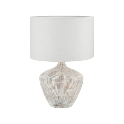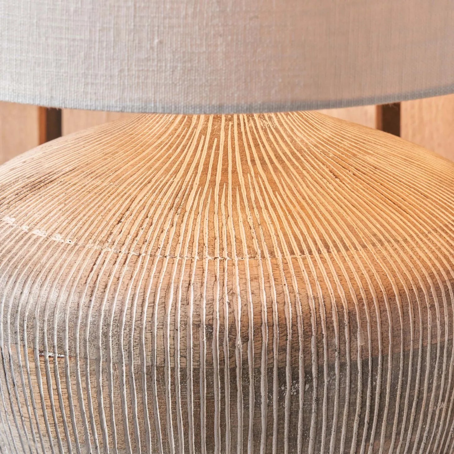 Introduce natural texture and timeless character to your interiors with this rustic whitewashed mango wood table lamp. Handcrafted from mango wood, the gently rounded, rotund-shaped base features hand-carved vertical linework and a pale whitewashed finish for a light, artisanal look that complements both modern neutral and traditional interiors.