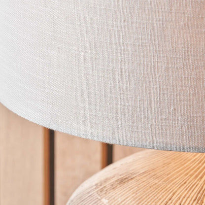 This complete wooden table light pairs the carved mango wood base with a 35cm white drum lampshade. Made from 100% linen, the self-lined shade features a refined open-weave texture that gently filters the light, creating a soft and inviting glow. Its clean, modern profile offers a versatile styling option for bedrooms, living rooms, hallways or cosy reading corners.