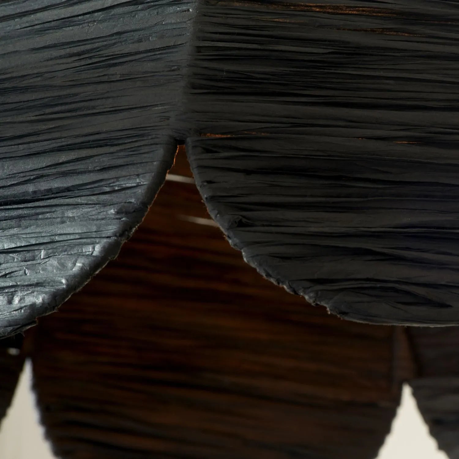 Made from sustainable natural raffia — a lightweight fibre derived from palm leaves — the shade is carefully wrapped to create a tactile, semi-sheer finish. The soft black colouring diffuses light gently, casting a warm yet moody glow that complements minimalist, monochrome and earthy-toned interiors. A scalloped edge forms a petal-inspired silhouette, adding movement and visual interest to the design.