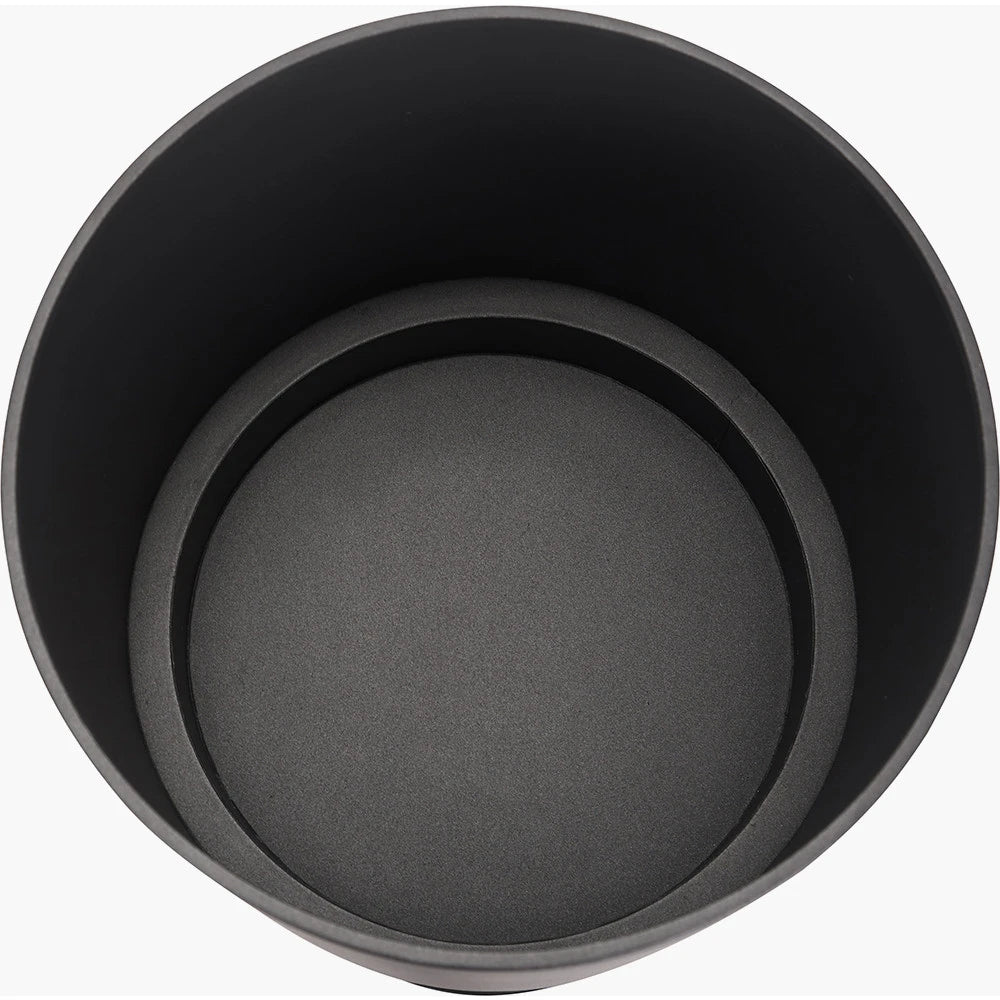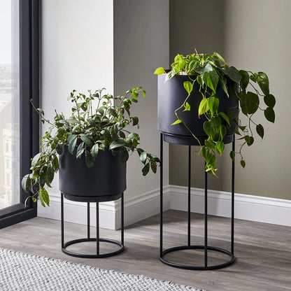 Add a modern touch to your home with this set of two matt black metal planters on stands. Featuring sleek circular shapes and clean lines, these raised planters are made from durable iron with a contemporary matt black finish. The set includes two sizes for versatile styling options. The large planter measures 76cm in height with a 32cm diameter, while the smaller one stands at 46cm tall with a 28cm diameter, making them ideal for showcasing a mix of greenery or flowers indoors.