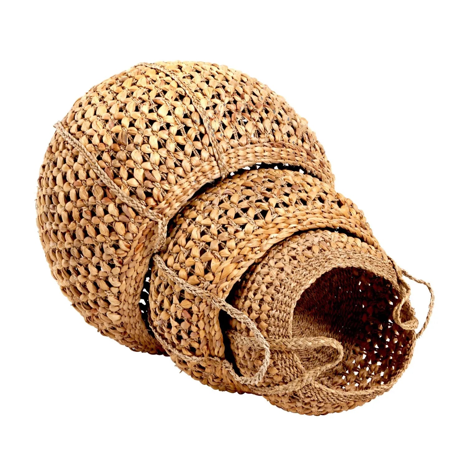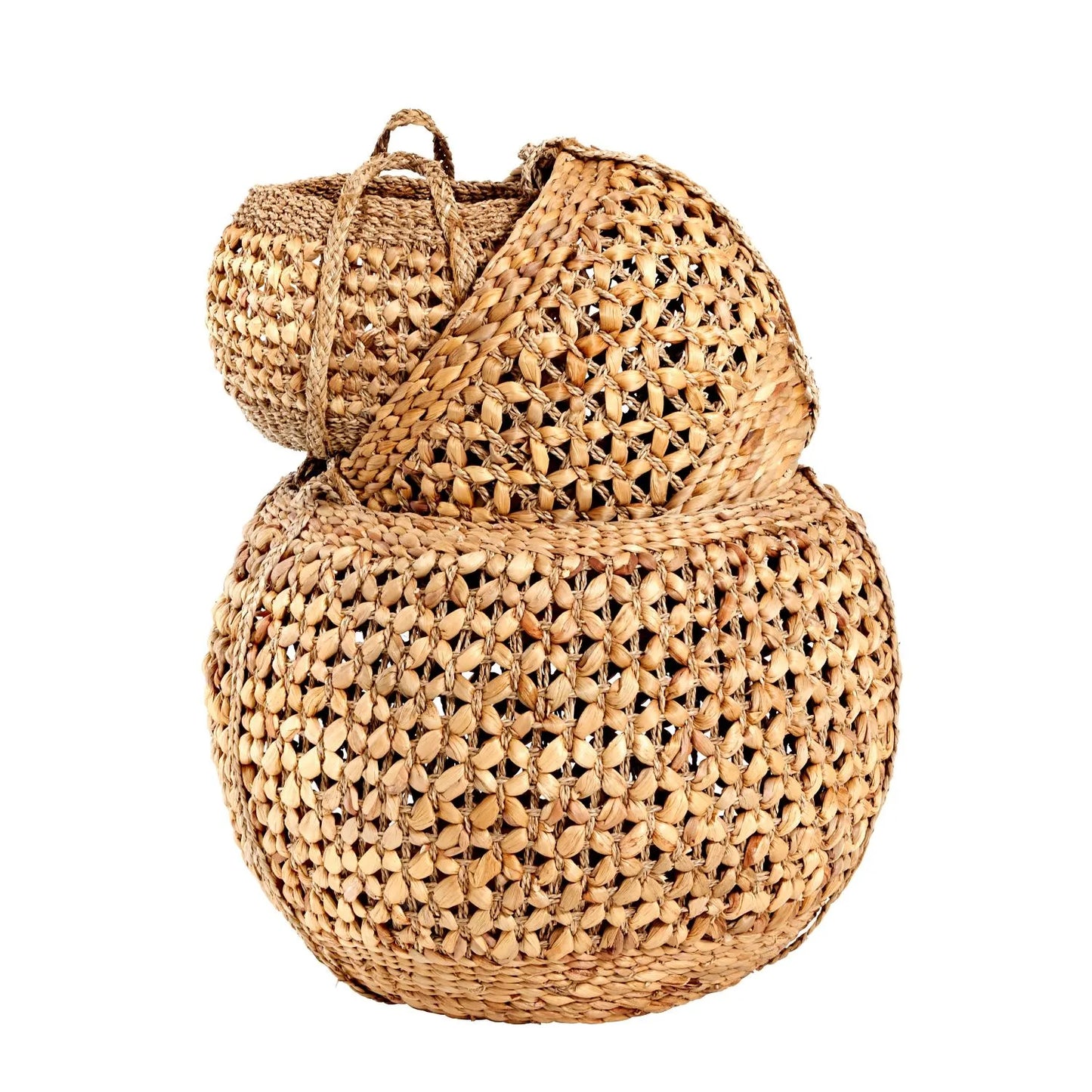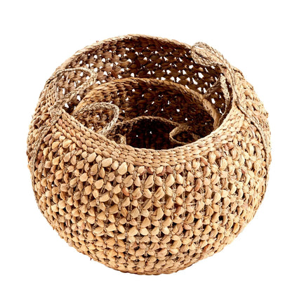 Add neutral charm and practical storage to your home with this set of three round natural water hyacinth baskets with handles. Handwoven with care, these baskets feature a stunning open-weave design that showcases the organic beauty of water hyacinth while ensuring durability. The handles are plated with additional woven water hyacinth, extending seamlessly down the sides of each basket for added strength and a striking decorative detail.
