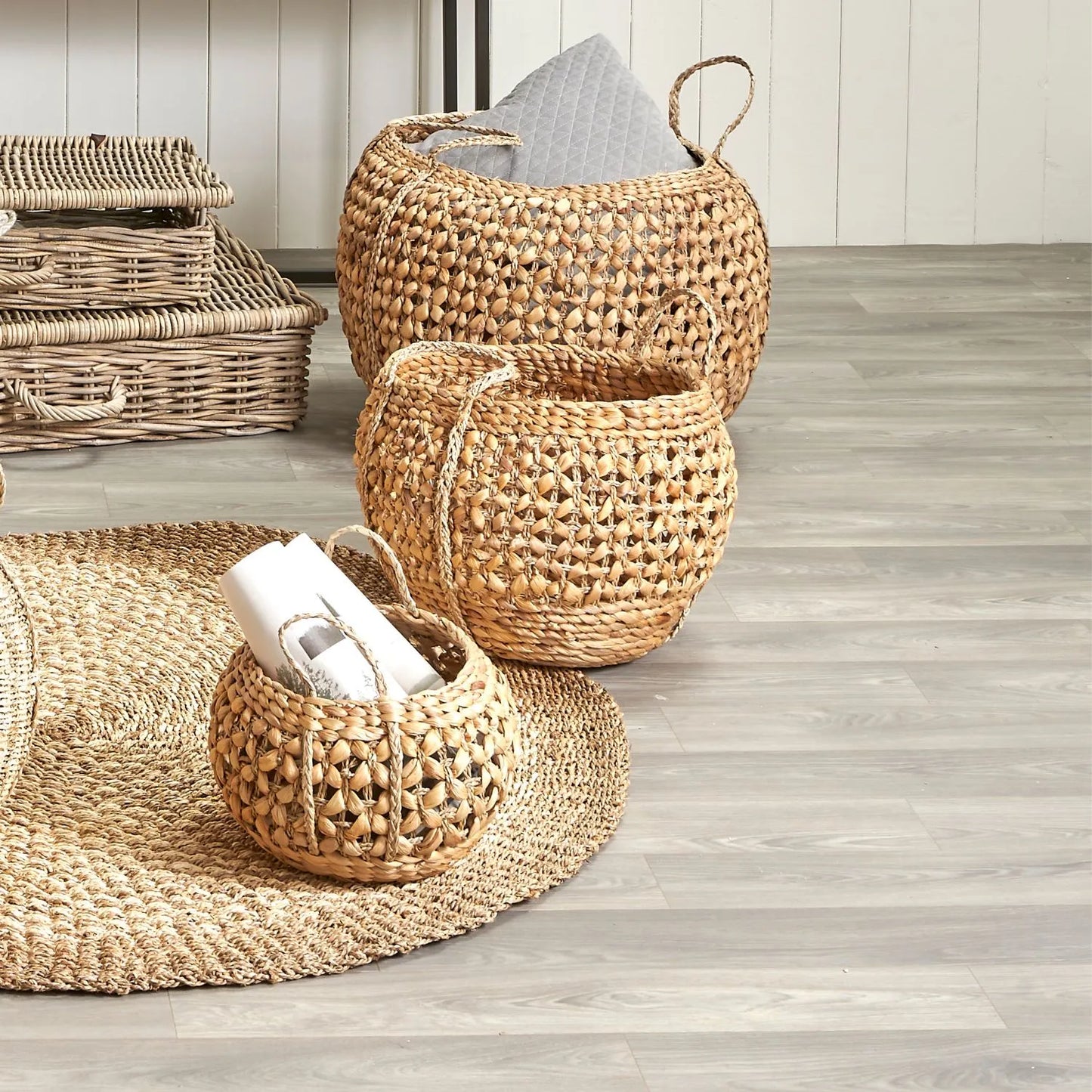 Set of Three Round Natural Water Hyacinth Baskets with Handles – Handwoven Decorative Storage 40x56x56cm
