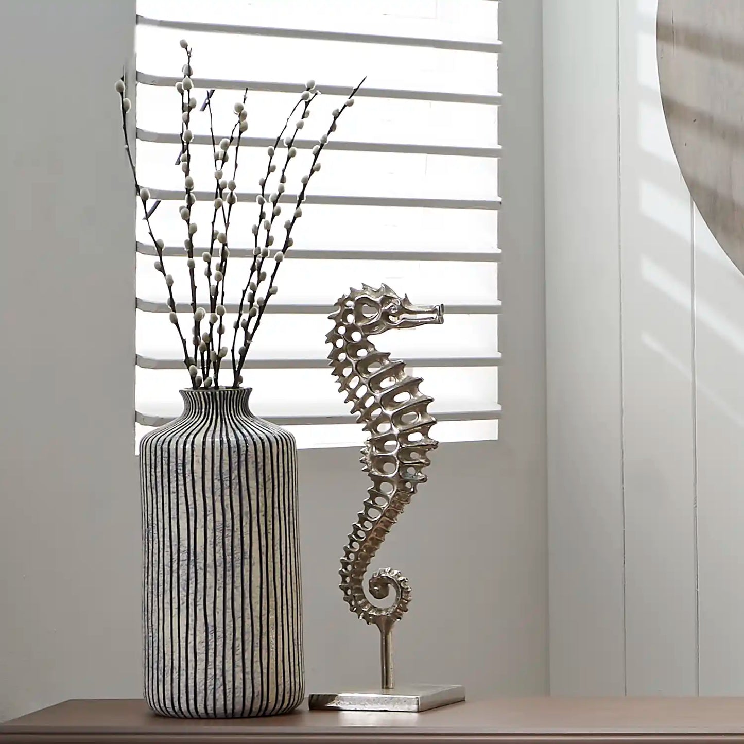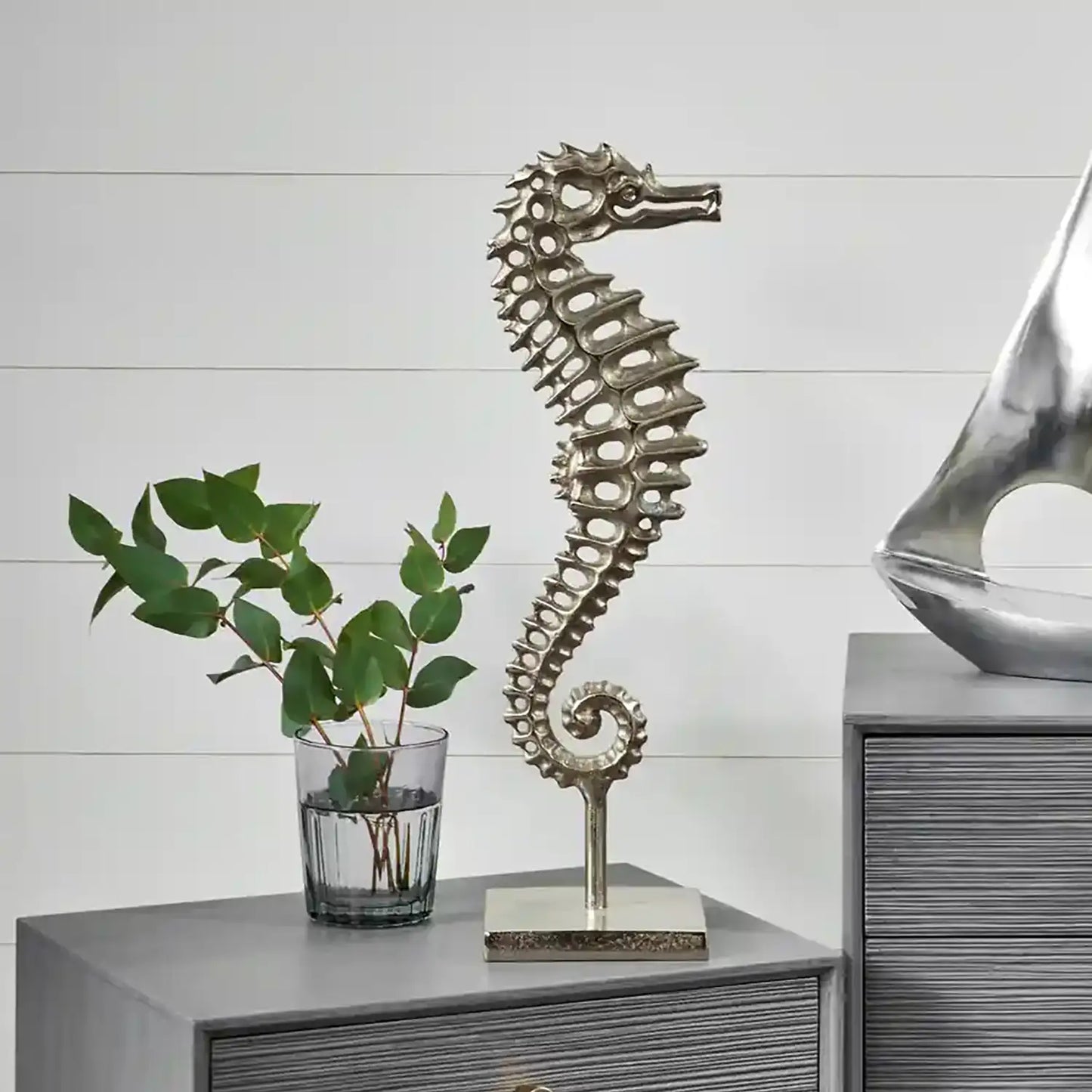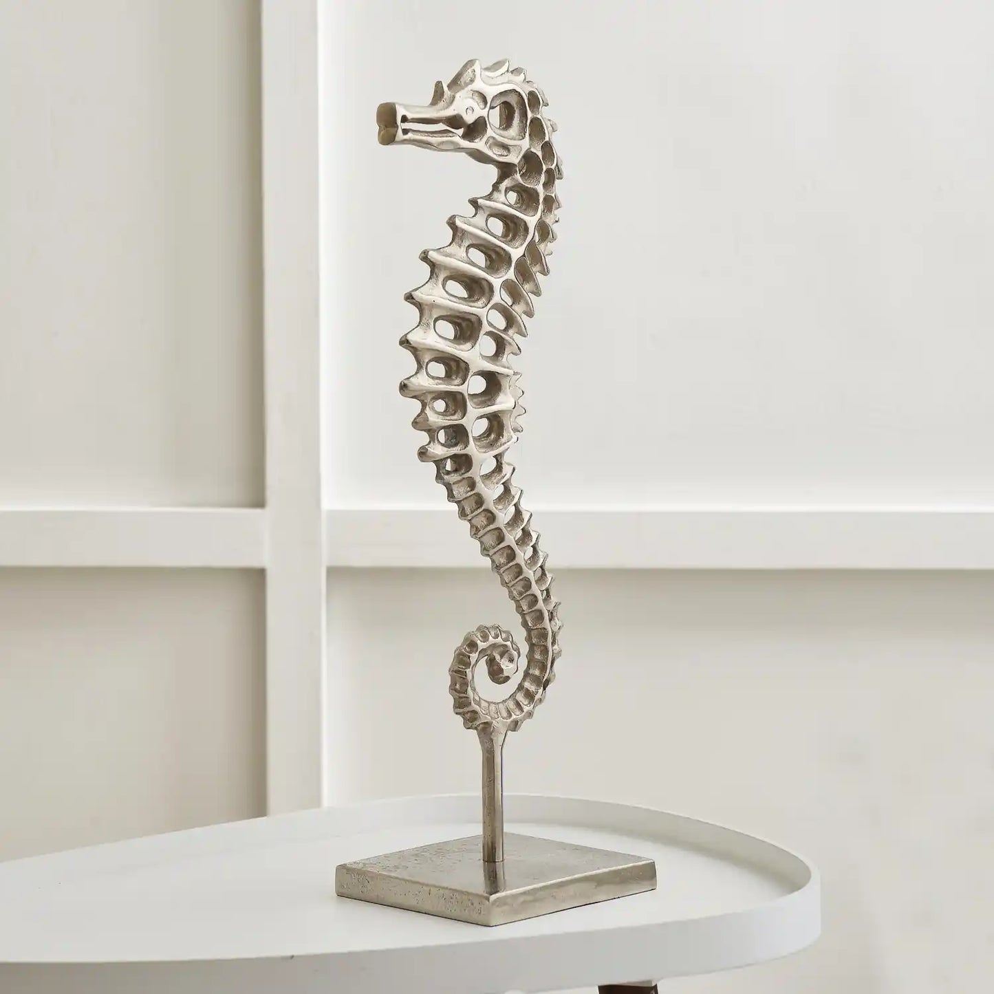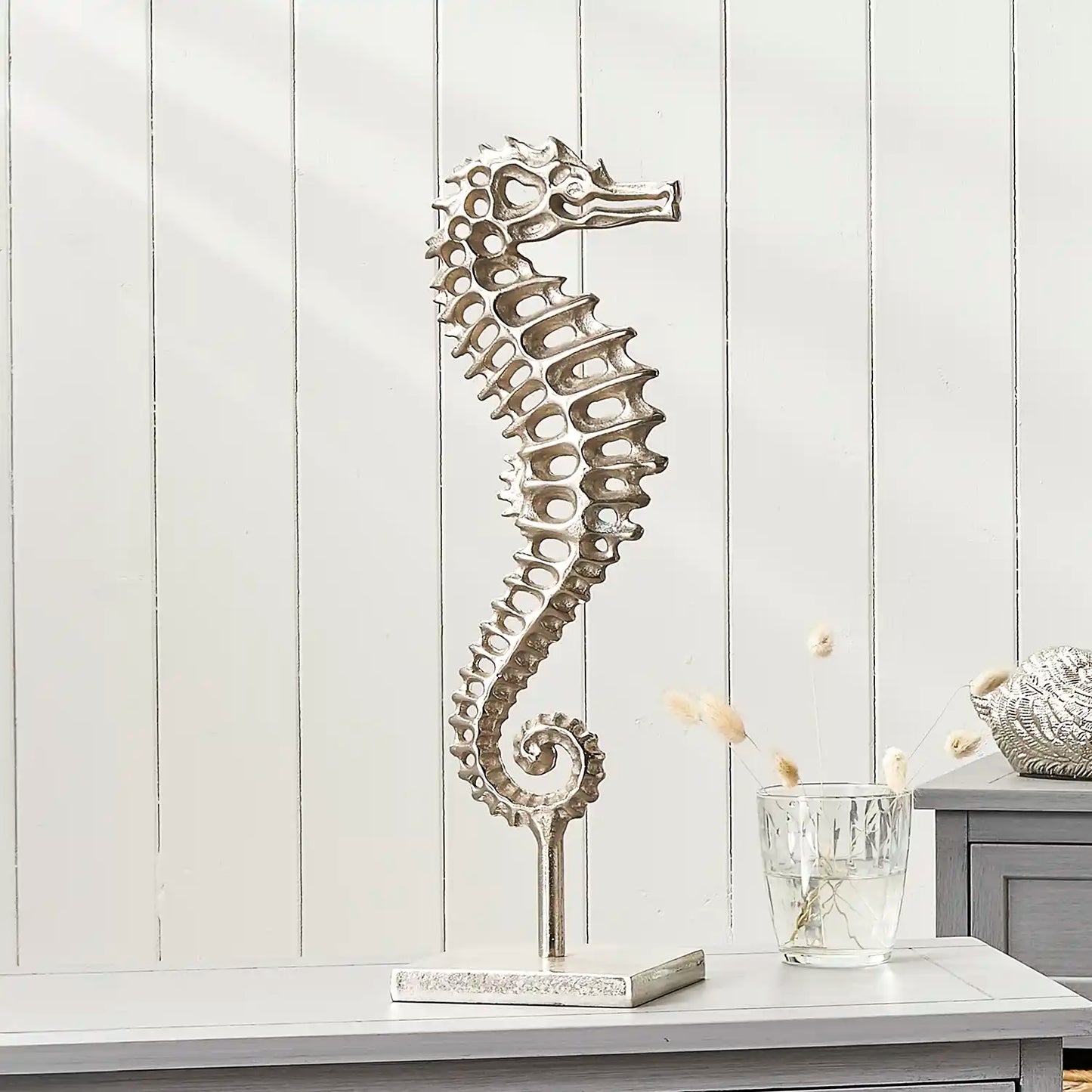 Add a splash of coastal cool to your home with our silver seahorse ornament. This stunning piece blends modern design with a nautical twist, making it a perfect pick for your hallway, living room, kitchen, bedroom, or even bathroom. Made from aluminium and finished with a shiny nickel plating, this seahorse sculpture is all about the details. It's got that fresh-from-the-ocean coastal feel. Whether this silver seahorse lives on your mantel, a side table, or your favourite bookshelf, this ornament brings a stylish touch that's as unusual as it is elegant.