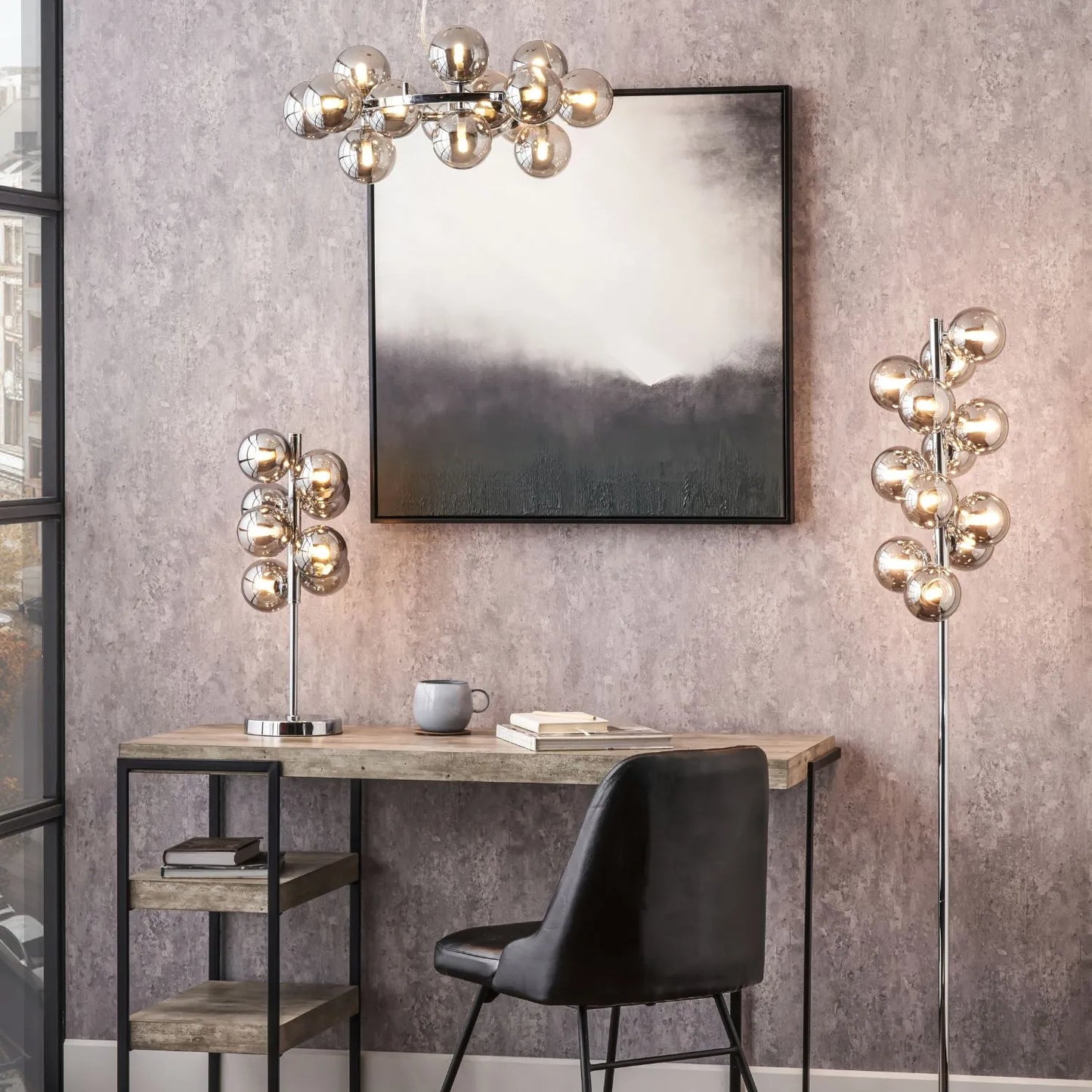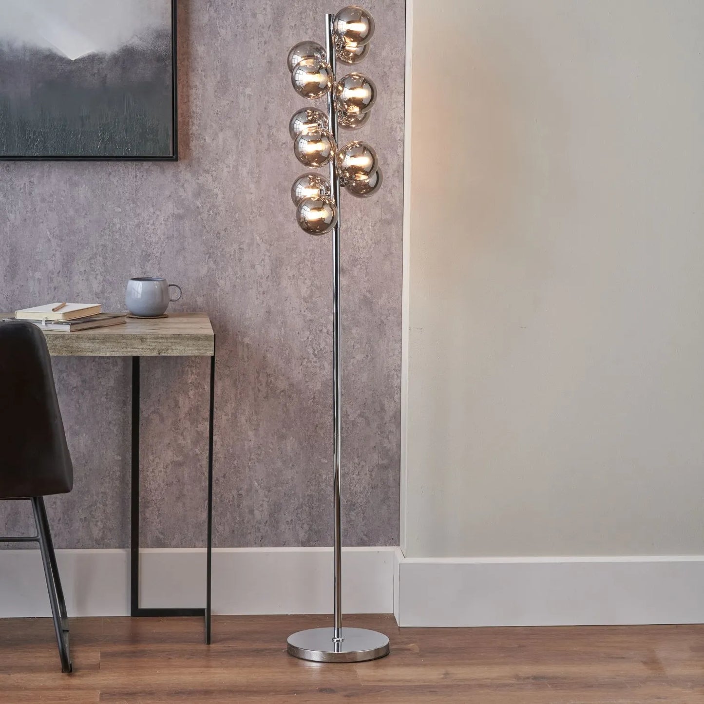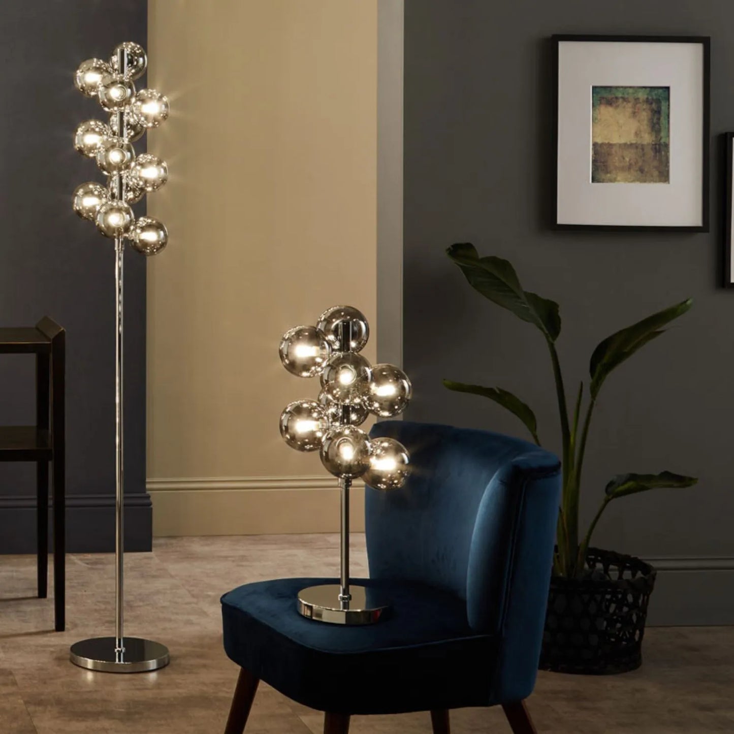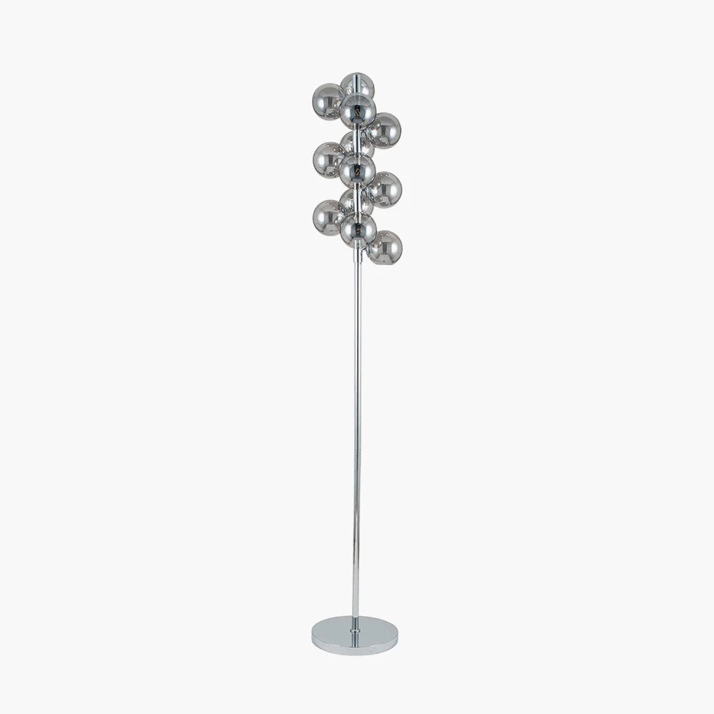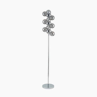 Bring sleek silver sophistication to your home with this smoked glass orb chrome floor-standing lamp. Featuring 12 smoked glass ball shades, this striking design blends modern style with everyday functionality. The glass balls are elegantly arranged in a cascading formation along a slim, silver chrome pole, creating a sculptural focal point that draws the eye. A sturdy circular chrome base and narrow design make it ideal for smaller spaces, delivering high-quality lighting without taking up too much room.