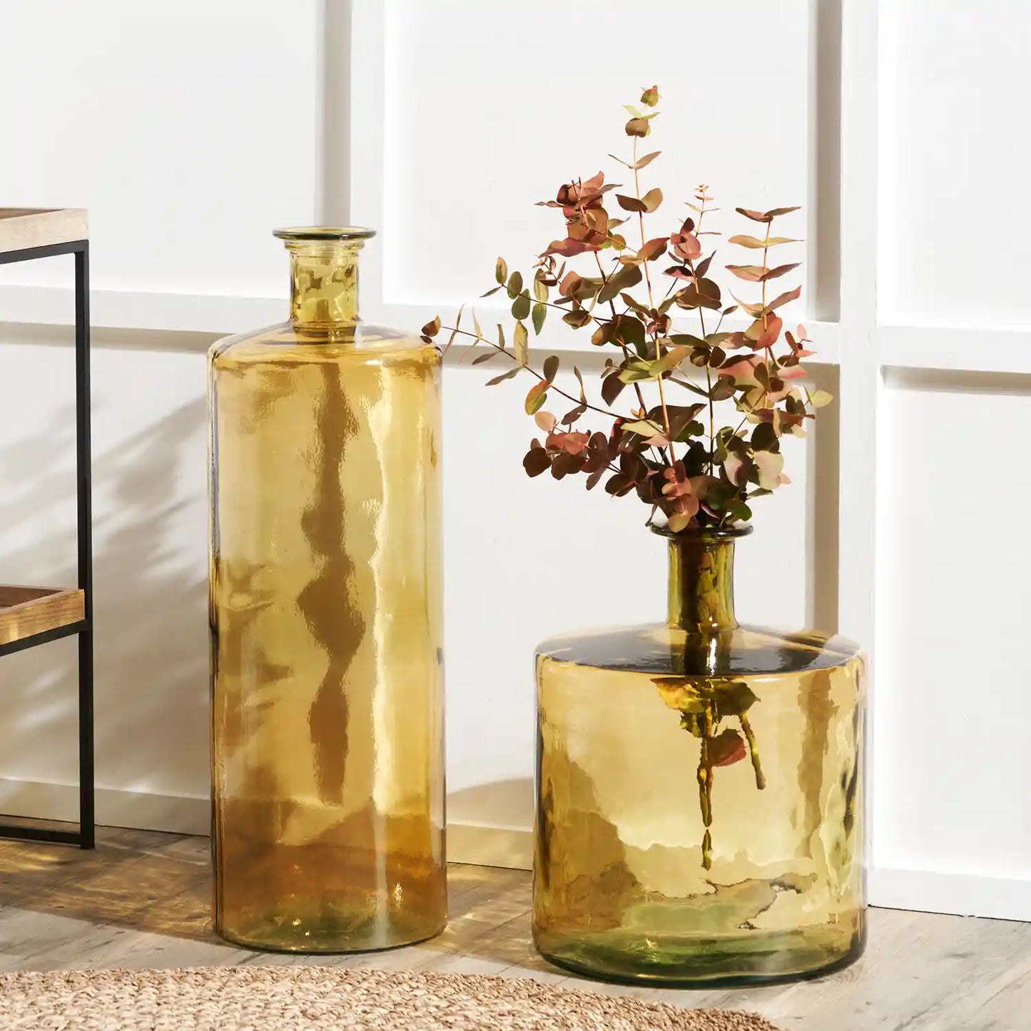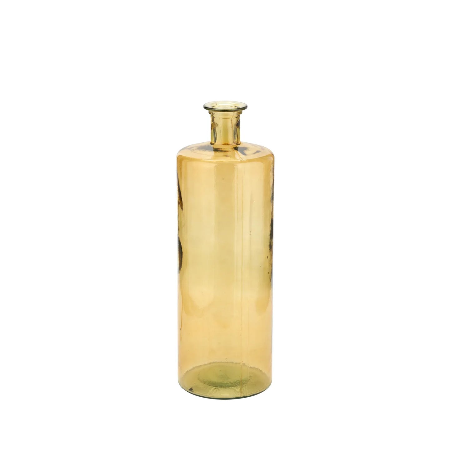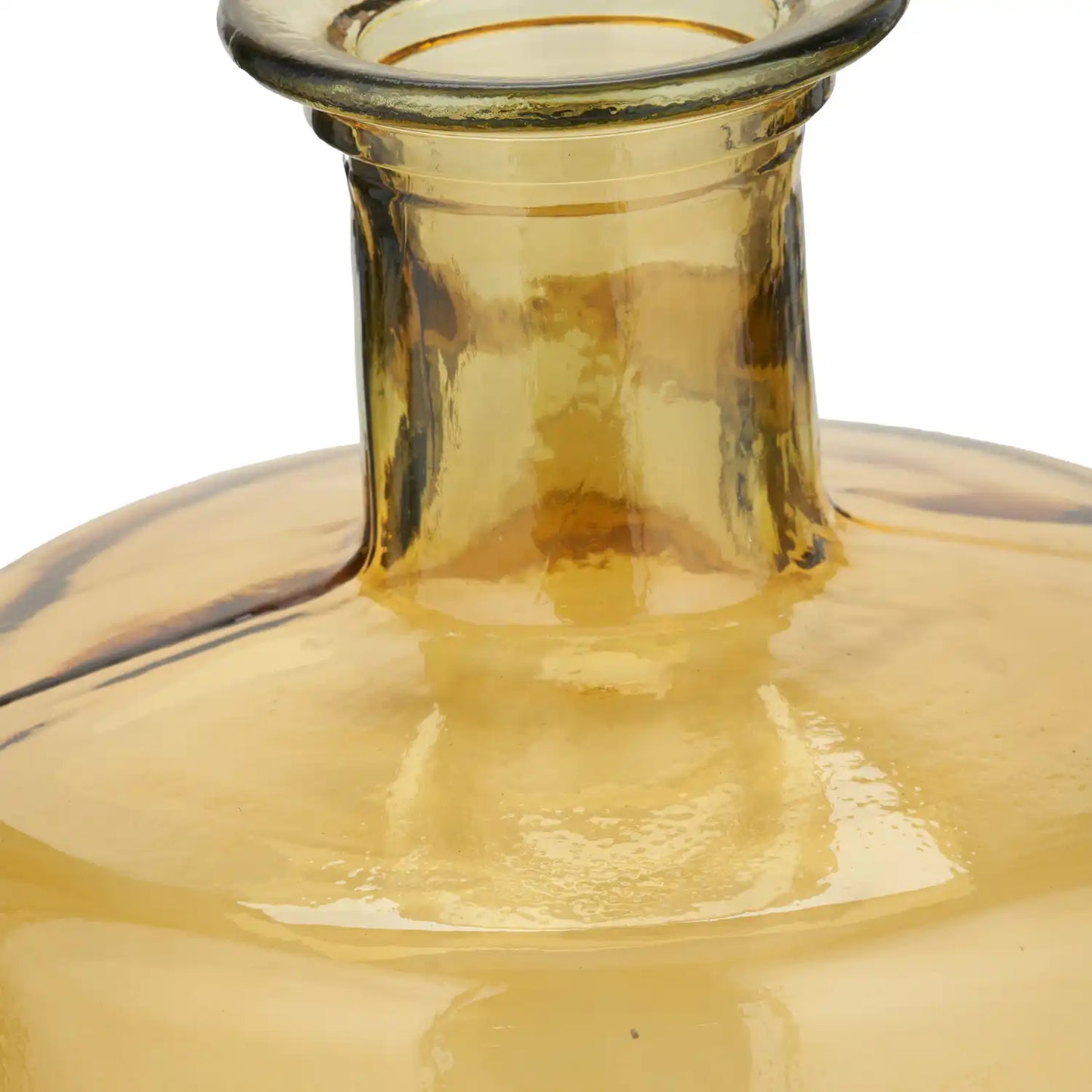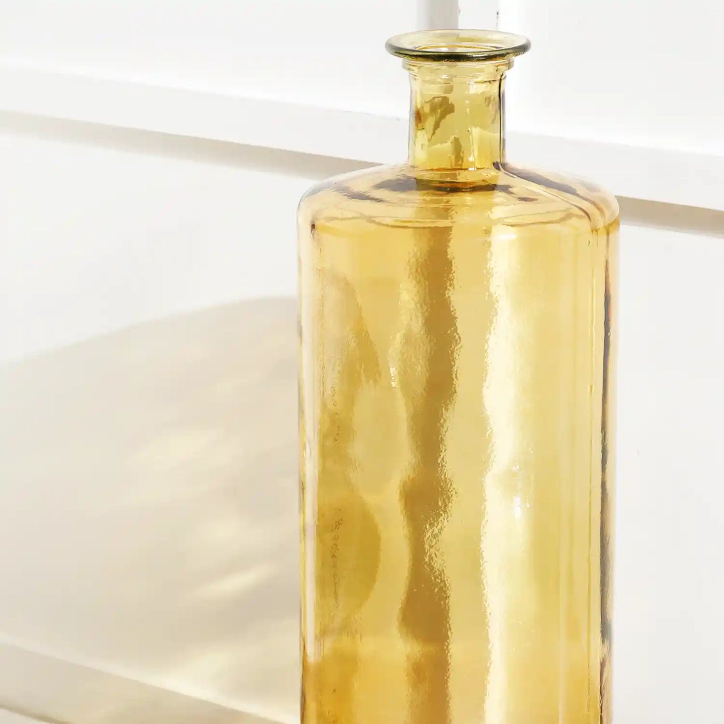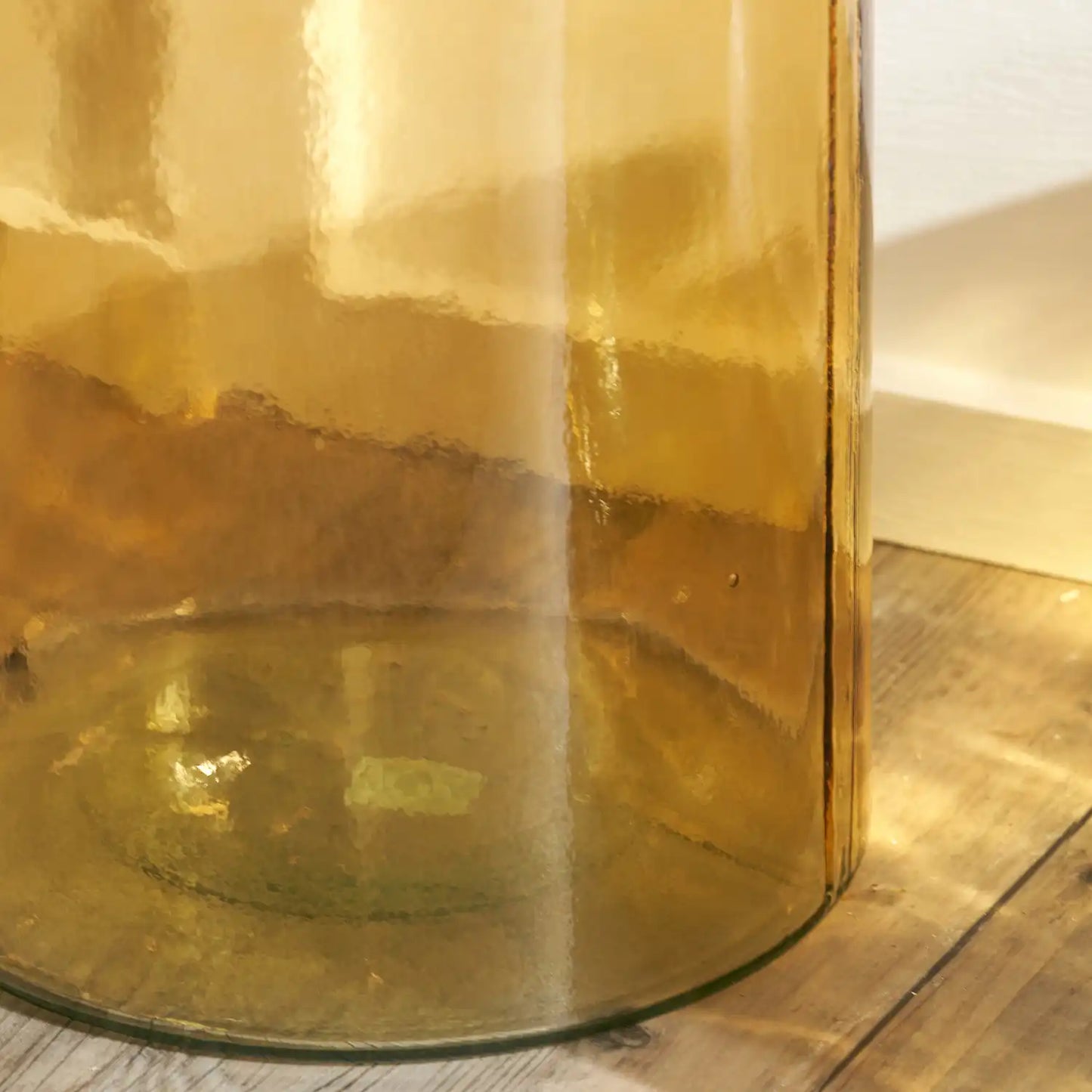 This striking tall amber yellow recycled glass bottle vase is floor-standing, adding a warm pop of colour to your home. The tall glass vase captures the light and softens any space with its smooth, amber tint and sustainable, recycled glass.