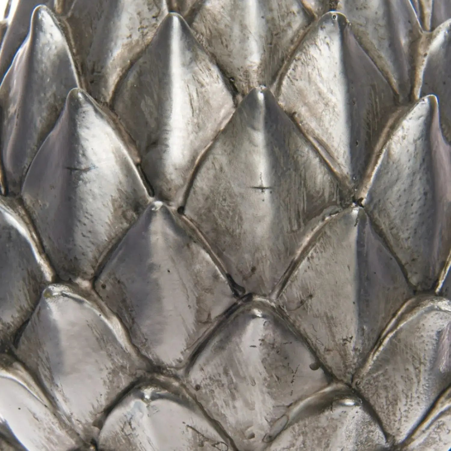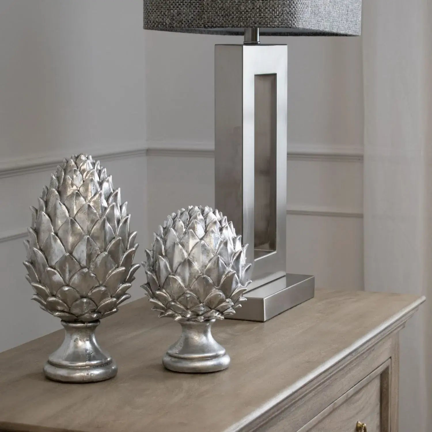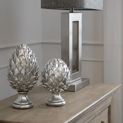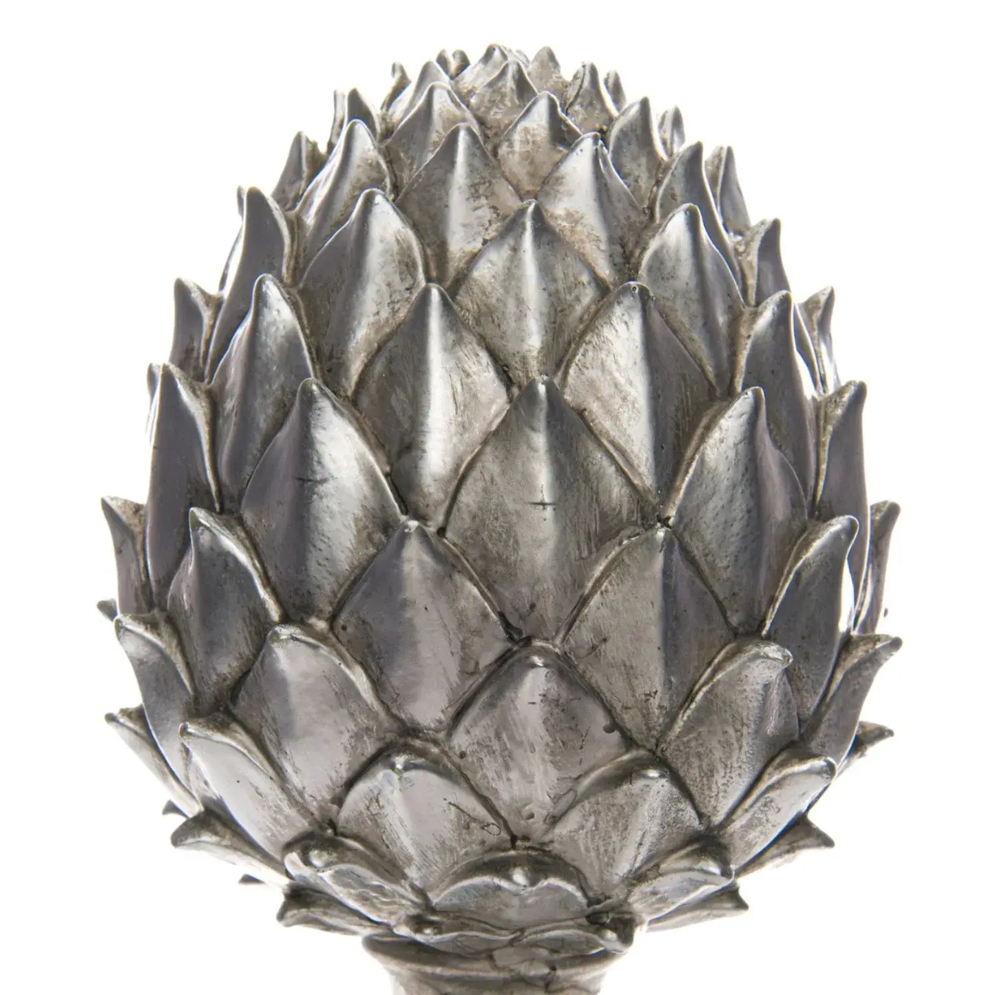 Bring a touch of sophistication to your decor with this tall silver ceramic pinecone ornament on a pedestal stand. Featuring an intricately detailed pinecone design with a rich metallic silver finish, this decorative finial adds timeless elegance to your home. The pedestal base enhances its height and presence, making it a stylish addition to console tables, mantelpieces, or dining table centrepieces.