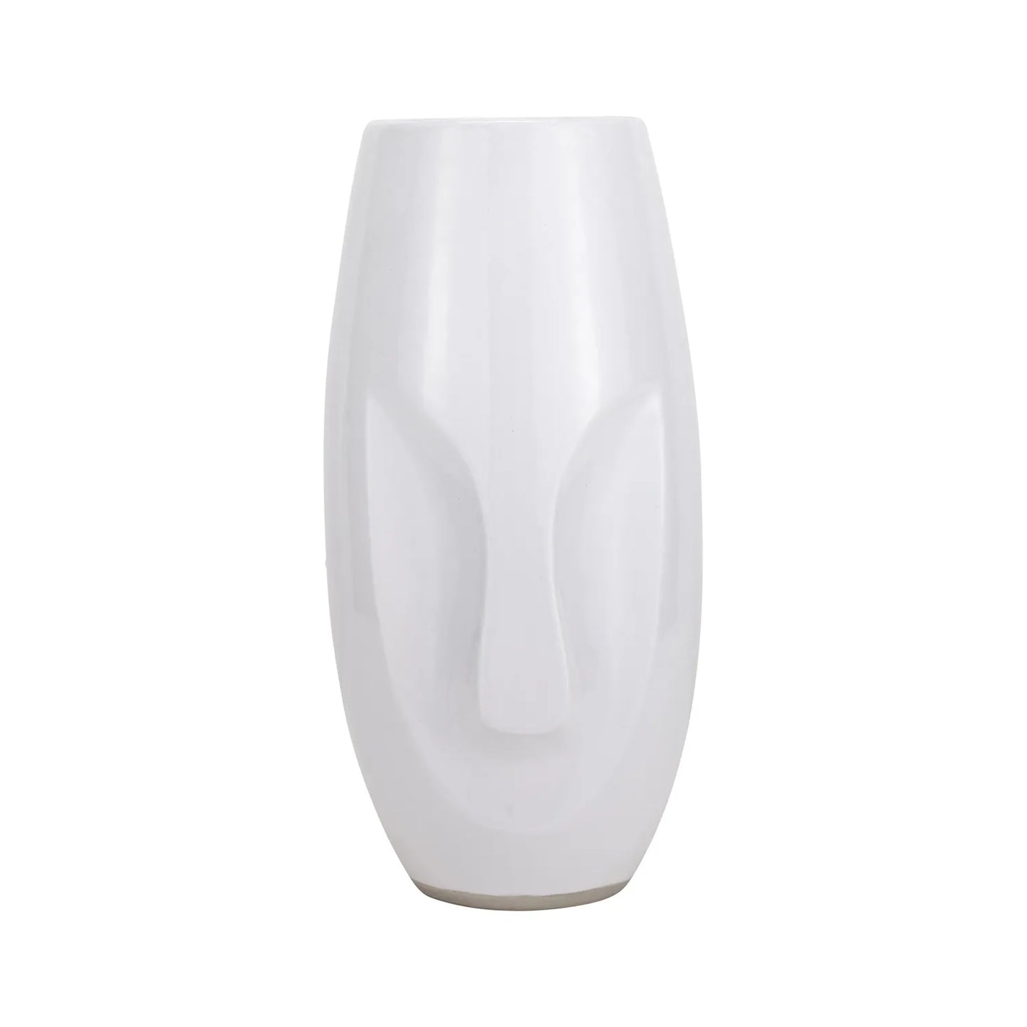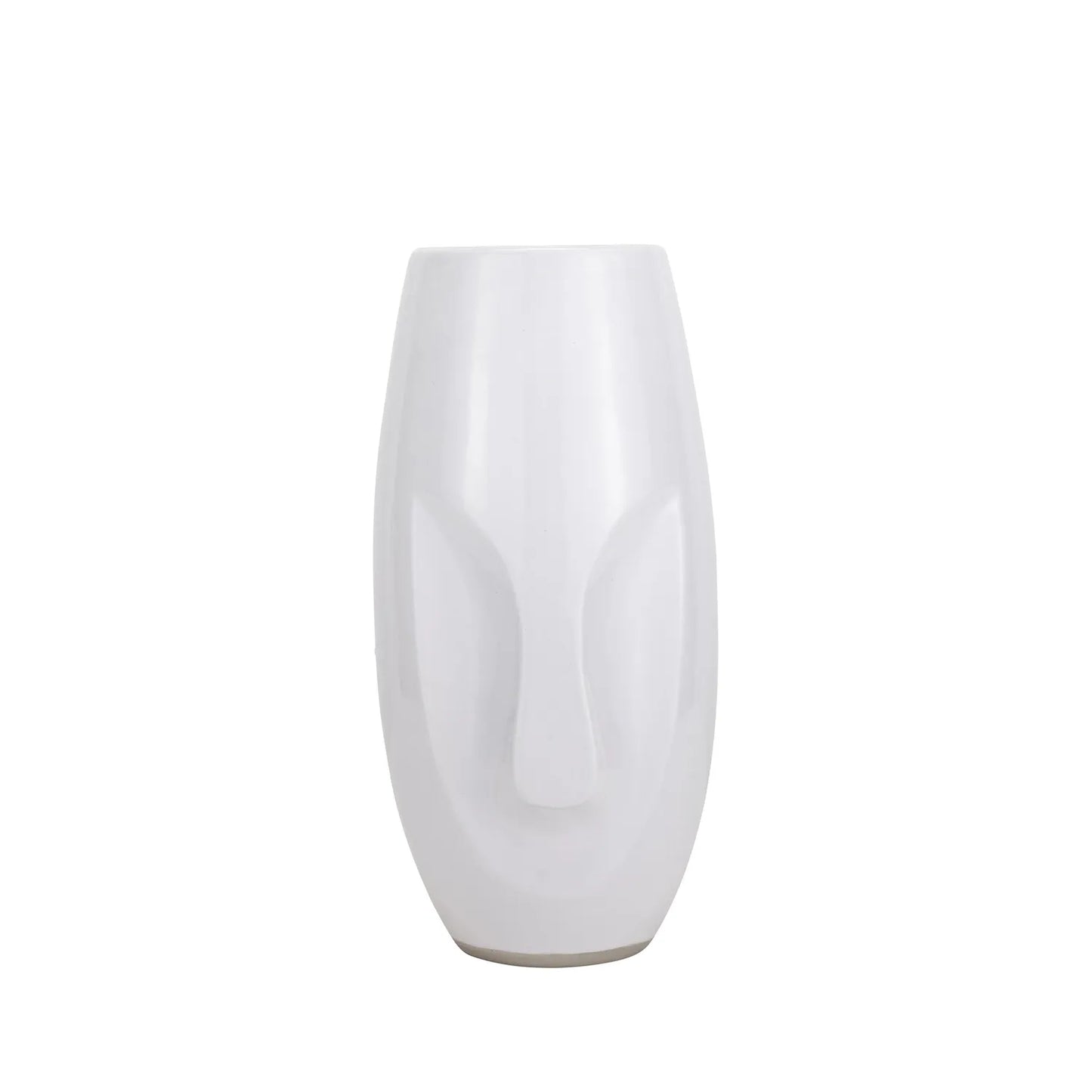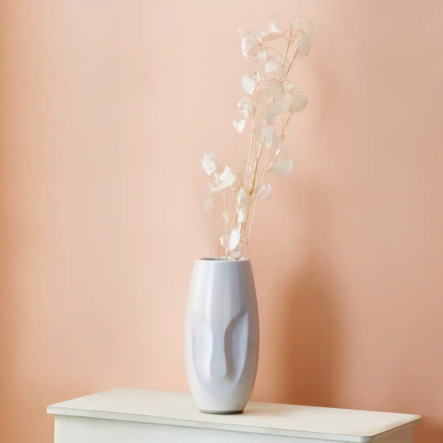 This white modernist ceramic vase, made from terracotta, boasts a striking abstract face design. It’s almost like having a moody teenager quietly judging you from the corner of the room! Standing at an impressive 31cm tall and measuring 15cm in both width and depth, this vase is ideal for both fresh blooms and artificial flowers, or simply as a standalone decorative piece. Its artistic design seamlessly fits into contemporary home decor, adding a touch of sophistication to your minimalist interiors. An unusual statement piece, this terracotta vase is perfect for adding a unique touch to your home.