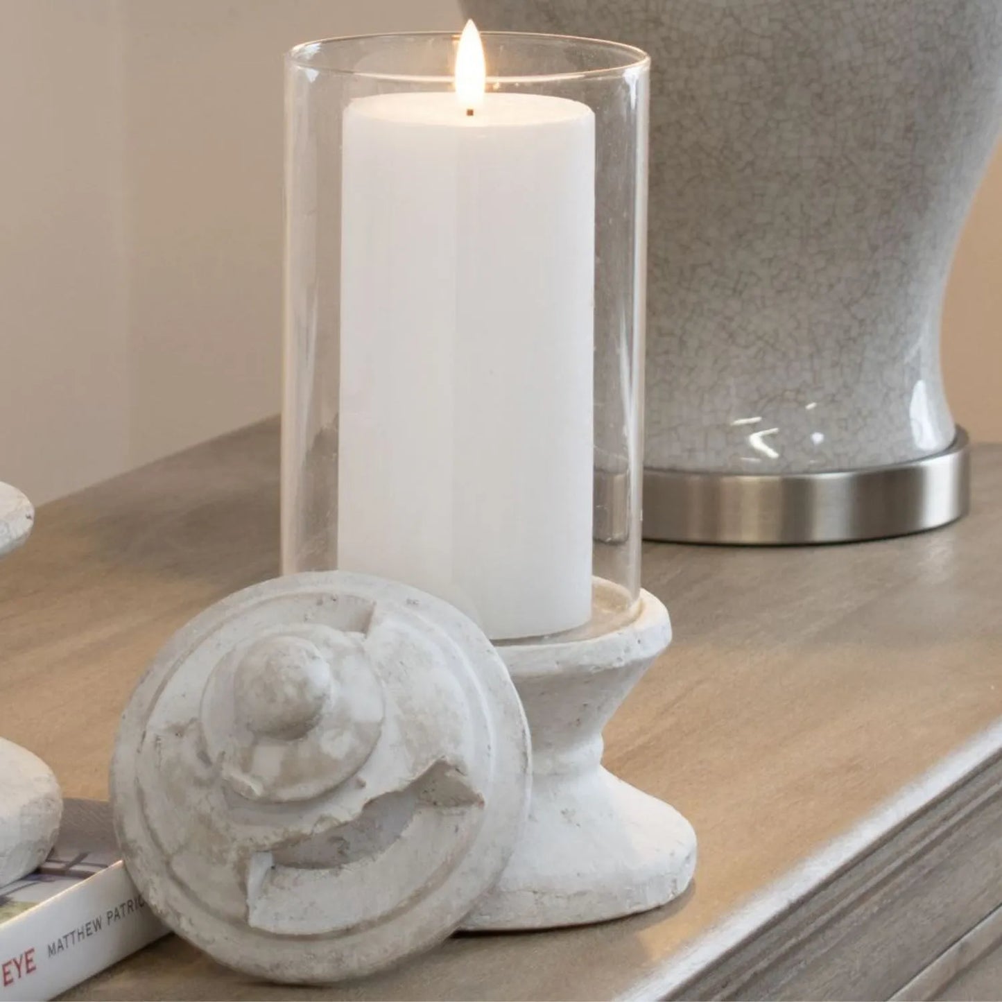 Add timeless style and sophistication to your home with this white stone hurricane candle holder with lid. This handcrafted decorative lantern blends classic elegance with modern practicality. Featuring a durable glass cylinder set within a beautifully textured stone base, it provides a secure and stylish way to display your LED pillar candles. The matching stone lid adds a unique decorative element, making this piece both functional and visually striking.